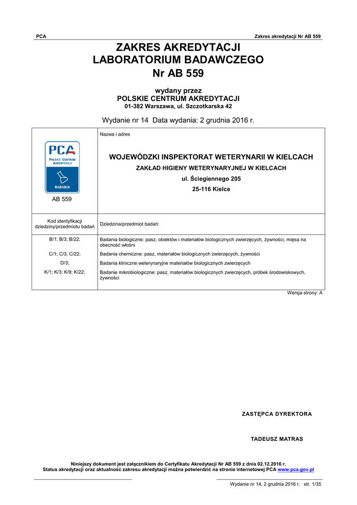 PCA Zakres akredytacji Nr AB 559 ZAKRES AKREDYTACJI LABORATORIUM BADAWCZEGO Nr AB 559 wydany przez POLSKIE CENTRUM AKREDYTACJI 01-382 Warszawa, ul. Szczotkarska 42 Wydanie nr 14 Data wydania: 2 grudnia 2016 r. Nazwa i adres WOJEWÓDZKI INSPEKTORAT WETERYNARII W KIELCACH ZAKŁAD HIGIENY WETERYNARYJNEJ W KIELCACH ul. Ściegiennego 205 25-116 Kielce AB 559 Kod identyfikacji dziedziny/przedmiotu badań Dziedzina/przedmiot badań: B/1; B/3; B/22; Badania biologiczne: pasz, obiektów i materiałów biologicznych zwierzęcych, żywności, mięsa na obecność włośni C/1; C/3; C/22; Badania chemiczne: pasz, materiałów biologicznych zwierzęcych, żywności D/3; K/1; K/3; K/9; K/22; Badania kliniczne weterynaryjne materiałów biologicznych zwierzęcych Badanie mikrobiologiczne: pasz, materiałów biologicznych zwierzęcych, próbek środowiskowych, żywności Wersja strony: A ZASTĘPCA DYREKTORA TADEUSZ MATRAS Niniejszy dokument jest załącznikiem do Certyfikatu Akredytacji Nr AB 559 z dnia 02.12.2016 r. Status akredytacji oraz aktualność zakresu akredytacji można potwierdzić na stronie internetowej PCA www.pca.gov.pl Wydanie nr 14, 2 grudnia 2016 r. str. 1/35 PCA Zakres akredytacji Nr AB 559 Przedmiot badań/wyrób Mięso i przetwory mięsne Pracownia Chemiczna (Pche) ul. Ściegiennego 205, 25-116 Kielce Rodzaj działalności/ badane cechy/ metoda Zawartość soli kuchennej Zakres: (0,10 – 7,0) % Metoda miareczkowa (Mohra) Zawartość tłuszczu wolnego Zakres: (0,30 – 60,0) % Metoda wagowa Zawartość azotu Zakres: (0,20 – 5,0) % Metoda miareczkowa (Kjeldahla) Białko z obliczeń Zawartość fosforu Zakres: (0,20 – 0,80) % Metoda wagowa Zawartość fosforanów dodanych z obliczeń Zawartość wody Zakres: (10,0 – 80,0) % Metoda wagowa Zawartość hydroksyproliny Zakres: (0,03 – 0,50) % Metoda spektrofotometryczna Zawartość kolagenu z obliczeń Zawartość tkanki łącznej z obliczeń Produkty mięsne wędzone Pasze Zawartość azotynów Zakres: azotyny NaNO2 (1,6 – 150) mg/kg Metoda spektrofotometryczna Zawartość azotanów z obliczeń Zawartość wielopierścieniowych węglowodorów aromatycznych (WWA) Zakres: benzo[a]piren (0,9 – 100) µg/kg benzo[a]antracen (0,9 – 100) µg/kg benzo[b]fluoranten (0,9 – 100) µg/kg chryzen (0,9 – 100) µg/kg Metoda chromatografii gazowej z detekcją spektrometrią mas (GC-MS) Zawartość sumy WWA z obliczeń Zawartość cukrów w przeliczeniu na sacharozę Zakres: (1,0 – 10,0) % Metoda miareczkowa (Luffa Schoorla) Wartość energetyczna z obliczeń Dokumenty odniesienia PN-73/A-82112+Az1:2002 PN-ISO 1444:2000 PN-75/A-04018+Az3:2002 PN-A-82060:1999 PN-ISO 1442:2000 PN-ISO 3496:2000 Rozporządzenie Ministra Rolnictwa i Rozwoju Wsi z 10 lipca 2007 r. §8.1 pkt 4 (Dz. U. 2007 Nr 137 poz.966) Rozporządzenie Ministra Rolnictwa i Rozwoju Wsi z 10 lipca 2007 r. §8.1 pkt 4 (Dz. U. 2007 Nr 137 poz.966) PB-22/Pche edycja 02 z dnia 09.05.2011 r. w oparciu o normę PN-74/A-82114 PB-28/Pche edycja 01 z dnia 06.05.2015 r. Rozporządzenie Komisji (WE) nr 152/2009 z dnia 27 stycznia 2009 r. Załącznik III J, (Dz. U. L. 54 z 26.02.2009) Rozporządzenie Komisji (WE) nr 152/2009 z dnia 27 stycznia 2009 r. Załącznik VII (Dz. U. L. 54 z 26.02.2009) Wersja strony: A Wydanie nr 14, 2 grudnia 2016 r. str. 2/35 PCA Zakres akredytacji Nr AB 559 Przedmiot badań/wyrób Pasze Rodzaj działalności/badane cechy/ metoda Zawartość azotu Zakres: (0,35 – 16,0) % Metoda miareczkowa (Kjeldahla) Białko surowe z obliczeń Zawartość wody Zakres: (1,0 – 70,0) % Metoda wagowa Zawartość chlorków rozpuszczalnych w wodzie Zakres: (0,10 – 7,0) % Metoda miareczkowa (Volharda) Zawartość tłuszczu surowego Zakres: (2,0 – 20,0) % Zawartość tłuszczu surowego po hydrolizie Zakres: (2,0 – 20,0) % Metoda wagowa Zawartość popiołu surowego Zakres: (1,0 – 70,0) % Metoda wagowa Zawartość włókna surowego Zakres: (1,0 – 15,0) % Metoda wagowa Zawartość skrobi Zakres: (4,0 – 70,0) % Metoda polarymetryczna Zawartość fosforu Zakres: (0,10 – 1,0) % Metoda wagowa Homogeniczność (stopień wymieszania) z obliczeń Zawartość melaminy Zakres: (0,50 – 3,8) μg/g Metoda chromatografii gazowej z detekcją spektrometrią mas (GC-MS) Zawartość triheptanianu glicerolu (GTH) Zakres: (75 – 625) mg/kg Metoda chromatografii gazowej z detekcją spektrometrią mas (GC-MS) Zawartość mocznika Zakres: (0,40 – 10,0) % Metoda spektrofotometryczna Dokumenty odniesienia Rozporządzenie Komisji (WE) nr 152/2009 z dnia 27 stycznia 2009 r. Załącznik III C, (Dz. U. L. 54 z 26.02.2009) Rozporządzenie Komisji (WE) nr 152/2009 z dnia 27 stycznia 2009 r. Załącznik III A z wyłączeniem metody obejmującej strategię punktu 4.2.3 (Dz. U. L. 54 z 26.02.2009) PB-14/Pche edycja 01 z dnia 06.12.2005 r. w oparciu o normę PN-81/R-64780 pkt.2.1. Rozporządzenie Komisji (WE) nr 152/2009 z dnia 27 stycznia 2009 r Załącznik III H, (Dz. U. L. 54 z 26.02.2009) Rozporządzenie Komisji (WE) nr 152/2009 z dnia 27 stycznia 2009 r. Załącznik III M, (Dz. U. L. 54 z 26.02.2009) Rozporządzenie Komisji (WE) nr 152/2009 z dnia 27 stycznia 2009 r. Załącznik III I, (Dz. U. L. 54 z 26.02.2009) Rozporządzenie Komisji (WE) nr 152/2009 z dnia 27 stycznia 2009 r. Załącznik III L, (Dz. U. L. 54 z 26.02.2009) PB-19/Pche edycja 01 z dnia 05.06.2006 r. PB-21/Pche edycja 01 z dnia 17.07.2006 r. w oparciu o Instrukcję GLW Nr GIWpuf.512lab.1/2005 z 9 listopada 2005 r. PB-26/Pche edycja 01 z dnia 21.07.2009 r. PB-27/Pche edycja 01 z dnia 18.05.2011 r. Rozporządzenie Komisji (WE) nr 152/2009 z dnia 27 stycznia 2009 r. Załącznik III D, (Dz. U. L. 54 z 26.02.2009) Wersja strony: A Wydanie nr 14, 2 grudnia 2016 r. str. 3/35 PCA Zakres akredytacji Nr AB 559 Przedmiot badań/wyrób Tłuszcze paszowe pochodzenia zwierzęcego i roślinnego Rodzaj działalności/badane cechy/ metoda Zawartość nierozpuszczalnych zanieczyszczeń stałych Zakres: (0,010 – 2,5) % Metoda wagowa Dokument