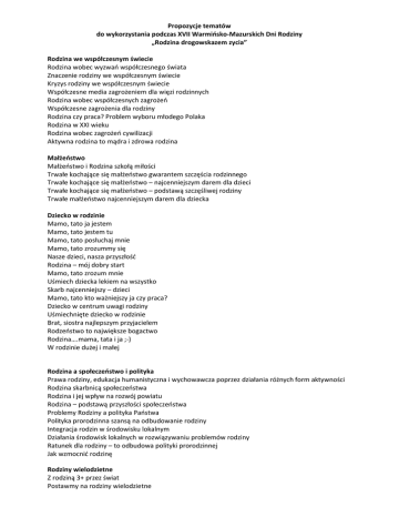 Propozycje tematów do wykorzystania podczas XVII Warmińsko-Mazurskich Dni Rodziny „Rodzina drogowskazem zycia” Rodzina we współczesnym świecie Rodzina wobec wyzwań współczesnego świata Znaczenie rodziny we współczesnym świecie Kryzys rodziny we współczesnym świecie Współczesne media zagrożeniem dla więzi rodzinnych Rodzina wobec współczesnych zagrożeń Współczesne zagrożenia dla rodziny Rodzina czy praca? Problem wyboru młodego Polaka Rodzina w XXI wieku Rodzina wobec zagrożeń cywilizacji Aktywna rodzina to mądra i zdrowa rodzina Małżeństwo Małżeństwo i Rodzina szkołą miłości Trwałe kochające się małżeństwo gwarantem szczęścia rodzinnego Trwałe kochające się małżeństwo – najcenniejszym darem dla dzieci Trwałe kochające się małżeństwo – podstawą szczęśliwej rodziny Trwałe małżeństwo najcenniejszym darem dla dziecka Dziecko w rodzinie Mamo, tato ja jestem Mamo, tato jestem tu Mamo, tato posłuchaj mnie Mamo, tato zrozummy się Nasze dzieci, nasza przyszłość Rodzina – mój dobry start Mamo, tato zrozum mnie Uśmiech dziecka lekiem na wszystko Skarb najcenniejszy – dzieci Mamo, tato kto ważniejszy ja czy praca? Dziecko w centrum uwagi rodziny Uśmiechnięte dziecko w rodzinie Brat, siostra najlepszym przyjacielem Rodzeństwo to największe bogactwo Rodzina….mama, tata i ja ;-) W rodzinie dużej i małej Rodzina a społeczeństwo i polityka Prawa rodziny, edukacja humanistyczna i wychowawcza poprzez działania różnych form aktywności Rodzina skarbnicą społeczeństwa Rodzina i jej wpływ na rozwój powiatu Rodzina – podstawą przyszłości społeczeństwa Problemy Rodziny a polityka Państwa Polityka prorodzinna szansą na odbudowanie rodziny Integracja rodzin w środowisku lokalnym Działania środowisk lokalnych w rozwiązywaniu problemów rodziny Ratunek dla rodziny – to odbudowa polityki prorodzinnej Jak wzmocnić rodzinę Rodziny wielodzietne Z rodziną 3+ przez świat Postawmy na rodziny wielodzietne Duża rodzina bogactwem przyszłości Mamo, tato co ty na to? Postawmy na rodzine wielodzietne Duża Rodzina łączy, uczy, wspiera Im nas więcej tym weselej – postaw na rodzinę wielodzietną Rodzina a wartości Rodzina podstawowym źródłem wartości przekazywanych dziecku Rodzina fundamentem wartości Rodzina fundamentem wychowania i kultywowania tradycji Rodzina fundamentem życia Rodzina to poszanowanie praw mądrości Mój dom podstawa zdrowej rodziny Rodzina a uczucia, więzi W rodzinie jest siła Rodzina największe dobro Rodzina pełna miłości i radości Rodzina źródłem radości Poczucie więzi a relacje rodzinne Radosna rodzina Rodzina to przykład miłości Rodzina to miłość Jedyną miarą rodziny jest miłość bez miary Czym jest rodzina? Rodzina jest miłością W rodzinie nikt nie ginie Z rodziną bezpiecznie Przemoc w rodzinie Rodzina wolna od przemocy Stop przemocy w rodzinie Osoby starsze w rodzinie Seniorzy naszym skarbem Rodzina drogowskazem życia Rodzina łączy, uczy, wspiera Zainwestuj czas w rodzinę szczęście w życiu Cię nie minie Rodziny uczymy się przez całe życie Z rodziną zawsze wszystko się uda Rodzina na dobre i na złe Z rodziną przez świat