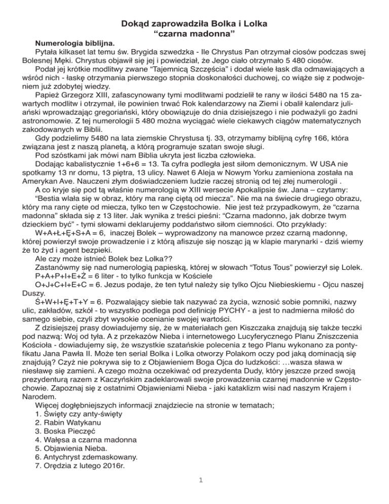 Dokąd zaprowadziła Bolka i Lolka “czarna madonna” Numerologia biblijna. Pytała kilkaset lat temu św. Brygida szwedzka - Ile Chrystus Pan otrzymał ciosów podczas swej Bolesnej Męki. Chrystus objawił się jej i powiedział, że Jego ciało otrzymało 5 480 ciosów. Podał jej krótkie modlitwy zwane “Tajemnicą Szczęścia” i dodał wiele łask dla odmawiających a wśród nich - łaskę otrzymania pierwszego stopnia doskonałości duchowej, co wiąże się z podwojeniem już zdobytej wiedzy. Papież Grzegorz XIII, zafascynowany tymi modlitwami podzielił te rany w ilości 5480 na 15 zawartych modlitw i otrzymał, ile powinien trwać Rok kalendarzowy na Ziemi i obalił kalendarz juliański wprowadzając gregoriański, który obowiązuje do dnia dzisiejszego i nie podważyli go żadni astronomowie. Z tej numerologii 5 480 można wyciągać wiele ciekawych ciągów matematycznych zakodowanych w Biblii. Gdy podzielimy 5480 na lata ziemskie Chrystusa tj. 33, otrzymamy biblijną cyfrę 166, która związana jest z naszą planetą, a którą programuje szatan swoje sługi. Pod szóstkami jak mówi nam Biblia ukryta jest liczba człowieka. Dodając kabalistycznie 1+6+6 = 13. Ta cyfra podległa jest siłom demonicznym. W USA nie spotkamy 13 nr domu, 13 piętra, 13 ulicy. Nawet 6 Aleja w Nowym Yorku zamieniona została na Amerykan Ave. Nauczeni złym doświadczeniem ludzie raczej stronią od tej złej numerologii . A co kryje się pod tą właśnie numerologią w XIII wersecie Apokalipsie św. Jana – czytamy: “Bestia wlała się w obraz, który ma ranę ciętą od miecza”. Nie ma na świecie drugiego obrazu, który ma rany cięte od miecza, tylko ten w Częstochowie. Nie jest też przypadkowym, że “czarna madonna” składa się z 13 liter. Jak wynika z treści pieśni: “Czarna madonno, jak dobrze twym dzieckiem być” - tymi słowami deklarujemy poddaństwo siłom ciemności. Oto przykłady: W+A+Ł+Ę+S+A = 6, inaczej Bolek – wyprowadzony na manowce przez czarną madonnę, której powierzył swoje prowadzenie i z którą afiszuje się nosząc ją w klapie marynarki - dziś wiemy że to żyd i agent bezpieki. Ale czy może istnieć Bolek bez Lolka?? Zastanówmy się nad numerologią papieską, której w słowach “Totus Tous” powierzył się Lolek. P+A+P+I+E+Ż = 6 liter - to tylko funkcja w Kościele O+J+C+I+E+C = 6. Jezus podaje, że ten tytuł należy się tylko Ojcu Niebieskiemu - Ojcu naszej Duszy. Ś+W+I+Ę+T+Y = 6. Pozwalający siebie tak nazywać za życia, wznosić sobie pomniki, nazwy ulic, zakładów, szkół - to wszystko podlega pod definicję PYCHY - a jest to nadmierna miłość do samego siebie, czyli zbyt wysokie ocenianie swojej wartości. Z dzisiejszej prasy dowiadujemy się, że w materiałach gen Kiszczaka znajdują się także teczki pod nazwą: Woj od tyła. A z przekazów Nieba i internetowego Lucyferycznego Planu Zniszczenia Kościoła - dowiadujemy się, że wszystkie szatańskie polecenia z tego Planu wykonano za pontyfikatu Jana Pawła II. Może ten serial Bolka i Lolka otworzy Polakom oczy pod jaką dominacją się znajdują? Czyż nie pokrywa się to z Objawieniem Boga Ojca do ludzkości: …wasza sława w niesławę się zamieni. A czego można oczekiwać od prezydenta Dudy, który jeszcze przed swoją prezydenturą razem z Kaczyńskim zadeklarowali swoje prowadzenia czarnej madonnie w Częstochowie. Zapoznaj się z ostatnimi Objawieniami Nieba - jaki kataklizm wisi nad naszym Krajem i Narodem. Więcej dogłębniejszych informacji znajdziecie na stronie w tematach; 1. Święty czy anty-święty 2. Rabin Watykanu 3. Boska Pieczęć 4. Wałęsa a czarna madonna 5. Objawienia Nieba. 6. Antychryst zdemaskowany. 7. Orędzia z lutego 2016r. 1