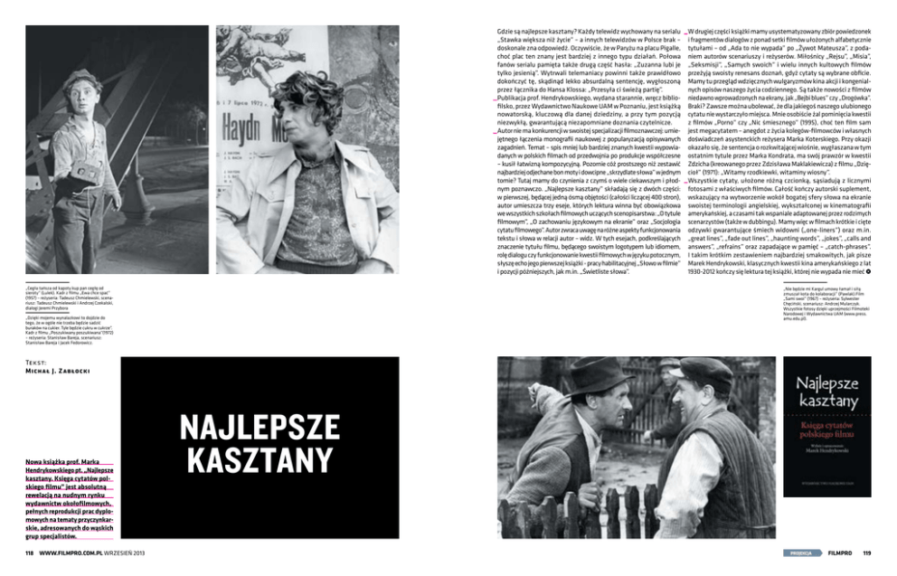 Gdzie są najlepsze kasztany? Każdy telewidz wychowany na serialu „Stawka większa niż życie” – a innych telewidzów w Polsce brak – doskonale zna odpowiedź. Oczywiście, że w Paryżu na placu Pigalle, choć plac ten znany jest bardziej z innego typu działań. Połowa fanów serialu pamięta także drugą część hasła: „Zuzanna lubi je tylko jesienią”. Wytrwali telemaniacy powinni także prawidłowo dokończyć tę, skądinąd lekko absurdalną sentencję, wygłoszoną przez łącznika do Hansa Klossa: „Przesyła ci świeżą partię”. Publikacja prof. Hendrykowskiego, wydana starannie, wręcz bibliofilsko, przez Wydawnictwo Naukowe UAM w Poznaniu, jest książką nowatorską, kluczową dla danej dziedziny, a przy tym pozycją niezwykłą, gwarantującą niezapomniane doznania czytelnicze. Autor nie ma konkurencji w swoistej specjalizacji filmoznawczej: umiejętnego łączenia monografii naukowej z popularyzacją opisywanych zagadnień. Temat – spis mniej lub bardziej znanych kwestii wypowiadanych w polskich filmach od przedwojnia po produkcje współczesne – kusił łatwizną kompozycyjną. Pozornie cóż prostszego niż zestawić najbardziej odjechane bon moty i dowcipne „skrzydlate słowa” w jednym tomie? Tutaj mamy do czynienia z czymś o wiele ciekawszym i płodnym poznawczo. „Najlepsze kasztany” składają się z dwóch części: w pierwszej, będącej jedną ósmą objętości (całości liczącej 400 stron), autor umieszcza trzy eseje, których lektura winna być obowiązkowa we wszystkich szkołach filmowych uczących scenopisarstwa: „O tytule filmowym”, „O zachowaniu językowym na ekranie” oraz „Socjologia cytatu filmowego”. Autor zwraca uwagę na różne aspekty funkcjonowania tekstu i słowa w relacji autor – widz. W tych esejach, podkreślających znaczenie tytułu filmu, będącego swoistym logotypem lub idiomem, rolę dialogu czy funkcjonowanie kwestii filmowych w języku potocznym, słyszę echo jego pierwszej książki - pracy habilitacyjnej „Słowo w filmie” i pozycji późniejszych, jak m.in. „Świetliste słowa”. „Cegła tańsza od kapoty kup pan cegłę od sieroty” (Lulek). Kadr z filmu „Ewa chce spać” (1957) – reżyseria: Tadeusz Chmielewski, scenariusz: Tadeusz Chmielewski i Andrzej Czekalski, dialogi Jeremi Przybora W drugiej części książki mamy usystematyzowany zbiór powiedzonek i fragmentów dialogów z ponad setki filmów ułożonych alfabetycznie tytułami – od „Ada to nie wypada” po „Żywot Mateusza”, z podaniem autorów scenariuszy i reżyserów. Miłośnicy „Rejsu”, „Misia”, „Seksmisji”, „Samych swoich” i wielu innych kultowych filmów przeżyją swoisty renesans doznań, gdyż cytaty są wybrane obficie. Mamy tu przegląd wdzięcznych wulgaryzmów kina akcji i kongenialnych opisów naszego życia codziennego. Są także nowości z filmów niedawno wprowadzonych na ekrany, jak „Bejbi blues” czy „Drogówka”. Braki? Zawsze można ubolewać, że dla jakiegoś naszego ulubionego cytatu nie wystarczyło miejsca. Mnie osobiście żal pominięcia kwestii z filmów „Porno” czy „Nic śmiesznego” (1995), choć ten film sam jest megacytatem – anegdot z życia kolegów-filmowców i własnych doświadczeń asystenckich reżysera Marka Koterskiego. Przy okazji okazało się, że sentencja o rozkwitającej wiośnie, wygłaszana w tym ostatnim tytule przez Marka Kondrata, ma swój prawzór w kwestii Zdzicha (kreowanego przez Zdzisława Maklakiewicza) z filmu „Dzięcioł” (1971): „Witamy rzodkiewki, witaminy wiosny”. Wszystkie cytaty, ułożone różną czcionką, sąsiadują z licznymi fotosami z właściwych filmów. Całość kończy autorski suplement, wskazujący na wytworzenie wokół bogatej sfery słowa na ekranie swoistej terminologii angielskiej, wykształconej w kinematografii amerykańskiej, a czasami tak wspaniale adaptowanej przez rodzimych scenarzystów (także w dubbingu). Mamy więc w filmach krótkie i cięte odzywki gwarantujące śmiech widowni („one-liners”) oraz m.in. „great lines”, „fade out lines”, „haunting words”, „jokes”, „calls and answers”, „refrains” oraz zapadające w pamięć – „catch-phrases”. I takim krótkim zestawieniem najbardziej smakowitych, jak pisze Marek Hendrykowski, klasycznych kwestii kina amerykańskiego z lat 1930-2012 kończy się lektura tej książki, której nie wypada nie mieć • „Nie będzie mi Kargul umowy łamał i siłą zmuszał kota do kolaboracji” (Pawlak).Film „Sami swoi” (1967) – reżyseria: Sylwester Chęciński, scenariusz: Andrzej Mularczyk. Wszystkie fotosy dzięki uprzejmości Filmoteki Narodowej i Wydawnictwa UAM (www.press. amu.edu.pl). „Dzięki mojemu wynalazkowi to dojdzie do tego, że w ogóle nie trzeba będzie sadzić buraków na cukier. Tyle będzie cukru w cukrze”. Kadr z filmu „Poszukiwany poszukiwana”(1972) – reżyseria: Stanisław Bareja, scenariusz: Stanisław Bareja i Jacek Fedorowicz. Tekst: Michał J. Zabłocki Nowa książka prof. Marka Hendrykowskiego pt. „Najlepsze kasztany. Księga cytatów polskiego filmu” jest absolutną rewelacją na nudnym rynku wydawnictw okołofilmowych, pełnych reprodukcji prac dyplomowych na tematy przyczynkarskie, adresowanych do wąskich grup specjalistów. 118 WWW.FILMPRO.COM.PL WRZESIEŃ 2013 NAJLEPSZE kasztany PROJEKCJA FILMPRO 119