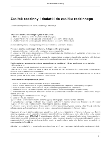 BIP M-GOPS Prabuty Zasiłek rodzinny i dodatki do zasiłku rodzinnego Zasiłek rodzinny i dodatki do zasiłku rodzinnego: informacje Wysokość zasiłku rodzinnego wynosi miesięcznie: 1) 89,00 zł na dziecko w wieku do ukończenia 5 roku życia; 2) 118,00 zł na dziecko w wieku powyżej 5 roku życia do ukończenia 18 roku życia; 3) 129,00 zł na dziecko w wieku powyżej 18 roku życia do ukończenia 24 roku życia. Zasiłek rodzinny ma na celu częściowe pokrycie wydatków na utrzymanie dziecka. Prawo do zasiłku rodzinnego i dodatków do tego zasiłku przysługuje: 1) rodzicom, jednemu z rodziców albo opiekunowi prawnemu dziecka; 2) opiekunowi faktycznemu dziecka (osoba faktycznie opiekującą się dzieckiem, jeżeli wystąpiła z wnioskiem do sądu rodzinnego o przysposobienie dziecka); 3) osobie uczącej się (osoba pełnoletnia ucząca się, niepozostająca na utrzymaniu rodziców w związku z ich śmiercią lub w związku z ustaleniem wyrokiem sądowym lub ugodą sądową prawa do alimentów z ich strony). Zasiłek rodzinny przysługuje osobom wymienionym w punktach 1 i 2, do ukończenia przez dziecko: - 18 roku życia lub - nauki w szkole, jednak nie dłużej niż do ukończenia 21 roku życia, albo - 24 roku życia, jeżeli kontynuuje naukę w szkole lub w szkole wyższej i legitymuje się orzeczeniem o umiarkowanym albo znacznym stopniu niepełnosprawności. Osobie wymienionej w punkcie 3, zasiłek przysługuje pod warunkiem kontynuowania nauki w szkole lub w szkole wyższej, jednak nie dłużej niż do ukończenia 24 roku życia. Zasiłek rodzinny nie przysługuje, jeżeli: 1) dziecko lub osoba ucząca się pozostają w związku małżeńskim; 2) dziecko zostało umieszczone w instytucji zapewniającej całodobowe utrzymanie albo w pieczy zastępczej; 3) osoba ucząca się została umieszczona w instytucji zapewniającej całodobowe utrzymanie; 4) pełnoletnie dziecko lub osoba ucząca się jest uprawniona do zasiłku rodzinnego na własne dziecko; 5) osobie samotnie wychowującej dziecko nie zostało zasądzone świadczenie alimentacyjne na rzecz dziecka od jego rodzica, chyba że: a) rodzice lub jedno z rodziców dziecka nie żyje, b) ojciec dziecka jest nieznany, c) powództwo o ustalenie świadczenia alimentacyjnego od drugiego z rodziców zostało oddalone, d) sąd zobowiązał jednego z rodziców do ponoszenia całkowitych kosztów utrzymania dziecka i nie zobowiązał drugiego z rodziców do świadczenia alimentacyjnego na rzecz tego dziecka; 6) członkowi rodziny przysługuje na dziecko zasiłek rodzinny za granicą, chyba że przepisy o koordynacji systemów zabezpieczenia społecznego lub dwustronne umowy o zabezpieczeniu społecznym stanowią inaczej. Przyznanie prawa do zasiłku rodzinnego uzależnione jest m.in. od spełnienia kryterium dochodowego. Zasiłek rodzinny przysługuje, jeżeli przeciętny miesięczny dochód rodziny w przeliczeniu na osobę albo dochód osoby uczącej się nie przekracza kwoty 674,00 zł. W przypadku gdy członkiem rodziny jest dziecko legitymujące się orzeczeniem o niepełnosprawności lub orzeczeniem o umiarkowanym albo o znacznym stopniu niepełnosprawności, zasiłek rodzinny przysługuje, jeżeli przeciętny miesięczny dochód rodziny w przeliczeniu na osobę albo dochód osoby uczącej się nie przekracza kwoty 764,00 zł. Od dnia 1 stycznia 2016 r. obowiązuje nowe brzmienie art. 5 ust. 3 ustawy o świadczeniach rodzinnych, który 1 BIP M-GOPS Prabuty wprowadza nowy sposób ustalania wysokości przysługujących zasiłków rodzinnych wraz z dodatkami w przypadku przekroczenia kryterium dochodowego uprawniającego do zasiłku rodzinnego (tzw. mechanizm złotówka za złotówkę). Zgodnie z art. 3 ust. 3 ustawy w przypadku gdy dochód rodziny w przeliczeniu na osobę w rodzinie lub dochód osoby uczącej się przekracza kwotę uprawniającą daną rodzinę lub osobę uczącą się do zasiłku rodzinnego pomnożoną przez liczbę członków danej rodziny o kwotę nie wyższą niż łączna kwota zasiłków rodzinnych wraz z dodatkami przysługujących danej rodzinie w okresie zasiłkowym, na który jest ustalane prawo do tych świadczeń, zasiłek rodzinny wraz z dodatkami przysługują w wysokości różnicy między łączną kwotą zasiłków rodzinnych wraz z dodatkami, a kwotą, o którą został przekroczony dochód rodziny. Łączną kwotę zasiłków rodzinnych wraz z dodatkami, o której mowa w zdaniu poprzednim, stanowi suma przysługujących danej rodzinie w danym okresie zasiłkowym: 1) zasiłków rodzinnych podzielonych przez liczbę miesięcy, na które danej rodzinie jest ustalane prawo do tych zasiłków; 2) dodatków do zasiłku rodzinnego z tytułu: opieki nad dzieckiem w okresie korzystania z urlopu wychowawczego, samotnego wychowywania dziecka, wychowywania dziecka w rodzinie wielodzietnej, kształcenia i rehabilitacji dziecka -podzielonych przez liczbę miesięcy, na które danej rodzinie jest ustalane prawo do tych dodatków; 3) dodatków do zasiłku rodzinnego z tytułu: urodzenia dziecka, rozpoczęcia roku szkolnego, podjęcia przez dziecko nauki w szkole poza miejscem zamieszkania - podzielonych przez 12. W przypadku gdy wysokość zasiłków rodzinnych wraz z dodatkami przysługująca danej rodzinie, ustalona zgodnie z powyższym mechanizmem, jest niższa niż 20,00 zł, świadczenia te nie przysługują (art. 5 ust. 3-3d ustawy). Obecnie można ubiegać się o następujące dodatki do zasiłku rodzinnego: Dodatek z tytułu urodzenia dziecka Dodatek do zasiłku rodzinnego z tytułu urodzenia dziecka przysługuje jednorazowo w wysokości 1000 zł. Dodatek z tytułu urodzenia dziecka przysługuje: 1) matce lub ojcu albo opiekunowi prawnemu dziecka; 2) opiekunowi faktycznemu dziecka w wieku do ukończenia przez dziecko pierwszego roku życia, jeżeli nie został przyznany rodzicom lub opiekunowi prawnemu dziecka. W przypadku wystąpienia o przysposobienie więcej niż jednego dziecka lub urodzenia więce