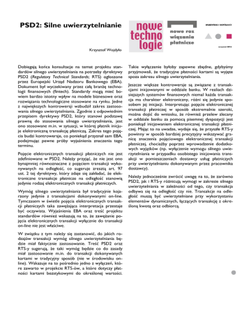 PSD2: Silne uwierzytelnianie Krzysztof Wojdyło Dobiegają końca konsultacje na temat projektu standardów silnego uwierzytelniania na potrzeby dyrektywy PSD2 (Regulatory Technical Standards; RTS) ogłoszone przez Europejski Urząd Nadzoru Bankowego (EBA). Dokument był wyczekiwany przez całą branżę technologii finansowych (fintech). Standardy mogą mieć bowiem bardzo istotny wpływ na modele biznesowe oraz rozwiązania technologiczne stosowane na rynku. Jedne z największych kontrowersji wzbudził zakres zastosowania silnego uwierzytelniania. Zgodnie z odpowiednim przepisem dyrektywy PSD2, który stanowi podstawę prawną do stosowania silnego uwierzytelniania, jest ono stosowane m.in. w sytuacji, w której płatnik inicjuje elektroniczną transakcję płatniczą. Zakres tego pojęcia budzi kontrowersje, co poniekąd przyznał sam EBA, podejmując pewne próby wyjaśnienia znaczenia tego terminu. Pojęcie elektronicznych transakcji płatniczych nie jest zdefiniowane w PSD2. Należy przyjąć, że nie jest ono bynajmniej równoznaczne z pojęciem transakcji wykonywanych na odległość, co sugeruje zresztą art. 97 ust. 2 tej dyrektywy, który zdaje się zakładać, że elektroniczne transakcje płatnicze na odległość stanowią jedynie rodzaj elektronicznych transakcji płatniczych. Wymóg silnego uwierzytelniania był tradycyjnie kojarzony jedynie z transakcjami dokonywanymi on-line. Tymczasem w świetle pojęcia elektronicznych transakcji płatniczych taka zawężająca interpretacja przestaje być oczywista. Wyjaśnienia EBA oraz treść projektu standardów również wskazują na to, że zawężanie pojęcia elektronicznych transakcji wyłącznie do transakcji on-line nie jest właściwe. W związku z tym należy się zastanowić, do jakich rodzajów transakcji wymóg silnego uwierzytelniania będzie miał faktycznie zastosowanie. Treść PSD2 oraz RTS-y sugerują, że taki wymóg będzie co do zasady miał zastosowanie m.in. do transakcji dokonywanych kartami w tradycyjny sposób (nie w środowisku online). Wskazuje na to pośrednio jedno z wyłączeń, które zawarto w projekcie RTS-ów, a które dotyczy płatności kartami bezstykowymi do określonej wartości. Takie wyłączenie byłoby zapewne zbędne, gdybyśmy przyjmowali, że tradycyjne płatności kartami są wyjęte spoza zakresu silnego uwierzytelniania. Jeszcze większe kontrowersje są związane z transakcjami inicjowanymi w oddziale banku. W realiach dzisiejszych systemów finansowych niemal każda transakcja ma charakter elektroniczny, różni się jedynie sposobem jej inicjacji. Interpretując pojęcie elektronicznej transakcji płatniczej w sposób ekstremalnie szeroki, można dojść do wniosku, że również przelew zlecany w oddziale banku za pomocą pisemnej dyspozycji jest poniekąd inicjowaniem elektronicznej transakcji płatniczej. Mając to na uwadze, wydaje się, że przyszłe RTS-y powinny w sposób bardziej precyzyjny wskazywać granicę znaczenia pojęciowego elektronicznej transakcji płatniczej, chociażby poprzez wprowadzenie dodatkowych wyjątków (np. wyłączenie wymogu silnego uwierzytelniania w przypadku osobistego inicjowania transakcji w pomieszczeniach dostawcy usług płatniczych przy uwierzytelnianiu dokonywanym przez pracownika dostawcy). Należy jednocześnie zwrócić uwagę na to, że zarówno PSD2, jak i RTS-y różnicują wymogi w zakresie silnego uwierzytelniania w zależności od tego, czy transakcja odbywa się na odległość czy nie. Transakcje na odległość muszą być uwierzytelniane przy wykorzystaniu elementów dynamicznych, łączących transakcję z określoną kwotą oraz odbiorcą.