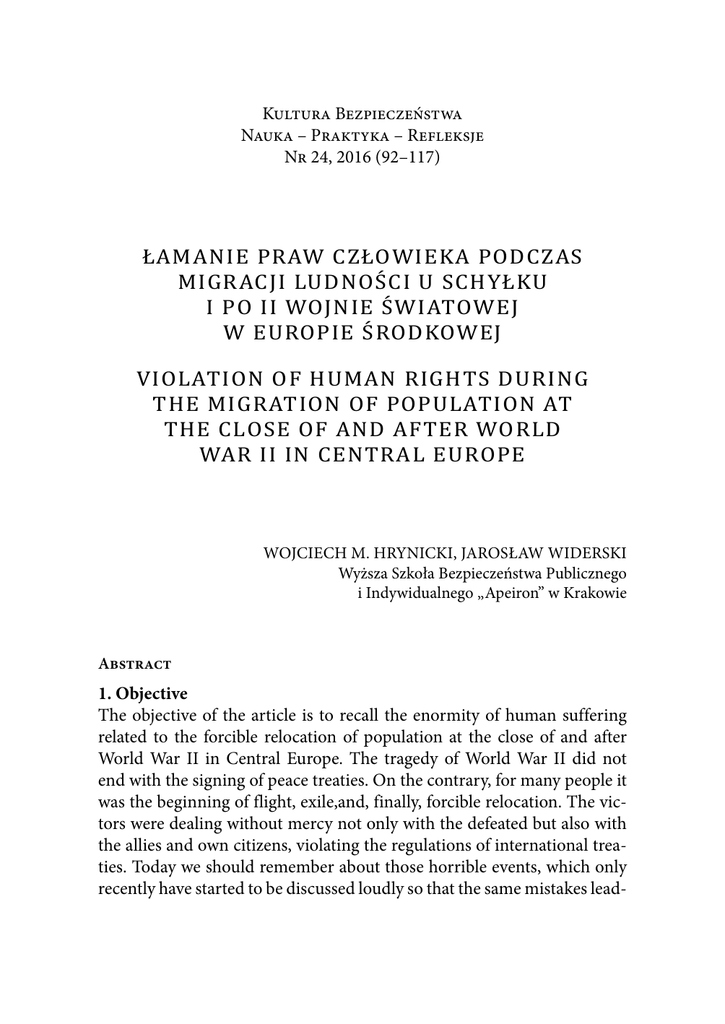 Kultura Bezpieczeństwa Nauka – Praktyka – Refleksje Nr 24, 2016 (92–117) ŁAMANIE PRAW CZŁOWIEKA PODCZAS MIGRACJI LUDNOŚCI U SCHYŁKU I PO II WOJNIE ŚWIATOWEJ W EUROPIE ŚRODKOWEJ VIOLATION OF HUMAN RIGHTS DURING THE MIGRATION OF POPULATION AT THE CLOSE OF AND AFTER WORLD WAR II IN CENTRAL EUROPE Wojciech M. Hrynicki, Jarosław Widerski Wyższa Szkoła Bezpieczeństwa Publicznego i Indywidualnego „Apeiron” w Krakowie Abstract 1. Objective The objective of the article is to recall the enormity of human suffering related to the forcible relocation of population at the close of and after World War II in Central Europe. The tragedy of World War II did not end with the signing of peace treaties. On the contrary, for many people it was the beginning of flight, exile,and, finally, forcible relocation. The victors were dealing without mercy not only with the defeated but also with the allies and own citizens, violating the regulations of international treaties. Today we should remember about those horrible events, which only recently have started to be discussed loudly so that the same mistakes lead- ŁAMANIE PRAW CZŁOWIEKA PODCZAS MIGRACJI LUDNOŚCI… • 93 ing to the suffering and death of many human beings are not made in the future. 2. Introduction The great conferences which crowned World War II (Tehran, Yalta, Potsdam) as well as the Atlantic Charter and the Charter of the United Nations pulled the world, and Europe in particular, our of the nightmare of destruction and death, and, all the same, they also served as a guarantee that the spoils of war would be divided between the victors. However, the above-mentioned treaties did not divide only territories but, particularly, people, giving rise to the tragedy of flight, exile and forcible relocation. The tragedies took place especially in Central Europe and they affected both the invaders and the victims. The victims sometimes turned into invaders, and the invaders into victims. The atrocities of flight, exile and forcible relocation were suffered by Jews, for whom World War II constituted the greatest tragedy ever, as well as by the Poles, Germans, Hungarians, Ukrainians, Belarussians, Czechs, Slovaks, Lithuanians, Russians and representatives of other nations. The beautiful slogans of the Atlantic Charter and the Charter of the United Nations became for those fleeing, exiled and forcibly relocated only empty watchwords, of which most of them did not even hear during the tragedy. 3. Methodology The authors identify the enormity of flight, exile and forcible relocation of people at the close of and after World War II, and try to raise the awareness of the need to remember about it and draw conclusions for the future. The adopted comparative historical method allows for direct needs analysis concerning the guarantee of basic human needs in the face of the horrors of war and actions taken directly after the war. 4. Conclusions The authors prove that, irrespective of victory in a war, securing people against national or ethnic persecution when the war has come to an end should be a matter of overriding importance for the victors. The victory does not entitle the victors to treat people like objects, even if they also were accomplices to the tragedy of war. Great wars are fought between states, particularly between the biggest ones, and it is the unarmed, in- 94 • Wojciech M. Hrynicki, Jarosław Widerski nocent people who suffer, even though they are not responsible for their outbreak and all the harm. The experience of World War II should make people aware of the threat of suffering and death in the face of post-war division of territorial spoils. Keywords: human rights, World War II, flight, exile, forcible relocation Abstrakt 1. Cel Celem artykułu jest przypomnienie ogromu cierpienia ludzkiego związanego z przymusowym przesiedlaniem ludności u schyłku i po II wojnie światowej w Europie Środkowej. Tragedia II wojny światowej nie zakończyła się wraz z podpisaniem traktatów pokojowych. Przeciwnie, dla wielu rozpoczął się czas ucieczek, wypędzeń, czy w końcu przymusowych wysiedleń. Zwycięzcy bez pardonu obchodzili się nie tylko z przegranymi, ale również ze sprzymierzeńcami, jak i własnymi obywatelami, łamiąc postanowienia traktatów międzynarodowych. Dziś należy pamiętać o tych strasznych wydarzeniach, o których dopiero od niedawna zaczęto głośno rozmawiać, by w przyszłości nie popełniać tych samych błędów prowadzących do cierpień i śmierci wielu istnień. 2. Wprowadzenie Wielkie konferencje wieńczące II wojnę światową (Teheran, Jałta, Poczdam) oraz Karta Atlantycka i Karta Narodów Zjednoczonych wyprowadziły świat, a w szczególności Europę z koszmaru zniszczenia i śmierci, tym niemniej stały się także gwarantem podziału łupów wojennych między zwycięzców. Wymienione wyżej traktaty nie podzieliły jednak wyłącznie terytoriów, ale w szczególności ludzi, dając początek tragediom ucieczek, wypędzeń i przymusowym przesiedleniom. Tragedie te rozegrały się szczególnie w Europie Środkowej i dotknęły zarówno najeźdźców, jak i ofiary. Czasem ofiary stawały się najeźdźcami, a najeźdźcy ofiarami. Okrucieństwo ucieczek, wypędzeń i przymusowych przesiedleń dotknęło nie tylko Żydów, dla których II wojna światowa była największą w dziejach tragedią, ale Polaków, Niemców, Węgrów, Ukraińców, Białorusinów, Czechów, Słowaków, Litwinów, Rosjan i przedstawicieli innych narodów. Piękne hasła Karty Atlantyckiej i Karty Narodów Zjednoczonych stały się ŁAMANIE PRAW CZŁOWIEKA PODCZAS MIGRACJI LUDNOŚCI… • 95 dla uciekających, wypędzonych i przymusowo przesiedlanych jedynie pustymi hasłami, o których w czasie tragedii najczęściej nawet nie słyszeli. 3. Metodologia Autorzy identyfikują ogrom tragedii ucieczek, wypędzeń i przymusowych wysiedleń ludności u schyłku i po II wojnie światowej, starając się uświadom