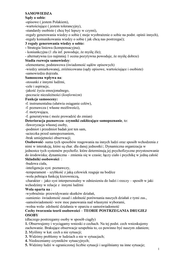 SAMOWIEDZA Sądy o sobie: -opisowe ( jestem Polakiem), -wartościujące ( jestem tolerancyjny), -standardy osobiste ( chcę być lepszy w czymś), -reguły generowania wiedzy o sobie ( moje wyobraŜenie o sobie na podst. opinii innych), -reguły komunikowania wiedzy o sobie ( jak chcą nas postrzegać); 3 reguły generowania wiedzy o sobie: - Strategia liniowa (kompensacyjna); - koniunkcyjna (1 zła inf. powoduje, Ŝe myślę źle); - alternatywna (co najmniej 1 ocena pozytywna powoduje, Ŝe myślę dobrze) Stadia rozwoju samowiedzy: -elementarne, podstawowa (świadomość sądów opisowych) -wiedzy umiarkowanej, zróŜnicowana (sądy opisowe, wartościujące i osobiste) -samowiedza dojrzała. Samoocena wpływa na: -stosunki z innymi ludźmi, -cele i aspiracje, -jakość Ŝycia emocjonalnego, -poczucie niezaleŜności (konformizm) Funkcje samooceny: -f. instrumentalna (ułatwia osiąganie celów), -f. poznawcza ( własne moŜliwości), -f. motywująca, -f. generatywna ( moŜe prowadzić do zmian) Deterioracja poznawcza- czynniki zakłócające samopoznanie, to: -faworyzacja własnej osoby, -podmiot i przedmiot badań jest ten sam, -ucieczka przed samopoznaniem, -brak umiejętności obserwacji; Osobowość- suma tych sposobów reagowania na innych ludzi oraz sposób wchodzenia z nimi w interakcję, które są char. dla danej jednostki:; Dynamiczna organizacja w jednostce tych systemów psychofiz. które determinują jej psychofizyczne przystosowanie do środowiska; dynamiczna – zmienia się w czasie; łączy ciało i psychikę w jedną całość Składniki osobowości : -budowa ciała, -inteligencja syst. poznawczy, -temperament – szybkość z jaką człowiek reaguje na bodźce -wola pełniąca funkcję kierowniczą, -charakter - jako syst interpersonalny w odniesieniu do ludzi i rzeczy – sposób w jaki wchodzimy w relacje z innymi ludźmi Wola oparta na : -wyobraźnia- przewidywanie skutków działań, -sumienie- świadomość zasad i zdolność porównania naszych działań z tymi zas., -samoświadomość- wew moc panowania nad własnymi wyborami, -wolna wola- zdolność działania w oparciu o samoświadomość Cechy tworzenia teorii osobowości – TEORIE POSTRZEGANIA DRUGIEJ OSOBY (dlaczego postrzegamy osoby w sposób ciągły) 1. Obserwujemy i wyciągamy wnioski o cechach. Na tej podst. cech wnioskujemy zachowanie. Brakujące obserwacje uzupełnia to, co powinno być naszym zdaniem; 2. Myślimy w kat. cech a nie sytuacji; 3. Widzimy problemy w ludziach a nie w sytuacjach; 4. Niedoceniamy czynników sytuacyjnych; 5. Widzimy ludzi w ograniczonej liczbie sytuacji i uogólniamy na inne sytuacje; 1 6. ludzie zachowują się róŜnie przed róŜnymi obserwatorami; 7. Wybieramy sytuacje, w których chcemy się znaleźć 8. Opieramy się na sprawozdaniach o sobie , które są stronnicze; 9. Pierwsze wraŜenia silnie ukierunkowują; 10. Postrzegamy stałość tam gdzie jej nie ma. TYPY ZACHOWAŃ I POSTAW Agresywny – akceptuję siebie odrzucam innych - brak pewności siebie i niska samoocena - brak szacunku dla innych - lekcewaŜenie innych - poczucie wyŜszości - chęć kontrolowania otoczenia i sytuacji - brak zainteresowania uczuciami innych - złość w stosunku do innych - skłonność do obwiniania - nieumiejętność słuchania i zadawania pytań - ignorowanie otoczenia Asertywny – akceptuję siebie i innych - pewność siebie i wysoka samoocena - szacunek dla siebie i innych - odpowiedzialność - motywacja do pracy - zainteresowanie uczuciami innych i myślami innych - umiejętność zadawania pytań - uczciwość i bezpośredniość - umiejętność słuchania - potrzeba poznania reakcji otocznia Manipulujący – ja jestem nic nie wart i świat teŜ - brak pewności siebie i niska samoocena - brak szacunku dla siebie i innych - podejrzliwość i niedowierzanie w stosunku do motywów działania otoczenia - negatywne myśli i uczucia dot. do innych i własnego „ja” - ostroŜność w stosunku do innych nieuczciwość i brak szczerości - zniekształcenie zdarzeń cudzych wypowiedzi - poddawanie w wątpliwość poczucia godności innych ludzi -depresja i brak motywacji Bierny – odrzucam siebie, akceptuję innych - brak pewności siebie, niska samoocena - brak szacunku do siebie - poniŜanie samego siebie - negatywne myśli i uczucia dot. własnej osoby - poczucie niŜszości - przekazywanie innym kontroli nad sytuacją i otoczeniem - poczucie winy, brak motywacji Freud zwrócił uwagę na to, Ŝe jest ogromna rola pod i nad świadomości w działaniu człowieka Psychika ludzka składa się z 3 elementów: -ID („dziecko”), ukryte pragnienia i lęki –„chcę” -EGO (ma kontakt z rzeczywistością i rozstrzyga problemy między chcę i powinienem, kieruje się zasadą „wielu’), -SUPER EGO (odpowiednik zbioru wartości, sumienia kieruje się zasada „powinienem”) UWAGA mechanizmy obronne – przeniesienie bodźców na inna osobę Piramida potrzeb Maslowa (od dołu) 2 1.Potrzeby fizjologiczne (poŜywienie, woda, potrzeby seksualne) 2.Potrzeba bezpieczeństwa (bezpieczeństwo, stabilizacja, wolność od strachu) 3.Potrzeba przynaleŜności 4.Potrzeba uznania (poczucie, Ŝe jest się waŜnym) 5.Potrzeba samorealizacji, samoaktualizacji (zdolność do wykorzystania swojego potencjału) 6.Autotranscendencja (potrzeby duchowe) Formowanie osobowości wg Ericssona, etapy: e1. 1 rok - Niemowlęctwo - ufne lub nieufne; e2. 2-3 – Wczesne dzieciństwo - pewne siebie lub nieśmiałe; Autonomia a wstyd i zwątpienie e3. 4 -5 lat – Wiek zabawy - rozwój umiejętności , rozwój inicjatywy lub poczucie winy; e4. 6-11 – Wiek szkolny - pracowitość lub poczucie niŜszości, kompetencja lub kompleksy organizacja pracy; e5. 12-18 - Adolescencja - akceptacja samego siebie, kształtowanie relacji z ludźmi, toŜsamość lub przemieszanie ról; e6. 19-30 – Młodzi dorośli - związki intymne miłość lub izolacja ; e7. 31-50 – Dorosłość - twórczość lub stagnacja, o