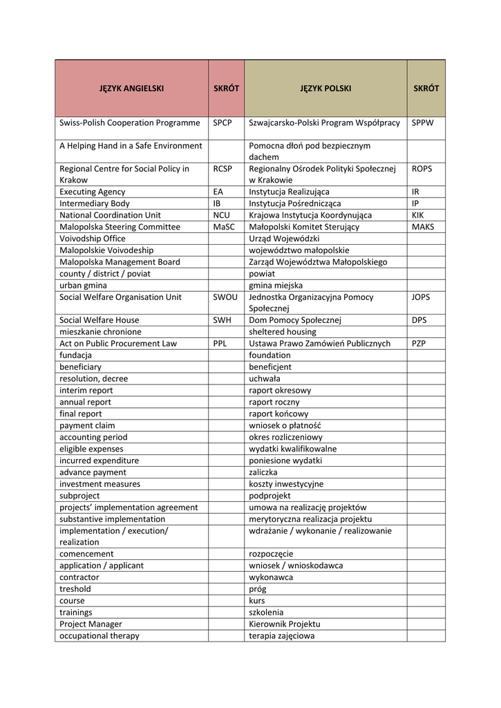 JĘZYK ANGIELSKI Swiss-Polish Cooperation Programme SKRÓT SPCP A Helping Hand in a Safe Environment Regional Centre for Social Policy in Krakow Executing Agency Intermediary Body National Coordination Unit Malopolska Steering Committee Voivodship Office Malopolskie Voivodeship Malopolska Management Board county / district / poviat urban gmina Social Welfare Organisation Unit RCSP Social Welfare House mieszkanie chronione Act on Public Procurement Law fundacja beneficiary resolution, decree interim report annual report final report payment claim accounting period eligible expenses incurred expenditure advance payment investment measures subproject projects’ implementation agreement substantive implementation implementation / execution/ realization comencement application / applicant contractor treshold course trainings Project Manager occupational therapy SWH EA IB NCU MaSC SWOU PPL JĘZYK POLSKI Szwajcarsko-Polski Program Współpracy Pomocna dłoń pod bezpiecznym dachem Regionalny Ośrodek Polityki Społecznej w Krakowie Instytucja Realizująca Instytucja Pośrednicząca Krajowa Instytucja Koordynująca Małopolski Komitet Sterujący Urząd Wojewódzki województwo małopolskie Zarząd Województwa Małopolskiego powiat gmina miejska Jednostka Organizacyjna Pomocy Społecznej Dom Pomocy Społecznej sheltered housing Ustawa Prawo Zamówień Publicznych foundation beneficjent uchwała raport okresowy raport roczny raport końcowy wniosek o płatność okres rozliczeniowy wydatki kwalifikowalne poniesione wydatki zaliczka koszty inwestycyjne podprojekt umowa na realizację projektów merytoryczna realizacja projektu wdrażanie / wykonanie / realizowanie rozpoczęcie wniosek / wnioskodawca wykonawca próg kurs szkolenia Kierownik Projektu terapia zajęciowa SKRÓT SPPW ROPS IR IP KIK MAKS JOPS DPS PZP NAZWY PROJEKTÓW Trening czyni samodzielnym! Training makes independent! Mieszkamy pod bezpiecznym dachem We live in a safe environment Modernizacja IPOW dla Chłopców w Krakowie – ul. Naczelna 12. Modernization of ECEI for boys in Krakow – 12 Naczelna St. Modernizacja infrastruktury Placówki Opiekuńczo Wychowawczej typu interwencyjnego w Nowym Sączu. Modernization of the infrastructure of Emergency Care and Education Institution in Nowy Sącz. Placówka przyjazna wychowankom. Poprawa świadczonych usług w Pogotowiu Opiekuńczym. Child-friendly institution. Improvement of services provided in the Emergency Care. Jestem bezpieczny – poprawa warunków bytowych dzieci przebywających w placówce interwencyjnej. I am safe – improvement of children’s living conditions in emergency institution. Poprawa warunków bytowych dziewcząt przebywających w placówce na osiedlu Willowym. Improvement of living conditions of girls staying at the facility on Willowe estate. Dom przyjazny mieszkańcom. Poprawa świadczonych usług w DPS w Bobrku House friendly to residents. Improvement in provided services into the SWH in Bobrek Rozbudowa DPS w Nowodworzu w celu podniesienia jakości usług Modernizacja DPS ul. Łanowa 41 - budynek 41 Development of SWH in Nowodworze for purpose of upgrading service quality Modernization of SWH at 41 Łanowa street – building 41b Modernization of SWH at 55 Krakowska street in Krakow SWH in Szczyrzyc – expansion, an increase in the quality of services through the infrastructure development and personnel training Modernizacja DPS w Krakowie ul. Krakowska 55 DPS Szczyrzyc –poszerzenie, wzrost jakości usług poprzez rozbudowę, szkolenia pracowników Poprawa życia mieszkańców DPS Gorlice Rozbudowa infrastruktury i szkolenia personelu Modernizacja i rozwój oferty Domu Pomocy Społecznej przy ul. Nawojowskiej 159 w Nowym Sączu Modernizacja jakości usług opieki społecznej świadczonych przez DPS w Zbyszycach Improvement of living standards at SWH in Gorlice - Infrastructure development and personnel training Modernization and service development at SWH, at 59 Nawojowska street in Nowy Sącz Modernization of the quality of social services provided by the SWH in Zbyszyce