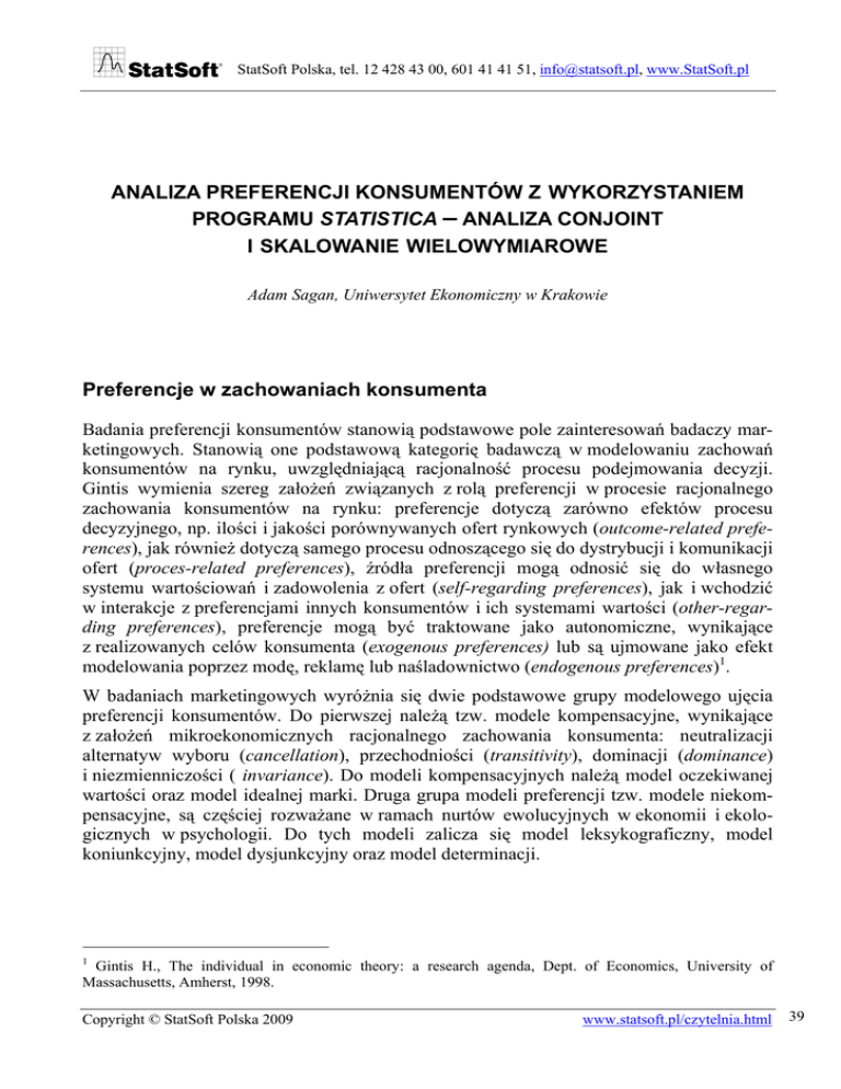 StatSoft Polska, tel. 12 428 43 00, 601 41 41 51, [email protected], www.StatSoft.pl ANALIZA PREFERENCJI KONSUMENTÓW Z WYKORZYSTANIEM PROGRAMU STATISTICA – ANALIZA CONJOINT I SKALOWANIE WIELOWYMIAROWE Adam Sagan, Uniwersytet Ekonomiczny w Krakowie Preferencje w zachowaniach konsumenta Badania preferencji konsumentów stanowią podstawowe pole zainteresowań badaczy marketingowych. Stanowią one podstawową kategorię badawczą w modelowaniu zachowań konsumentów na rynku, uwzględniającą racjonalność procesu podejmowania decyzji. Gintis wymienia szereg założeń związanych z rolą preferencji w procesie racjonalnego zachowania konsumentów na rynku: preferencje dotyczą zarówno efektów procesu decyzyjnego, np. ilości i jakości porównywanych ofert rynkowych (outcome-related preferences), jak również dotyczą samego procesu odnoszącego się do dystrybucji i komunikacji ofert (proces-related preferences), źródła preferencji mogą odnosić się do własnego systemu wartościowań i zadowolenia z ofert (self-regarding preferences), jak i wchodzić w interakcje z preferencjami innych konsumentów i ich systemami wartości (other-regarding preferences), preferencje mogą być traktowane jako autonomiczne, wynikające z realizowanych celów konsumenta (exogenous preferences) lub są ujmowane jako efekt modelowania poprzez modę, reklamę lub naśladownictwo (endogenous preferences)1. W badaniach marketingowych wyróżnia się dwie podstawowe grupy modelowego ujęcia preferencji konsumentów. Do pierwszej należą tzw. modele kompensacyjne, wynikające z założeń mikroekonomicznych racjonalnego zachowania konsumenta: neutralizacji alternatyw wyboru (cancellation), przechodniości (transitivity), dominacji (dominance) i niezmienniczości ( invariance). Do modeli kompensacyjnych należą model oczekiwanej wartości oraz model idealnej marki. Druga grupa modeli preferencji tzw. modele niekompensacyjne, są częściej rozważane w ramach nurtów ewolucyjnych w ekonomii i ekologicznych w psychologii. Do tych modeli zalicza się model leksykograficzny, model koniunkcyjny, model dysjunkcyjny oraz model determinacji. 1 Gintis H., The individual in economic theory: a research agenda, Dept. of Economics, University of Massachusetts, Amherst, 1998. Copyright © StatSoft Polska 2009 www.statsoft.pl/czytelnia.html 39 StatSoft Polska, tel. 12 428 43 00, 601 41 41 51, [email protected], www.StatSoft.pl Metody pomiaru preferencji Preferencje konsumentów są najczęściej traktowane jako nieobserwowalny bezpośrednio konstrukt teoretyczny, wynikający z określonej teorii mikroekonomicznej lub modelu zachowania konsumenta. Ich pomiar dokonywany jest na podstawie określonych deklaracji wyrażonych na odpowiednich skalach pomiarowych (stated preferences) lub ujawniane są poprzez obserwacje rzeczywistych rynkowych wyborów konsumentów (revealed preferences). Najbardziej popularne ujęcie metod pomiaru preferencji wynikają z teorii danych zaproponowanej przez C. H. Coombsa, który zaproponował klasyfikacje rodzaju uzyskiwanych danych, jak i metod ich gromadzenia i analizy na podstawie dwóch kryteriów: charakteru relacji między danymi oraz liczby porównywanych typów obiektów. Z punktu widzenia charakteru relacji dane mogą mieć charakter relacji podobieństwa (bliskości) lub dominacji (preferencji), a z punktu widzenia typów porównywanych obiektów porównania mogą być dokonywane w obrębie jednego zbioru (jednostka vs obiekt) lub dwóch zbiorów obiektów (np. par punktów A-B vs C-D ). Skrzyżowanie tych kryteriów daje w konsekwencji cztery podstawowe rodzaje danych: 1/ pojedynczego bodźca, 2/ preferencyjnego wyboru, 3/ porównania bodźców i 4/ podobieństwa między bodźcami. Pierwszy rodzaj danych jest charakterystyczny dla skal ocen (np. Guttmana czy Likerta), drugi typ danych cechuje wielowymiarowe skalowanie preferencji oparte na teorii rozwijania (unfolding), trzeci jest właściwy dla skal porównawczych rangowych, porównań preferencyjnych par obiektów, skali V Thurstone’a, porządkowego sortowania i techniki punktu kotwicznego, a czwarty rodzaj danych obejmuje dane uzyskane na podstawie ocen podobieństw między parami diad obiektów (skala porównań par), sortowania i techniki triad stanowiących podstawę wielowymiarowych skal percepcji2. W badaniach preferencji konsumentów typowym rodzajem uzyskiwanych danych są dane oparte na porównywaniu bodźców (skale rangowe, porównań par, punktu kotwicznego) oraz dane preferencyjnego wyboru odnoszącego się do różnic między obiektem a punktem idealnym (jednostką). Są one podstawą wyboru między kompozycyjnymi a dekompozycyjnymi metodami pomiaru preferencji. Wyróżnia się trzy podstawowe grupy metod pomiaru preferencji. Pierwszą grupę metod stanowią tzw. metody dekompozycyjne, drugą grupę metody kompozycyjne pomiaru preferencji, a trzecią – metody mieszane. Metody dekompozycyjne są głównie związane z danymi uzyskiwanymi na podstawie porównywania obiektów między sobą. Podstawą pomiaru preferencji jest równoczesna ocena, szeregowanie (lub wybór) porównywanego zbioru marek lub kategorii produktów opisanych za pomocą charakteryzującego je zbioru atrybutów o określonych poziomach lub własnościach (realizacjach). Respondenci oceniają, rangują lub dokonują wyborów profili produktów i na tej podstawie szacowane są całkowite ich użyteczności. W kolejnym etapie analizy użyteczności całkowite są dekomponowane (stąd nazwa podejścia) na użyteczności cząstkowe poszczególnych poziomów lub własności atrybutów. Do podstawowych metod analizy struktury preferencji w tym nurcie należy analiza conjoint (zwana także analizą łącznego współwystępowania zmiennych i pomiarem wieloczynnikowym). 2 C.H. Coombs, R.M. Dawes, A. Tversky, Wprowadzenie do psychologii matematycznej, PWN Warszawa 1977, s. 62. 40 www.statsoft.pl/czytelnia.html Copyright © StatSoft Polska 2009 Stat