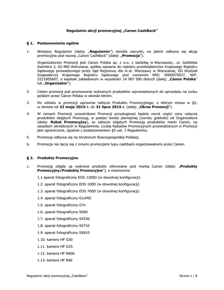 Regulamin akcji promocyjnej „Canon CashBack” § 1. Postanowienia ogólne 1. Niniejszy Regulamin (dalej: „Regulamin”) określa warunki, na jakich odbywa się akcja promocyjna pod nazwą „Canon CashBack” (dalej: „Promocja”). Organizatorem Promocji jest Canon Polska sp. z o.o. z siedzibą w Warszawie,: ul. Gottlieba Daimlera 2, 02-460 Warszawa, spółka wpisana do rejestru przedsiębiorców Krajowego Rejestru Sądowego prowadzonego przez Sąd Rejonowy dla m.st. Warszawy w Warszawie, XII Wydział Gospodarczy Krajowego Rejestru Sądowego pod numerem KRS: 0000075027, NIP: 5221005607, o kapitale zakładowym w wysokości 14 907 500 złotych (dalej: „Canon Polska” lub „Organizator”). 2. Celem promocji jest promowanie wybranych produktów wprowadzonych do sprzedaży na rynku polskim przez Canon Polska w okresie letnim. 3. Do udziału w promocji uprawnia nabycie Produktu Promocyjnego, o którym mowa w §2, w okresie od 22 maja 2015 r. do 31 lipca 2015 r. (dalej: „Okres Promocji”). 4. W ramach Promocji uczestnikowi Promocji przysługiwać będzie zwrot części ceny nabycia produktów objętych Promocją, w postaci kwoty pieniężnej (zwrotu gotówki) od Organizatora (dalej: Rabat Promocyjny), za nabycie objętych Promocją produktów marki Canon, na zasadach określonych w Regulaminie. Liczba Rabatów Promocyjnych przewidzianych w Promocji jest ograniczona, zgodnie z postanowieniem §5 ust. 3 Regulaminu. 5. Promocja odbywa się na terytorium Rzeczypospolitej Polskiej. 6. Promocja nie łączy się z innymi promocjami typu cashback organizowanymi przez Canon. § 2. Produkty Promocyjne 1. Promocją objęte są wybrane produkty oferowane pod marką Canon (dalej: „Produkty Promocyjny/Produkty Promocyjne”), a mianowicie: 1.1 aparat fotograficzny EOS 1200D (w dowolnej konfiguracji) 1.2. aparat fotograficzny EOS 100D (w dowolnej konfiguracji) 1.3. aparat fotograficzny EOS 700D (w dowolnej konfiguracji) 1.4. aparat fotograficzny G1xMII 1.5. aparat fotograficzny G7x 1.6. aparat fotograficzny SX60 1.7. aparat fotograficzny SX530 1.8. aparat fotograficzny SX710 1.9. aparat fotograficzny SX610 1.10. kamera HF G30 1.11. kamera HF G25 1.12. kamera HF R606 1.13. kamera HF R66 Regulamin akcji promocyjnej „CashBack” Strona 1 / 8 1.14. kamera HF R67 1.15. kamera Legria Mini X 1.16. obiektyw EF 16-35mm 1:4,0L IS USM 1.17. obiektyw EF 24-70mm f/4L IS USM 1.18. obiektyw EF 70-200mm f/4L IS USM 1.19. obiektyw EF 70-300mm f/4-5.6 IS USM 1.20. obiektyw EF-S 17-55mm f/2.8 IS USM 1.21. obiektyw EF-S 10-22mm f/3.5-4.5 USM 1.22. obiektyw EF-S 55-250MM 1:4-5.6 IS STM 1.23. obiektyw EF-S18-135 IS STM 1.24. obiektyw EF-S 10-18 mm f/4.5-5.6 IS STM 1.25. obiektyw EF-S 24 mm f/2.8 STM 1.26. obiektyw EF 35 mm f/2.0 IS USM 1.27. obiektyw EF40 2.8 STM 1.28. lampa błyskowa 600EX 1.29. lampa błyskowa 430EX 1.30. lampa błyskowa 270EX 1.31. urządzenie wielofunkcyjne MG6650 1.32. urządzenie wielofunkcyjne MG7550 1.33. drukarka fotograficzna CP910 2. Promocją objęte są jedynie produkty zakupione w następujących sieciach sprzedaży (w tym sprzedaży internetowej): Canon Pro Imaging Partners: Aster/Fotostrada, BEIKS, Cyfrowe.pl, Fotoaparaciki, Fotoforma, Foto-Plus, Optima, Proclub, PW Digital, Studiotech. Pozostałe sieci handlowe: 2bis.pl, Agito, Auchan, Avans.pl, Carrefour, Electro.pl, Euro RTV AGD, Fotojoker, Fotozakupy, JB Multimedia, KDM-Foto, Komputronik, Makro, Media Markt, Mediaexpert, Morele.net, Neonet, OleOle.pl, Saturn, Selgros, Sferis, X-kom. 3. Promocją objęte są wyłącznie Produkty Promocyjne fabrycznie nowe, nabyte w punktach sprzedaży detalicznej na terenie Rzeczypospolitej Polskiej, w tym nabyte w ramach sprzedaży na odległość prowadzonej przez przedsiębiorców posiadających miejsce zamieszkania albo siedzibę w Rzeczypospolitej Polskiej (np. w sklepach internetowych). Do udziału w Promocji nie uprawnia nabycie Produktu Premiowanego poza granicami Rzeczypospolitej Polskiej lub od osoby fizycznej, która nie prowadzi działalności gospodarczej. Promocją nie są objęte Produkty Promocyjne pochodzące ze sprzedaży wtórnej (komisowej lub podobnej). 4. Organizator informuje, że Promocja obejmuje produkty marki Canon, które zostały wprowadzone do obrotu w Rzeczypospolitej Polskiej przez Canon Polska lub autoryzowanych dystrybutorów Canon Polska na terenie Rzeczypospolitej Polskiej w tym zgodnie z postanowieniami § 2 pkt 2 i 3 Regulaminu. Regulamin akcji promocyjnej „CashBack” Strona 2 / 8 5. Promocją objęte są produkty zakupione w oryginalnych opakowaniach, na których znajduje się numer EAN i numer seryjny produktu. Nie są objęte promocją produkty pochodzące z rozpakowania oryginalnych zestawów (białe pudełka) oraz przepakowane przez sprzedawców do własnych opakowań. 6. Uczestnik promocji może zgłosić nabycie i uzyskać w całym Okresie Promocji Rabat Promocyjny za maksymalnie 1 sztukę każdego Produktu Promocyjnego. Zgłoszenie więcej niż 1 sztuki każdego Produktu Promocyjnego nie uprawnia do otrzymania więcej niż jednego Rabatu Promocyjnego za dany produkt. 7. W przypadku zakupu fabrycznie zapakowanego zestawu produktów (body + obiektyw/-y), Rabat Promocyjny można otrzymać wyłącznie za produkt główny (body), nawet jeśli obiektyw będący składnikiem zestawu jest na liście produktów objętych promocją. § 3. Uczestnictwo w Promocji 1. Uczestnikiem Promocji (dalej: „Uczestnik/Uczestnicy”) może być: 1.1. 1.2. 2. każda osoba fizyczna, posiadająca pełną zdolność do czynności prawnych, która w Okresie Promocji nabyła Produkt Promocyjny, jako konsument w rozumieniu art. 221 Kodeksu cywilnego; albo przedsiębiorca, bez względu na formę organizacyjno-prawną (w tym osoba fizyczna prowadząca działalność gospodarczą, osoba prawna albo jednostka organizacyjna nieposiadająca osobowości prawnej, której ustawa przyznaje zdolność prawną), posiadający miejsce zamieszkania albo siedzibę w Rzeczypospolitej Polski