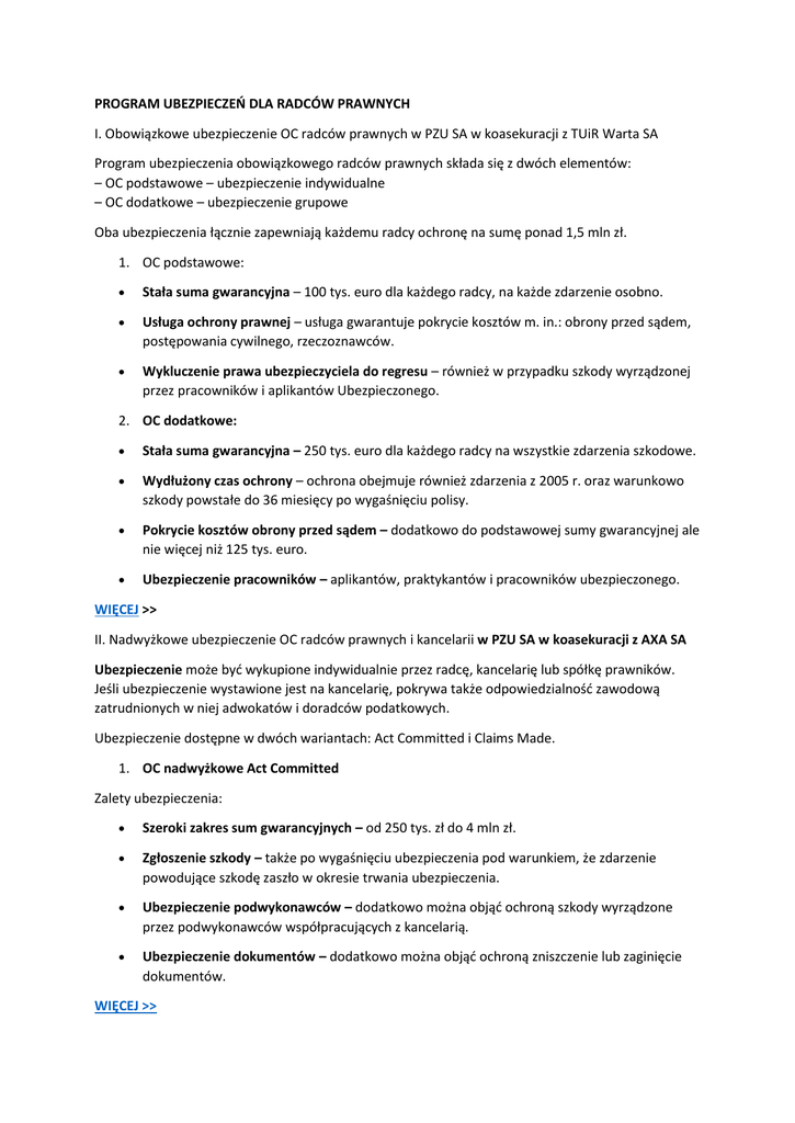 PROGRAM UBEZPIECZEŃ DLA RADCÓW PRAWNYCH I. Obowiązkowe ubezpieczenie OC radców prawnych w PZU SA w koasekuracji z TUiR Warta SA Program ubezpieczenia obowiązkowego radców prawnych składa się z dwóch elementów: – OC podstawowe – ubezpieczenie indywidualne – OC dodatkowe – ubezpieczenie grupowe Oba ubezpieczenia łącznie zapewniają każdemu radcy ochronę na sumę ponad 1,5 mln zł. 1. OC podstawowe: Stała suma gwarancyjna – 100 tys. euro dla każdego radcy, na każde zdarzenie osobno. Usługa ochrony prawnej – usługa gwarantuje pokrycie kosztów m. in.: obrony przed sądem, postępowania cywilnego, rzeczoznawców. Wykluczenie prawa ubezpieczyciela do regresu – również w przypadku szkody wyrządzonej przez pracowników i aplikantów Ubezpieczonego. 2. OC dodatkowe: Stała suma gwarancyjna – 250 tys. euro dla każdego radcy na wszystkie zdarzenia szkodowe. Wydłużony czas ochrony – ochrona obejmuje również zdarzenia z 2005 r. oraz warunkowo szkody powstałe do 36 miesięcy po wygaśnięciu polisy. Pokrycie kosztów obrony przed sądem – dodatkowo do podstawowej sumy gwarancyjnej ale nie więcej niż 125 tys. euro. Ubezpieczenie pracowników – aplikantów, praktykantów i pracowników ubezpieczonego. WIĘCEJ >> II. Nadwyżkowe ubezpieczenie OC radców prawnych i kancelarii w PZU SA w koasekuracji z AXA SA Ubezpieczenie może być wykupione indywidualnie przez radcę, kancelarię lub spółkę prawników. Jeśli ubezpieczenie wystawione jest na kancelarię, pokrywa także odpowiedzialność zawodową zatrudnionych w niej adwokatów i doradców podatkowych. Ubezpieczenie dostępne w dwóch wariantach: Act Committed i Claims Made. 1. OC nadwyżkowe Act Committed Zalety ubezpieczenia: Szeroki zakres sum gwarancyjnych – od 250 tys. zł do 4 mln zł. Zgłoszenie szkody – także po wygaśnięciu ubezpieczenia pod warunkiem, że zdarzenie powodujące szkodę zaszło w okresie trwania ubezpieczenia. Ubezpieczenie podwykonawców – dodatkowo można objąć ochroną szkody wyrządzone przez podwykonawców współpracujących z kancelarią. Ubezpieczenie dokumentów – dodatkowo można objąć ochroną zniszczenie lub zaginięcie dokumentów. WIĘCEJ >> 2. OC nadwyżkowe Claims Made Zalety ubezpieczenia: Szeroki zakres sum gwarancyjnych – od 1 mln zł do 20 mln zł. Wydłużony okres ochrony – ochrona obejmuje również czynności zawodowe wykonywane przed zawarciem ubezpieczenia, ale nie wcześniej, niż 1 stycznia 2005 r. oraz warunkowo szkody powstałe do 36 miesięcy po wygaśnięciu ubezpieczenia. Ochrona pracowników – ubezpieczeniem objęci są również pracownicy, aplikanci i praktykanci kancelarii. Rozszerzenia – dodatkowo ochroną mogą zostać objęci podwykonawcy oraz dokumenty kancelarii. WIĘCEJ >> III. Ubezpieczenia dodatkowe: Dodatkowo program ubezpieczeń radców zawiera instrumenty umożliwiające rozszerzenie ochrony działalności. Należą do nich: 1. OC aplikanta 2. Ubezpieczenie NNW 3. Ubezpieczenie majątku kancelarii 4. Ubezpieczenie nadwyżkowe w ramach funkcji zleconych: syndyka, nadzorcy sądowego, zarządcy likwidatora, kuratora WIĘCEJ >> Sprzedaż i obsługę techniczną wszystkich ubezpieczeń objętych Umową Generalną prowadzi iExpert.pl SA Szczegółowych informacji udziela: Lidia Rumianek tel.: 22 646 42 42 kom.: 882 024 303 e-mail: [email protected] www.iexpert.pl Zgłaszanie szkód Szkody z zakresu ubezpieczeń likwiduje Centrum Operacyjne Likwidacji Szkód i Świadczeń PZU SA. Można je zgłaszać dzwoniąc pod numer: 22 308 38 90 Dokumenty do pobrania: Rozporządzenie Ministra Finansów w sprawie obowiązkowego ubezpieczenia odpowiedzialności cywilnej radców prawnych Ogólne warunki ubezpieczenia odpowiedzialności cywilnej zawodowej Druk zgłoszenia szkody