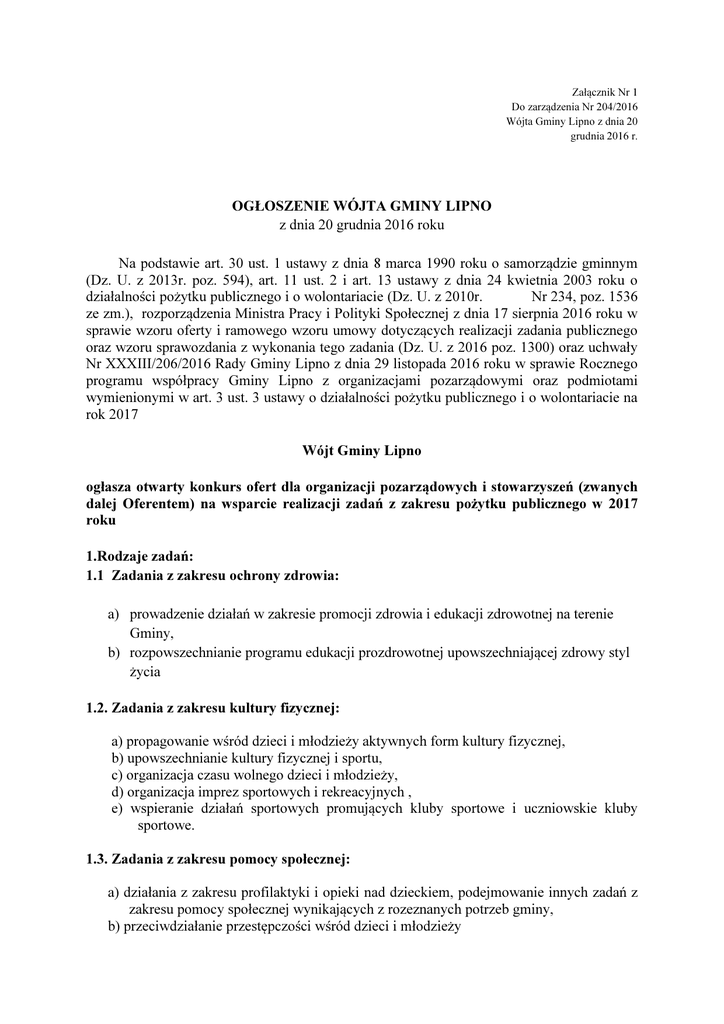 Załącznik Nr 1 Do zarządzenia Nr 204/2016 Wójta Gminy Lipno z dnia 20 grudnia 2016 r. OGŁOSZENIE WÓJTA GMINY LIPNO z dnia 20 grudnia 2016 roku Na podstawie art. 30 ust. 1 ustawy z dnia 8 marca 1990 roku o samorządzie gminnym (Dz. U. z 2013r. poz. 594), art. 11 ust. 2 i art. 13 ustawy z dnia 24 kwietnia 2003 roku o działalności pożytku publicznego i o wolontariacie (Dz. U. z 2010r. Nr 234, poz. 1536 ze zm.), rozporządzenia Ministra Pracy i Polityki Społecznej z dnia 17 sierpnia 2016 roku w sprawie wzoru oferty i ramowego wzoru umowy dotyczących realizacji zadania publicznego oraz wzoru sprawozdania z wykonania tego zadania (Dz. U. z 2016 poz. 1300) oraz uchwały Nr XXXIII/206/2016 Rady Gminy Lipno z dnia 29 listopada 2016 roku w sprawie Rocznego programu współpracy Gminy Lipno z organizacjami pozarządowymi oraz podmiotami wymienionymi w art. 3 ust. 3 ustawy o działalności pożytku publicznego i o wolontariacie na rok 2017 Wójt Gminy Lipno ogłasza otwarty konkurs ofert dla organizacji pozarządowych i stowarzyszeń (zwanych dalej Oferentem) na wsparcie realizacji zadań z zakresu pożytku publicznego w 2017 roku 1.Rodzaje zadań: 1.1 Zadania z zakresu ochrony zdrowia: a) prowadzenie działań w zakresie promocji zdrowia i edukacji zdrowotnej na terenie Gminy, b) rozpowszechnianie programu edukacji prozdrowotnej upowszechniającej zdrowy styl życia 1.2. Zadania z zakresu kultury fizycznej: a) propagowanie wśród dzieci i młodzieży aktywnych form kultury fizycznej, b) upowszechnianie kultury fizycznej i sportu, c) organizacja czasu wolnego dzieci i młodzieży, d) organizacja imprez sportowych i rekreacyjnych , e) wspieranie działań sportowych promujących kluby sportowe i uczniowskie kluby sportowe. 1.3. Zadania z zakresu pomocy społecznej: a) działania z zakresu profilaktyki i opieki nad dzieckiem, podejmowanie innych zadań z zakresu pomocy społecznej wynikających z rozeznanych potrzeb gminy, b) przeciwdziałanie przestępczości wśród dzieci i młodzieży 1.4. Zadania z zakresu ochrony zwierząt: a) działania na rzecz humanitarnego traktowania zwierząt oraz ich praw, a zwłaszcza pomoc zwierzętom bezdomnym, zaniedbanym, krzywdzonym i wykorzystywanym do celów niezgodnych z ich naturą, b) wspieranie działalności społecznej, kulturalnej, naukowej i oświatowej prowadzonej na rzecz ochrony zwierząt oraz podnoszenie świadomości społeczeństwa w zakresie humanitarnego traktowania zwierząt, c) przeciwdziałanie patologiom społecznym poprzez zapobieganie 2. Wysokość środków finansowych przeznaczonych na realizację zadań w formie dotacji w roku 2017 wynosi 93.000 zł. 3. Zasady przyznawania dotacji: 1) z budżetu gminy dotowane będą zadania realizowane na rzecz mieszkańców Gminy Lipno, 2) warunkiem przystąpienia do konkursu jest złożenie w formie pisemnej oferty zgodnej ze wzorem określonym w Rozporządzeniu Ministra Pracy i Polityki Społecznej z dnia 17 sierpnia 2016 roku w sprawie wzoru oferty i ramowego wzoru umowy dotyczących realizacji zadania publicznego oraz wzoru sprawozdania z wykonania tego zadania (Dz. U. z 2016r., poz. 1300), 3) ofertę należy złożyć w terminie i w sposób czytelny zgodnie z zasadami uczciwej konkurencji gwarantujący wykonanie zadania w sposób efektywny, oszczędny i terminowy, 4) Oferent winien wykazać posiadanie niezbędnej wiedzy, kwalifikacji, doświadczeń, kadry i odpowiedniego zaplecza lokalowego do realizacji konkretnego zadania, 5) dotacja zostanie przyznana Oferentowi spełniającemu wymogi formalne, według określonych kryteriów i założonych planów na realizację zadania, 6) dotacja przekazywana będzie na konto bankowe Oferenta w transzach, po podpisaniu umowy na realizację zadania, 7) Oferent aby otrzymać kolejną transzę dotacji, zobowiązany jest do rozliczenia się z wcześniej otrzymanej transzy, 8) oferty niekompletne i nieprawidłowo wypełnione, albo złożone po terminie nie będą rozpatrywane, 9 ) złożenie oferty nie jest równoznaczne z przyznaniem dotacji. 4. Terminy i warunki realizacji zadań: 1) Termin realizacji zadań obejmuje okres od dnia 1 stycznia 2017 roku do grudnia 2017 roku. 31 2) Otrzymanej dotacji nie można wykorzystywać na: a) prowadzenie działalności gospodarczej, b) pokrycie kosztów utrzymania biura oraz wynagrodzenia pracowników Oferenta za wyjątkiem trenerów. 3) Oferent po zakończeniu zadania zobowiązany jest do przedstawienia szczegółowego sprawozdania merytorycznego i finansowego wykonanego zadania. 5. Termin składania ofert: 1) Kompletną ofertę wraz z załącznikami, należy złożyć w zamkniętej kopercie z dopiskiem „Otwarty konkurs ofert dla organizacji pozarządowych i stowarzyszeń na wsparcie realizacji zadań zakresu……..(określenie rodzaju zadania)”, w nieprzekraczalnym terminie do dnia 20 stycznia 2017 roku do godz. 15.00, w sekretariacie Urzędu Gminy w Lipnie ul. Powstańców Wielkopolskich 9, pokój nr 5. 2) Do oferty należy dołączyć wymagane załączniki: a) aktualny odpis z Krajowego Rejestru Sądowego lub inny dokument stanowiący o podstawie działalności Oferenta, b) statut Podmiotu w przypadku złożenia innego dokumentu niż odpis z KRS, c) sprawozdanie merytoryczne i finansowe z działalności Oferenta za 2016 rok, d) oświadczenie o braku zobowiązań publiczno-prawnych wobec budżetu państwa i jednostek samorządu terytorialnego. Dopuszcza się możliwość składania dodatkowych wyjaśnień do czasu zakończenia prac Komisji konkursowej. Kopie dokumentów winny być poświadczone za zgodność z oryginałem przez osobę upoważnioną do podpisania oferty. 6. Tryb i kryteria stosowane przy wyborze ofert oraz termin dokonania wyboru ofert: 1) Rozpatrzenie ofert nastąpi w terminie do dnia 17 lutego 2017 roku włącznie. 2) Oferty oceniane będą przez Komisję konkursową powołaną przez Wójta Gminy Lipno. 3) Ocenie podlegają następujące kryteria: a) możliwość realizacji zadania przez 