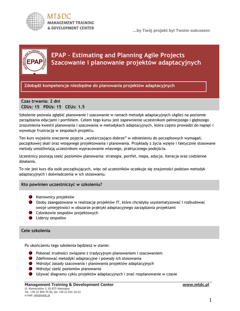 ...by Twój projekt był Twoim sukcesem EPAP – Estimating and Planning Agile Projects Szacowanie i planowanie projektów adaptacyjnych Zdobądź kompetencje niezbędne do planowania projektów adaptacyjnych Czas trwania: 2 dni CDUs: 15 PDUs: 15 CEUs: 1.5 Szkolenie pozwala zgłębić planowanie i szacowanie w ramach metodyk adaptacyjnych (Agile) na poziomie zarządzania edycjami i portfelem. Celem tego kursu jest zapewnienie uczestnikom pełniejszego i głębszego zrozumienia kwestii planowania i szacowania w metodykach adaptacyjnych, która często prowadzi do napięć i wywołuje frustrację w zespołach projektu. Ten kurs wyjaśnia znaczenie pojęcia „wystarczająco dobrze” w odniesieniu do początkowych wymagań, początkowej skali oraz wstępnego projektowania i planowania. Przykłady z życia wzięte i faktycznie stosowane metody umożliwiają uczestnikom wypracowanie własnego, praktycznego podejścia. Uczestnicy poznają sześć poziomów planowania: strategia, portfel, mapa, edycja, iteracja oraz codzienne działania. To nie jest kurs dla osób początkujących, więc od uczestników oczekuje się znajomości podstaw metodyk adaptacyjnych i doświadczenia w ich stosowaniu. Kto powinien uczestniczyć w szkoleniu? Kierownicy projektów Osoby zaangażowane w realizację projektów IT, które chciałyby usystematyzować i rozbudować swoje umiejętności w obszarze praktyki adaptacyjnego zarządzania projektami Członkowie zespołów projektowych Liderzy zespołów Cele szkolenia Po ukończeniu tego szkolenia będziesz w stanie: Pokonać trudności związane z tradycyjnym planowaniem i szacowaniem Zdefiniować metodyki adaptacyjne i powody ich stosowania Wdrożyć zasady szacowania i planowania projektów adaptacyjnych Wdrożyć sześć poziomów planowania Używać diagramu cyklu projektów adaptacyjnych i znać rozplanowanie w czasie Management Training & Development Center Ul. Klarnecistów 3, 02-875 Warszawa Tel. +48 22 894-70-50, fax +48 22 641-10-22 e-mail: [email protected] www.mtdc.pl 1 ...by Twój projekt był Twoim sukcesem Pisać historyjki i dzielić epikę/opowieści Wdrożyć metody wymiarowania adaptacyjnego i dobierać odpowiednie metody Wdrożyć szacowanie względne, poker planistyczny, grupowanie wg złożoności oraz metodę maksymalnej produktywności (ang. ideal day) Wyjaśnić prędkość i wydajność oraz oszacować prędkość początkową Wdrożyć planowanie i edycje Planować pod kątem ustalonego terminu i zakresu Wdrożyć planowanie edycji w programie realizowanym przez wiele zespołów Grupować opowieści wg wielkości oraz stosować przeszacowania i kalibrację Wdrożyć planowanie edycji w zespołach rozproszonych Definiować metryki Agile – co mierzymy Korzyści z udziału Uzyskanie użytecznych narzędzi do natychmiastowego zastosowania w praktyce Możliwość przeprowadzenia konsultacji z międzynarodowym ekspertem (w trakcie i po szkoleniu) Wymiana doświadczeń z uczestnikami i poszerzenie sieci kontaktów biznesowych Zdobycie prestiżowego certyfikatu George Washington University Doskonalenie umiejętności posługiwania się biznesowym językiem angielskim Otrzymanie praktycznych materiałów szkoleniowych wzbogaconych o dodatkowe teksty referencyjne Tematyka szkolenia 1. Planowanie i szacowanie adaptacyjne a. Planowanie i szacowanie adaptacyjne b. Systematyka narzędzi c. O mnie d. O TOBIE! e. Cel kursu f. Program 2. Problemy z planowaniem i szacowaniem a. Problemy z planowaniem i szacowaniem b. Największe trudności z planowaniem i szacowaniem c. Problem wymagający rozwiązania d. Nic dziwnego, że… e. Wykorzystanie cech użytkowych f. Odsetek projektów zakończonych niepowodzeniem g. Porównanie czynników sukcesu w zależności od metody h. Dyskusyjne strategie unikania kłopotów stosowane przez zespoły projektu i. Dlaczego 37% projektów kończy się niepowodzeniem? j. Planowanie adaptacyjne k. Program 3. Zasady planowania i szacowania adaptacyjnego a. Zasady planowania i szacowania adaptacyjnego b. Manifest Agile – 2001 Management Training & Development Center Ul. Klarnecistów 3, 02-875 Warszawa Tel. +48 22 894-70-50, fax +48 22 641-10-22 e-mail: [email protected] www.mtdc.pl 2 ...by Twój projekt był Twoim sukcesem c. Zasady Agile d. Wartość jako motor planowania adaptacyjnego e. Planowanie adaptacyjne f. Stożek niepewności g. Planowanie adaptacyjne a planowanie tradycyjne h. Świetne plany powinny… i. PRECYZJA kontra OSZACOWANIE j. Zasady planowania i szacowania adaptacyjnego k. Dokładność rośnie wraz z ilością danych l. Opracowanie oszacowania w przedziale (od do) m. Kto powinien szacować? n. Dekompozycja bazująca na wartości o. 6 poziomów planowania p. Cykl życia projektu Agile q. Program 4. Spisywanie historyjek użytkowników i dzielenie opowieści a. Spisywanie historyjek użytkowników b. Co to jest historyjka? c. Historyjki użytkowników: przykłady d. Przykładowy rejestr e. Przykładowe historyjki związane z optymalizacją procesu f. Zasady opracowywania historyjek użytkowników g. Poziomy wymagań Agile h. Przykładowy podział wymagań i. Historyjki z innych źródeł j. Warsztaty pisania historyjek k. Przykładowa mapa historyjek l. Techniki porcjowania historyjek m. FILM: Techniki porcjowania historyjek n. Program 5. Metody szacowania i wymiarowania a. Metody szacowania i wymiarowania b. Szacowanie c. Właściwa metoda we właściwym czasie d. Techniki szacowania adaptacyjnego e. Szacowanie względne f. Metody uzyskiwania oszacowań g. Często stosowane jednostki szacowania h. Czemu służą punkty historyjek? i. Punkty historyjek – skala Fibonacciego j. Poker planistyczny w określaniu wielkości historyjek k. Metoda grupowania według złożoności l. FILM: Szacowanie wielkości historyjek m. Warsztaty – szacowanie względne n. Program 6. Zrozumienie prędkości i wydajności a. Zrozumienie prędkości b. Co to jest prędkość? c. Prędkość a punkty d. Mierzenie prędkości
