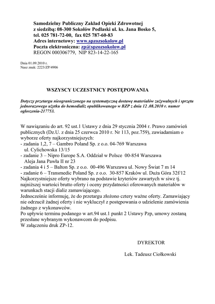 Samodzielny Publiczny Zakład Opieki Zdrowotnej z siedzibą: 08-300 Sokołów Podlaski ul. ks. Jana Bosko 5, tel. 025 781-72-00, fax 025 787-60-83 Adres internetowy: www.spzozsokolow.pl Poczta elektroniczna: [email protected] REGON 000306779, NIP 823-14-22-165 Dnia 01.09.2010 r. Nasz znak: 2223/ZP/4906 WSZYSCY UCZESTNICY POSTĘPOWANIA Dotyczy przetargu nieograniczonego na systematyczną dostawę materiałów zużywalnych i sprzętu jednorazowego użytku do hemodializ opublikowanego w BZP z dnia 12 .08.2010 r. numer ogłoszenia-217753. W nawiązaniu do art. 92 ust.1 Ustawy z dnia 29 stycznia 2004 r. Prawo zamówień publicznych (Dz.U. z dnia 25 czerwca 2010 r. Nr 113, poz.759), zawiadamiam o wyborze oferty najkorzystniejszych: - zadania 1,2, 7 – Gambro Poland Sp. z o.o. 04-769 Warszawa ul. Cylichowska 13/15 - zadanie 3 – Nipro Europe S.A. Oddział w Polsce 00-854 Warszawa Aleja Jana Pawła II nr 23 - zadania 4 i 5 – Balton Sp. z o.o. 00-496 Warszawa ul. Nowy Świat 7 m 14 - zadanie 6 – Transmedic Poland Sp. z o.o. 30-857 Kraków ul. Duża Góra 32f/12 Najkorzystniejsze oferty wybrano na podstawie kryteriów zawartych w siwz tj. najniższej wartości brutto oferty i oceny przydatności oferowanych materiałów w warunkach stacji dializ zamawiającego. Jednocześnie informuję, że do przetargu złożono cztery ważne oferty. Zamawiający nie odrzucił żadnej oferty i nie wykluczył z postępowania o udzielenie zamówienia żadnego z wykonawców. Po upływie terminu podanego w art.94 ust.1 punkt 2 Ustawy Pzp, umowy zostaną przesłane wybranym wykonawcom do podpisu. W załączeniu druk ZP-12. DYREKTOR Lek. Tadeusz Ciołkowski