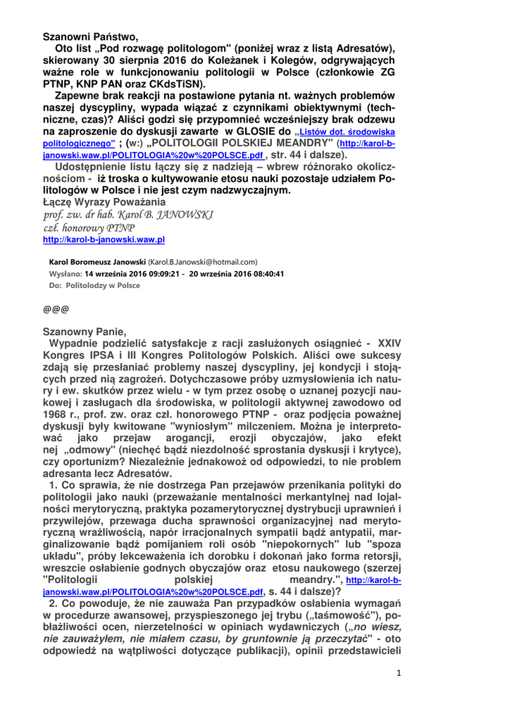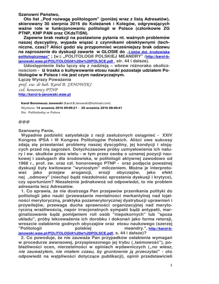 Szanowni Państwo, Oto list „Pod rozwagę politologom" (poniżej wraz z listą Adresatów), skierowany 30 sierpnia 2016 do Koleżanek i Kolegów, odgrywających ważne role w funkcjonowaniu politologii w Polsce (członkowie ZG PTNP, KNP PAN oraz CKdsTiSN). Zapewne brak reakcji na postawione pytania nt. ważnych problemów naszej dyscypliny, wypada wiązać z czynnikami obiektywnymi (techniczne, czas)? Aliści godzi się przypomnieć wcześniejszy brak odzewu na zaproszenie do dyskusji zawarte w GLOSIE do „Listów dot. środowiska politologicznego" ; (w:) „POLITOLOGII POLSKIEJ MEANDRY" (http://karol-bjanowski.waw.pl/POLITOLOGIA%20w%20POLSCE.pdf , str. 44 i dalsze). Udostępnienie listu łączy się z nadzieją – wbrew różnorako okolicznościom - iż troska o kultywowanie etosu nauki pozostaje udziałem Politologów w Polsce i nie jest czym nadzwyczajnym. Łączę Wyrazy Poważania prof. zw. dr hab. Karol B. JANOWSKI czł. honorowy PTNP http://karol-b-janowski.waw.pl Karol Boromeusz Janowski ([email protected]) Wysłano: 14 września 2016 09:09:21 - 20 września 2016 08:40:41 Do: Politolodzy w Polsce @@@ Szanowny Panie, Wypadnie podzielić satysfakcje z racji zasłużonych osiągnieć - XXIV Kongres IPSA i III Kongres Politologów Polskich. Aliści owe sukcesy zdają się przesłaniać problemy naszej dyscypliny, jej kondycji i stojących przed nią zagrożeń. Dotychczasowe próby uzmysłowienia ich natury i ew. skutków przez wielu - w tym przez osobę o uznanej pozycji naukowej i zasługach dla środowiska, w politologii aktywnej zawodowo od 1968 r., prof. zw. oraz czł. honorowego PTNP - oraz podjęcia poważnej dyskusji były kwitowane "wyniosłym" milczeniem. Można je interpretować jako przejaw arogancji, erozji obyczajów, jako efekt nej „odmowy" (niechęć bądź niezdolność sprostania dyskusji i krytyce), czy oportunizm? Niezależnie jednakowoż od odpowiedzi, to nie problem adresanta lecz Adresatów. 1. Co sprawia, że nie dostrzega Pan przejawów przenikania polityki do politologii jako nauki (przeważanie mentalności merkantylnej nad lojalności merytoryczną, praktyka pozamerytorycznej dystrybucji uprawnień i przywilejów, przewaga ducha sprawności organizacyjnej nad merytoryczną wrażliwością, napór irracjonalnych sympatii bądź antypatii, marginalizowanie bądź pomijaniem roli osób "niepokornych" lub "spoza układu", próby lekceważenia ich dorobku i dokonań jako forma retorsji, wreszcie osłabienie godnych obyczajów oraz etosu naukowego (szerzej "Politologii polskiej meandry.", http://karol-bjanowski.waw.pl/POLITOLOGIA%20w%20POLSCE.pdf, s. 44 i dalsze)? 2. Co powoduje, że nie zauważa Pan przypadków osłabienia wymagań w procedurze awansowej, przyspieszonego jej trybu („taśmowość"), pobłażliwości ocen, nierzetelności w opiniach wydawniczych („no wiesz, nie zauważyłem, nie miałem czasu, by gruntownie ją przeczytać" - oto odpowiedź na wątpliwości dotyczące publikacji), opinii przedstawicieli 1 innych dyscyplin (historyków, socjologów, prawników…) o złagodzeniu w politologii rygorów i wymagań stawianych twórczości naukowej (tamże, s. 48)? 3. Czy nie wadzi Panu zanik krytyki, polemik i dyskusji w środowisku politologicznym (s. 47)? 4. Czy nie zauważa Pan niezdolności (niechęci?) do intelektualnego zdefiniowania głównych problemów naszej dyscypliny, ukazania realnych źródeł zagrożeń oraz tendencji do pomniejszania roli i odpowiedzialności grup decyzyjnych skupionych we władzach korporacji politologów (ZG PTNP, KNP PAN) oraz instytucji urzeczywistniającej procedury awansowe (CKdsTiSN)s.46? 5. Dlaczego bezkrytycznie aprobuje Pan wywody zawarte w „Listach dot. środowiska politologicznego" (prezesa PTNP i profesora z Lublina, autora panegiryku) - banalne, skrywające realne problemy politologii - nadal promowane na 3W PTNP? 6. Czy uważa Pan, że do pogodzenia z etosem nauki jest ograniczanie polemiki i krytyki poprzez jej reglamentowanie w naiwnym mniemaniu, że uda się jej zapobiec (pismo ZG PTNP w odpowiedzi na Glosę do „Listów…” , w którym - wbrew logice zdarzeń i rzetelności - ZG PTNP ogłasza biurokratyczną i ośmieszającą go decyzję (traktującą „Listy...” w sposób uprzywilejowany) - iż strona internetowa Towarzystwa "powinna służy jedynie do zamieszczania informacji na temat wydarzeń naukowych" (s. 50)? 7. Czy kwestionuje Pan tezę, że przebieg III Kongres Politologii (osobliwie obrady plenarne) nie pozwala na uznanie go za przedsięwzięcie szczególne, nadające impuls dla oryginalnej twórczości naukowej (s. 1821)? Czy nie dziwi Pana brak dotąd refleksji nad jego rezultatami (Dorobek III Kongresu, «IPSA a polska politologia» na stronie PTNP - to pismo, „laurka" adresowana do IPSA)? 8. Czy aprobuje Pan stan, kiedy korporacja politologów - PTNP - która winna troszczyć się o standardy i kultywowanie etosu nauki - ulega przede wszystkim duchowi sprawności organizacyjno-marketingowej, przedkładając go nad merytoryczną wrażliwość i szacunek dla oryginalnej twórczości naukowej oraz autentycznego dorobku i osiągnięć naukowych (tamże, s. 48)? 9. Czy akceptuje Pan forsowany wśród politologów pogląd, iż „prawdziwa" politologia w Polsce datuje się od przełomu 1989 r., a osobliwe „odrodzenie" ich korporacji nastąpiło wraz ze zmianą na funkcji prezesa PTNP w 2004 r., głoszony m. in. w książce „Kim jesteś politologu? Historia i stan dyscypliny w Polsce", Kraków 2011 (tamże, s. 47-48)? Czy dziwi zatem fakt - wobec uwiądu krytyki - że owe tezy nie spotkały się ze sprzeciwem, wyjąwszy krytyczną (zgodnie z greckim pojmowaniem krytyki) analizę w recenzji KBJ, opublikowanej w „P" nr 3/2012 (kiedy czasopismo wykazywało otwartość na "niepoprawne" metodologicznie i kontrowersyjne opracowania (tamże, s. 47-48). 10. Czy nie wydaje się Panu, iż Towarzystwo traktowane jest jako tarcza ochronna dla fałszywie pojmowanego dobra ogółu