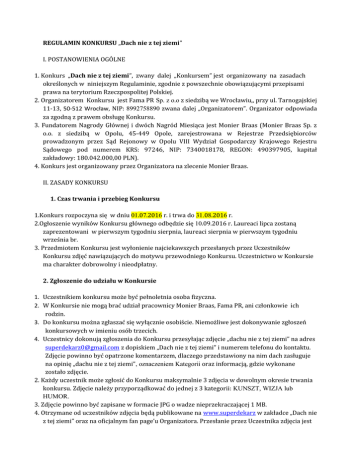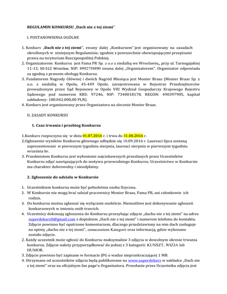 REGULAMIN KONKURSU „Dach nie z tej ziemi” I. POSTANOWIENIA OGÓLNE 1. Konkurs „Dach nie z tej ziemi”, zwany dalej „Konkursem” jest organizowany na zasadach określonych w niniejszym Regulaminie, zgodnie z powszechnie obowiązującymi przepisami prawa na terytorium Rzeczpospolitej Polskiej. 2. Organizatorem Konkursu jest Fama PR Sp. z o.o z siedzibą we Wrocławiu,, przy ul. Tarnogajskiej 11-13, 50-512 Wrocław, NIP: 8992758890 zwana dalej „Organizatorem”. Organizator odpowiada za zgodną z prawem obsługę Konkursu. 3. Fundatorem Nagrody Głównej i dwóch Nagród Miesiąca jest Monier Braas (Monier Braas Sp. z o.o. z siedzibą w Opolu, 45-449 Opole, zarejestrowana w Rejestrze Przedsiębiorców prowadzonym przez Sąd Rejonowy w Opolu VIII Wydział Gospodarczy Krajowego Rejestru Sądowego pod numerem KRS: 97246, NIP: 7340018178, REGON: 490397905, kapitał zakładowy: 180.042.000,00 PLN). 4. Konkurs jest organizowany przez Organizatora na zlecenie Monier Braas. II. ZASADY KONKURSU 1. Czas trwania i przebieg Konkursu 1.Konkurs rozpoczyna się w dniu 01.07.2016 r. i trwa do 31.08.2016 r. 2.Ogłoszenie wyników Konkursu głównego odbędzie się 10.09.2016 r. Laureaci lipca zostaną zaprezentowani w pierwszym tygodniu sierpnia, laureaci sierpnia w pierwszym tygodniu września br. 3. Przedmiotem Konkursu jest wyłonienie najciekawszych przesłanych przez Uczestników Konkursu zdjęć nawiązujących do motywu przewodniego Konkursu. Uczestnictwo w Konkursie ma charakter dobrowolny i nieodpłatny. 2. Zgłoszenie do udziału w Konkursie 1. Uczestnikiem konkursu może być pełnoletnia osoba fizyczna. 2. W Konkursie nie mogą brać udział pracownicy Monier Braas, Fama PR, ani członkowie ich rodzin. 3. Do konkursu można zgłaszać się wyłącznie osobiście. Niemożliwe jest dokonywanie zgłoszeń konkursowych w imieniu osób trzecich. 4. Uczestnicy dokonują zgłoszenia do Konkursu przesyłając zdjęcie „dachu nie z tej ziemi” na adres [email protected] z dopiskiem „Dach nie z tej ziemi” i numerem telefonu do kontaktu. Zdjęcie powinno być opatrzone komentarzem, dlaczego przedstawiony na nim dach zasługuje na opinię „dachu nie z tej ziemi”, oznaczeniem Kategorii oraz informacją, gdzie wykonane zostało zdjęcie. 2. Każdy uczestnik może zgłosić do Konkursu maksymalnie 3 zdjęcia w dowolnym okresie trwania konkursu. Zdjęcie należy przyporządkować do jednej z 3 kategorii: KUNSZT, WIZJA lub HUMOR. 3. Zdjęcie powinno być zapisane w formacie JPG o wadze nieprzekraczającej 1 MB. 4. Otrzymane od uczestników zdjęcia będą publikowane na www.superdekarz w zakładce „Dach nie z tej ziemi” oraz na oficjalnym fan page’u Organizatora. Przesłanie przez Uczestnika zdjęcia jest równoznaczne ze zgodą Uczestnika na wykorzystanie i udostępnienie przesłanych do Organizatora zdjęć. 5. Organizator zastrzega sobie prawo do wycofania zdjęcia z publikacji w galerii bez podania przyczyny. 6. Przesłane do Organizatora treści i wizualizacje nie mogą zawierać treści bezprawnych oraz prowadzących do naruszenia praw innych osób, w tym praw autorskich, praw własności przemysłowej, czy dóbr osobistych, albo naruszających te prawa, jak też naruszający niniejszy Regulamin lub odbiegających tematyką od przedmiotu Konkursu. Zgłoszenia zawierające takie treści lub dostarczone po czasie trwania Konkursu nie będą brały udziału w Konkursie. III. Rozstrzygnięcie konkursu 1. Zdjęcia dodane przez Uczestników Konkursu będą oceniane przez fanów fanpage Superdekarz – na 1 etapie (Zdjęcie Lipca i Zdjęcie Sierpnia), zaś Nagrodę Główną przyzna organizator Konkursu (1 osoba z Famy PR i 2 osoby z Monier Braas). 2. Przy ocenie zdjęć będzie brana pod uwagę kreatywność oraz oryginalność zdjęcia. Dodatkowym atutem będzie dołączona do zdjęcia treść opisu i argumentacja, dlaczego nadesłany dach jest wyjątkowy. 3. Raz w miesiącu zdjęcie z największą liczbą „lajków” otrzyma tytuł „Zdjęcie Miesiąca”, a jego autor otrzyma nagrodą rzeczową. 4. Zwycięzcy „Zdjęcia Miesiąca” biorą udział w konkursie o Nagrodę Główną. 5. Główną (jedną) nagrodą jest smartfon o wartości ok. 100,000 PLN. 6. Wyniki konkursu zostaną opublikowane na stronie www.superdekarz.pl, portalu www.extradom.pl oraz https://www.facebook.com/superdekarz?ref=hl w ciągu 3 dni roboczych od zakończenia konkursu. 7. Nagrody zostaną wysłane do laureatów Miesiąca i Zwycięzcy głównego, po wcześniejszym skontaktowaniu się z nimi przez organizatora Konkursu w terminie 10 dni od uzgodnienia adresu wysyłki. Organizator nie ponosi odpowiedzialności za niemożność przekazania nagrody zwycięzcy z przyczyn zależnych od zwycięzcy, a zwłaszcza podania błędnych danych lub adresu, pod który należy przekazać nagrodę. 8. W przypadku braku możliwości skontaktowania się Organizatora ze zwycięzcą lub w przypadku odstąpienia zwycięzcy z prawa do nagrody, Organizator zastrzega sobie prawo przekazania nagrody kolejnej osobie o najlepszych notowaniach Komisji Konkursowej. 9. Nie jest możliwe odstąpienie prawa do nagrody osobie trzeciej czy wypłacenie równowartości przyznanej nagrody. IV. DEKLARACJE 1. Przystąpienie do udziału w Konkursie jest równoznaczne z zapoznaniem się i akceptacją postanowień niniejszego Regulaminu. 2. Przystąpienie do udziału w Konkursie jest równoznaczne z wyrażeniem zgody na przetwarzanie danych osobowych przez Organizatora zgodnie z przepisami ustawy z dnia 29 sierpnia 1997 roku o ochronie danych osobowych (t.j. Dz. U. z 2014 r., poz. 1182 ze zm.). Organizator jest administratorem danych osobowych. 3. Organizator informuje Uczestników, że ich dane osobowe będą przetwarzane wyłącznie w związku z wykonaniem postanowień niniejszego Regulaminu, w celu przeprowadzenia Konkursu, promocji Konkursu oraz informowania o Konkursie. Każdy uczestnik ma prawo wglądu do swoich danych, ich poprawiania or