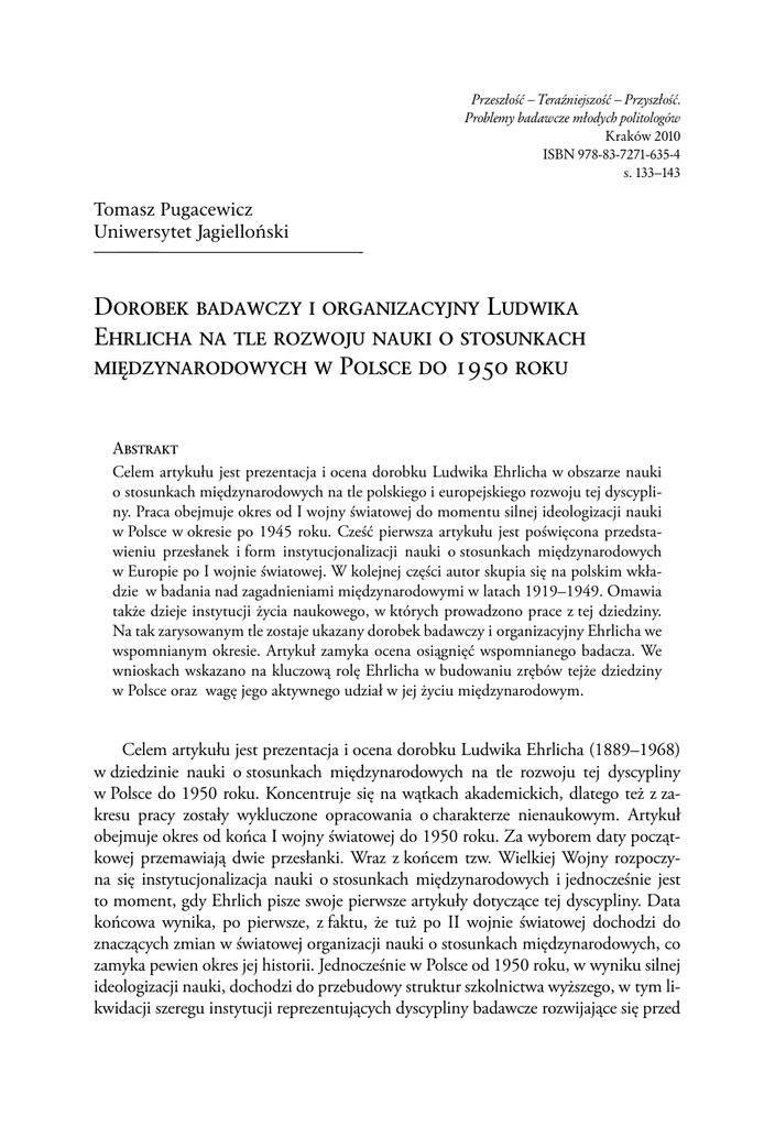 Przeszłość – Teraźniejszość – Przyszłość. Problemy badawcze młodych politologów Kraków 2010 ISBN 978-83-7271-635-4 s. 133–143 Tomasz Pugacewicz Uniwersytet Jagielloński Dorobek badawczy i organizacyjny Ludwika Ehrlicha na tle rozwoju nauki o stosunkach międzynarodowych w Polsce do 1950 roku Abstrakt Celem artykułu jest prezentacja i ocena dorobku Ludwika Ehrlicha w obszarze nauki o stosunkach międzynarodowych na tle polskiego i europejskiego rozwoju tej dyscypliny. Praca obejmuje okres od I wojny światowej do momentu silnej ideologizacji nauki w Polsce w okresie po 1945 roku. Cześć pierwsza artykułu jest poświęcona przedstawieniu przesłanek i form instytucjonalizacji nauki o stosunkach międzynarodowych w Europie po I wojnie światowej. W kolejnej części autor skupia się na polskim wkładzie w badania nad zagadnieniami międzynarodowymi w latach 1919–1949. Omawia także dzieje instytucji życia naukowego, w których prowadzono prace z tej dziedziny. Na tak zarysowanym tle zostaje ukazany dorobek badawczy i organizacyjny Ehrlicha we wspomnianym okresie. Artykuł zamyka ocena osiągnięć wspomnianego badacza. We wnioskach wskazano na kluczową rolę Ehrlicha w budowaniu zrębów tejże dziedziny w Polsce oraz wagę jego aktywnego udział w jej życiu międzynarodowym. Celem artykułu jest prezentacja i ocena dorobku Ludwika Ehrlicha (1889–1968) w dziedzinie nauki o stosunkach międzynarodowych na tle rozwoju tej dyscypliny w Polsce do 1950 roku. Koncentruje się na wątkach akademickich, dlatego też z zakresu pracy zostały wykluczone opracowania o charakterze nienaukowym. Artykuł obejmuje okres od końca I wojny światowej do 1950 roku. Za wyborem daty początkowej przemawiają dwie przesłanki. Wraz z końcem tzw. Wielkiej Wojny rozpoczyna się instytucjonalizacja nauki o stosunkach międzynarodowych i jednocześnie jest to moment, gdy Ehrlich pisze swoje pierwsze artykuły dotyczące tej dyscypliny. Data końcowa wynika, po pierwsze, z faktu, że tuż po II wojnie światowej dochodzi do znaczących zmian w światowej organizacji nauki o stosunkach międzynarodowych, co zamyka pewien okres jej historii. Jednocześnie w Polsce od 1950 roku, w wyniku silnej ideologizacji nauki, dochodzi do przebudowy struktur szkolnictwa wyższego, w tym likwidacji szeregu instytucji reprezentujących dyscypliny badawcze rozwijające się przed 134 Tomasz Pugacewicz II wojną światową. Po tej dacie próżno szukać publikacji Ehrlicha koncentrujących się na zagadnieniach związanych z nauką o stosunkach międzynarodowych. Ocena dorobku Ehrlicha na tle rozwoju nauki o stosunkach międzynarodowych w Polsce nie może mieć miejsca bez krótkiego opisu tej drugiej. Z kolei zrozumienie dynamiki badań prowadzonych w kraju, będących często efektem kontaktów z przedstawicielami nauki z zagranicy, wiąże się z poznaniem stanu badań tej dyscypliny w państwach europejskich. W związku z powyższym niniejszy artykuł składa się z trzech części. Pierwsza jest poświęcona przedstawieniu stanu nauki o stosunkach międzynarodowych w Europie po I wojnie światowej. W kolejnej części autor skupia się na polskim dorobku badań nad zagadnieniami międzynarodowymi w latach 1919–1949. Dopiero na tak zarysowanym tle – w części trzeciej – zostanie przedstawiony dorobek badawczy i organizacyjny Ehrlicha. Artykuł zamyka ocena osiągnięć wspomnianego badacza w relacji do rozwoju tej dyscypliny w Polsce i na świecie. Badania nad stosunkami międzynarodowymi w Europie po I wojnie światowej Rozwój badań nad zagadnieniami międzynarodowymi w Europie ulega intensyfikacji wraz z instytucjonalizacją nauki badającej tę tematykę po I wojnie światowej. Co prawda już w okresie przed 1914 rokiem zagadnienia międzynarodowe miały swoje miejsce w programach części europejskich uczelni wyższych kształcących urzędników publicznych, w tym pracowników służby zagranicznej. Natomiast w Stanach Zjednoczonych tą problematyką zajmowały się wydziały nauk o polityce (political science), intensywnie rozwijające się w tym państwie już od przełomu XIX i XX wieku. Jednakże dopiero po tzw. Wielkiej Wojnie dochodzi do powstania w Europie oddzielnych katedr uczelnianych i wyspecjalizowanych szkół zajmujących się nie tylko dydaktyką, ale także badaniami we wspomnianym obszarze. Można wyodrębnić trzy przyczyny wspomnianej instytucjonalizacji. Po pierwsze, reprezentujący początkowo różne dyscypliny nauki amerykańscy i brytyjscy uczeni – najpierw zgromadzeni w wydzielonych, rządowych grupach badawczych, a potem uczestniczący wspólnie w konferencji paryskiej – uświadomili sobie istnienie jednego, wspólnego obszaru badawczego. Wyrazem tego była decyzja tychże badaczy S. Mauersberg, Nauka i szkolnictwo wyższe w latach 1939–1951, [w:] Historia nauki polskiej, red. B. Suchodolski, t. 5, cz. 1, red. Z. Skubała-Tokarska, Wrocław 1992, s. 459 i n. Kształceniem dyplomatów zajmowała się Akademia Orientalna w Wiedniu, utworzona w 1754 r., później przekształcona w Akademię Konsularną. Urzędnicy publiczni zdobywali także wiedzę o sprawach międzynarodowych w ramach Wolnej Szkoły Nauk Politycznych w Paryżu, założonej w 1871 r. Wreszcie w 1895 r. powstała London School of Economics, stanowiąca narzędzie filantropów do niwelowania różnic społecznych. Por. J. Kukułka, Wstęp do nauki o stosunkach międzynarodowych, Warszawa 2003, s. 38. „Instytucjonalizację amerykańskiej nauki o polityce rozpoczęło utworzenie School of Political Science na Uniwersytecie Columbia w 1880 roku. […] W 1900 roku zostały zorganizowane wykłady z polityki międzynarodowej na Uniwersytecie Visconsin. […] Ogólnokrajowego charakteru nabrało […] utworzone w 1903 r. […] American Political Science Association, które od 1906 r. wydaje «The American Political Science Review»”. J. Kukułka, Teoria stosunków międzynarodowych, Warszawa 2000