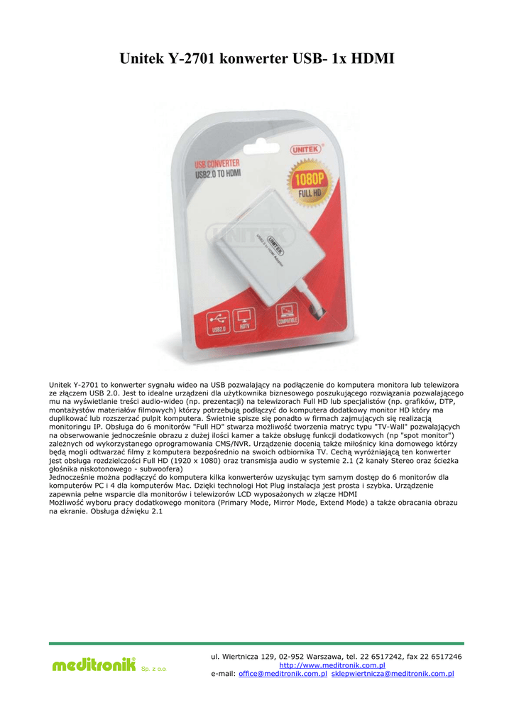 Unitek Y-2701 konwerter USB- 1x HDMI Unitek Y-2701 to konwerter sygnału wideo na USB pozwalający na podłączenie do komputera monitora lub telewizora ze złączem USB 2.0. Jest to idealne urządzeni dla użytkownika biznesowego poszukującego rozwiązania pozwalającego mu na wyświetlanie treści audio-wideo (np. prezentacji) na telewizorach Full HD lub specjalistów (np. grafików, DTP, montażystów materiałów filmowych) którzy potrzebują podłączyć do komputera dodatkowy monitor HD który ma duplikować lub rozszerzać pulpit komputera. Świetnie spisze się ponadto w firmach zajmujących się realizacją monitoringu IP. Obsługa do 6 monitorów "Full HD" stwarza możliwość tworzenia matryc typu "TV-Wall" pozwalających na obserwowanie jednocześnie obrazu z dużej ilości kamer a także obsługę funkcji dodatkowych (np "spot monitor") zależnych od wykorzystanego oprogramowania CMS/NVR. Urządzenie docenią także miłośnicy kina domowego którzy będą mogli odtwarzać filmy z komputera bezpośrednio na swoich odbiornika TV. Cechą wyróżniającą ten konwerter jest obsługa rozdzielczości Full HD (1920 x 1080) oraz transmisja audio w systemie 2.1 (2 kanały Stereo oraz ścieżka głośnika niskotonowego - subwoofera) Jednocześnie można podłączyć do komputera kilka konwerterów uzyskując tym samym dostęp do 6 monitorów dla komputerów PC i 4 dla komputerów Mac. Dzięki technologi Hot Plug instalacja jest prosta i szybka. Urządzenie zapewnia pełne wsparcie dla monitorów i telewizorów LCD wyposażonych w złącze HDMI Możliwość wyboru pracy dodatkowego monitora (Primary Mode, Mirror Mode, Extend Mode) a także obracania obrazu na ekranie. Obsługa dźwięku 2.1 ul. Wiertnicza 129, 02-952 Warszawa, tel. 22 6517242, fax 22 6517246 http://www.meditronik.com.pl e-mail: [email protected] [email protected] Główne funkcje: • obsługa sygnału audio/wideo • możliwość dołączenia dodatkowego monitora/TV do komputera za pośrednictwem portu USB2.0 • nie wymaga dodatkowej karty graficznej • obsługa jednocześnie do 6 wyświetlaczy dla komputerów PC oraz do 4 wyświetlaczy dla komputerów MAC • Obsługa dźwięku 2.1 • Obsługiwane tryby obrazu: Primary, Extend, Mirror oraz Screen Rotation • Kolory: 16bits oraz 32bits • Plug and Play Obsługiwane rozdzielczości: 640x480, 720x480, 768x576, 800x600, 1024x768, 1280x720, 1280x1024, 1360x850, 1400x1050, 1440x900, 1600x1200, 1680x1050, 1920x1080 Specyfikacja: • Złącze USB: USB typu A • Złącze HDMI: Standardowe złącze żeńskie HDMI 19pin • Zasilanie: 5V DC przez port USB • Wymiary urządzenia: 67x64x19 mm • • Wymagania sprzętowe: Oprogramowanie DisplayLink może być uruchomione na komputerach wyposażonych w procesory od Atom N270, Single Core CPU jak również Dual i Quad Core oraz procesory Core i3/i5/i7 Wydajność oprogramowania zależy od mocy komputera oraz od zastosowanego systemu operacyjnego. Mocniejsze komputery oferują wyższą wydajność. Szczegółowe informacje dotyczące wymagań sprzętowych dostępne są w podręczniku użytkownika. • Wspierane systemy operacyjne Microsoft: • • Windows 2000 SP4, • Windows XP SP2 i SP3 • Windows Vista 32 i 64 bit, • Windows 7 32 i 64 bit Mac OS: • Komputery Macintosh bazujące na procesorze Intel • Tiger 10.4.11 • Leopard 10.5.8 • Snow Leopard 10.6.2 • V.16 beta dla Snow Leopard 10.6.2 64bit Zawartość opakowania: konwerter USB do HDMI, plyta CD ze sterownikami, przewodnik szybkiej instalacji, przewód USB zintegrowany ul. Wiertnicza 129, 02-952 Warszawa, tel. 22 6517242, fax 22 6517246 http://www.meditronik.com.pl e-mail: [email protected] [email protected]