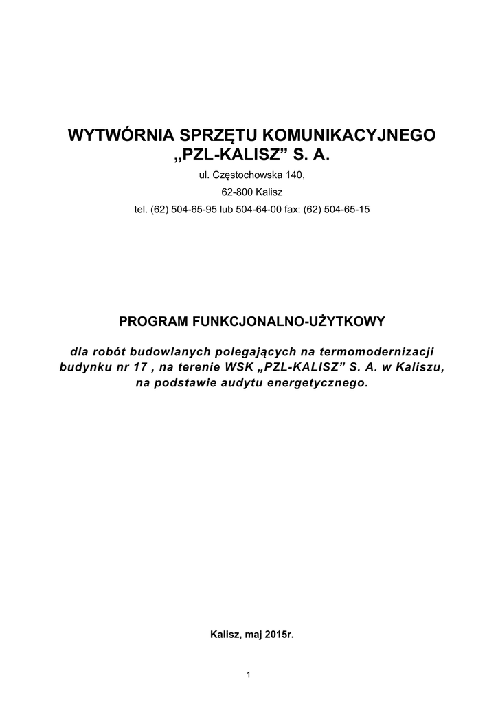 WYTWÓRNIA SPRZĘTU KOMUNIKACYJNEGO „PZL-KALISZ” S. A. ul. Częstochowska 140, 62-800 Kalisz tel. (62) 504-65-95 lub 504-64-00 fax: (62) 504-65-15 PROGRAM FUNKCJONALNO-UŻYTKOWY dla robót budowlanych polegających na termomodernizacji budynku nr 17 , na terenie WSK „PZL-KALISZ” S. A. w Kaliszu, na podstawie audytu energetycznego. Kalisz, maj 2015r. 1 Spis treści 1. 2. 3. 3.1. 3.2. 3.3. 3.4. 3.5. 3.6. 4. Uwagi wstępne ............................................................................................................ 3 Charakterystyka istniejącego budynku .................................................................... 3 Opis ogólny przedmiotu zamówienia .....................................................................3-4 Wymagania dotyczące dokumentacji projektowej ................................................... 4 Wymagania dotyczące robót budowlanych .............................................................. 6 Wymagania dotyczące instalacji ............................................................................... 6 Wymagania dotyczące zagospodarowania terenu i komunikacji ........................... 6 Wymagania dotyczące architektury .......................................................................... 6 Wymagania dotyczące wykończenia ........................................................................ 6 Część informacyjna programu funkcjonalno-użytkowego...................................6-7 2 1. Uwagi wstępne Dokumentacja projektowa ma być zgodna z ustaleniami decyzji o warunkach zabudowy wydanej przez Prezydenta Miasta Kalisz. 1.1. Podane w programie funkcjonalno-użytkowym informacje nie zwalniają oferentów z konieczności przeprowadzenia wizji lokalnej w terenie i uwzględnienia ewentualnych dodatkowych uwarunkowań. Zamawiający oświadcza, że wszystkie informacje zawarte w Programie funkcjonalno-użytkowym bazują na posiadanej dokumentacji audytu energetycznego, która może odbiegać od stanu rzeczywistego. Dlatego Program funkcjonalno-użytkowy nie może służyć jako jedyna podstawa do wykonania kosztorysu prac. 1.2. Projekt zostanie uzupełniony przez Wykonawcę o niezbędne uzgodnienia, opinie, ekspertyzy i odstępstwa od przepisów techniczno-budowlanych, które okażą się konieczne do realizacji przedmiotu zamówienia. Prace projektowe należy wykonać w zakresie niezbędnym do realizacji w/w zadania, Wykonawca złoży oświadczenie o wykonaniu i przekazaniu przedmiotu zamówienia w stanie kompletnym z punktu widzenia celu, któremu ma służyć oraz spełniać obowiązujące przepisy Prawa Budowlanego, przepisy techniczno-budowlane, przepisy powiązane i normy. 1.3. Warunki udziału w postępowaniu oraz opis sposobu dokonywania oceny spełniania tych warunków zgodnie ze Specyfikacją Istotnych Warunków Zamówienia. 1.4. 2. Charakterystyka istniejącego budynku Teren inwestycji stanowi działki nr 11/58 i 11/32 oraz 11/62 obręb 91 położone w Kaliszu, ul. Częstochowska 140. Teren inwestycji nie jest objęty miejscowym planem zagospodarowania przestrzennego. Teren inwestycji znajduje się na terenie zamkniętym WSK „PZL-KALISZ” S. A.. Działki sąsiednie są zabudowane. 2.1. Parametry techniczne istniejącego budynku określone zostały w audycie energetycznym stanowiącym załącznik nr 10 do SIWZ. 2.2. 3. Opis ogólny przedmiotu zamówienia Przedmiotem zamówienia jest wykonanie dokumentacji projektowej oraz roboty budowlane polegające na termomodernizacji budynku nr 17, zgodnie z przeprowadzonym audytem energetycznym, na terenie WSK „PZL-KALISZ” S. A. w Kaliszu. 3 Roboty budowlane obejmują: 3.1 modernizację wentylacji; 3.2 świetlik - zabudowa ściany zachodniej i szczytów; 3.3 świetlik dachowy/szkło zbrojone E (wschód); 3.4 dach hali; 3.5 dach nad świetlikami 3.6 ściana zewnętrzna/hala; 3.7 ściana szczytowa/socjalny; 3.8 stropodach wentylowany; 3.9 ściana osłonowa/socjalny; 3.10 ściana osłonowa/hala; 3.11 stolarka okienna; 3.12 stolarka drzwiowa i bramy; 3.13 modernizacja układu c.o. Zdjęcia znajdujące się w audycie energetycznym przedstawiają aktualny stan budynku. Wykonawca zobowiązany jest do przeanalizowania koncepcji i zaproponowania rozwiązań zamiennych jeżeli są wymagane. 3.1. Wymagania dotyczące dokumentacji projektowej Całość dokumentacji powinna się składać z 3 części: 1. Projekt koncepcyjny w 2 egzemplarzach w formie papierowej oraz 1 wersji elektronicznej, zawierający: Część graficzną: plan zagospodarowania terenu w skali 1:500 rzuty wszystkich kondygnacji w skali 1:100 Część opisową: opis planu zagospodarowania terenu opis rozwiązań funkcjonalnych opis przyjętych rozwiązań materiałowych i technicznych zewnętrznych opis przyjętych rozwiązań materiałowych wewnętrznych (standardy materiałów wykończeniowych) określenie kosztu inwestycji. 2. Projekt Budowlany do uzyskania pozwolenia na budowę wykonany zgodnie z USTAWĄ z dnia 7 lipca 1994 r. Prawo budowlane (Dz. U.03.207.2016 z późniejszymi zmianami), oraz ROZPORZĄDZENIEM MINISTRA INFRASTRUKTURY z dnia 3 lipca 2003 r. w sprawie szczegółowego zakresu i 4 formy projektu budowlanego (Dz. U. z dnia 10 lipca 2003), (Dz. U.03.120.1133). Projekt w formie papierowej w 4 egzemplarzach do pozwolenia na budowę, dwa egzemplarze dla Zamawiającego oraz jeden egzemplarz w wersji elektronicznej dla Zamawiającego. 3. Projekty Wykonawcze, oraz Specyfikacje techniczne wykonania i odbioru robót budowlanych wykonane zgodnie z ROZPORZĄDZENIEM MINISTRA INFRASTRUKTURY z dnia 2 września 2004 r. w sprawie szczegółowego zakresu i formy dokumentacji projektowej, specyfikacji technicznych wykonania i odbioru robót budowlanych oraz programu funkcjonalno-użytkowego (Dz. U. z dnia 16 września 2004 r.) Projekty wykonawcze zostaną wykonane w formie papierowej w ilości 2 egzemplarzy i 1 egzemplarz w wersji elektronicznej. Specyfikacje techniczne wykonania i odbioru robót budowlanych