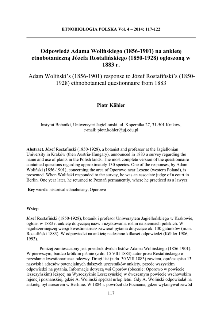 ETNOBIOLOGIA POLSKA Vol. 4 – 2014: 117-122 Odpowiedź Adama Wolińskiego (1856-1901) na ankietę etnobotaniczną Józefa Rostafińskiego (1850-1928) ogłoszoną w 1883 r. Adam Woliński’s (1856-1901) response to Józef Rostafiński’s (18501928) ethnobotanical questionnaire from 1883 Piotr Köhler Instytut Botaniki, Uniwersytet Jagielloński, ul. Kopernika 27, 31-501 Kraków, e-mail: [email protected] Abstract. Józef Rostafinski (1850-1928), a botanist and professor at the Jagiellonian University in Kraków (then Austria-Hungary), announced in 1883 a survey regarding the name and use of plants in the Polish lands. The most complete version of the questionnaire contained questions regarding approximately 130 species. One of the responses, by Adam Woliński (1856-1901), concerning the area of Oporowo near Leszno (western Poland), is presented. When Woliński responded to the survey, he was an associate judge of a court in Berlin. One year later, he returned to Poznań permanently, where he practiced as a lawyer. Key words: historical ethnobotany, Oporowo Wstęp Józef Rostafiński (1850-1928), botanik i profesor Uniwersytetu Jagiellońskiego w Krakowie, ogłosił w 1883 r. ankietę dotyczącą nazw i użytkowania roślin na ziemiach polskich. W najobszerniejszej wersji kwestionariusz zawierał pytania dotyczące ok. 130 gatunków (m.in. Rostafiński 1883). W odpowiedzi na ankietę nadesłano kilkaset odpowiedzi (Köhler 1986, 1993). Poniżej zamieszczony jest przedruk dwóch listów Adama Wolińskiego (1856-1901). W pierwszym, bardzo krótkim piśmie (z dn. 15 VIII 1883) autor prosi Rostafińskiego o przesłanie kwestionariusza odezwy. Drugi list (z dn. 30 VIII 1883) zawiera, oprócz spisu 13 nazwisk i adresów potencjalnych dalszych uczestników ankiety, przede wszystkim odpowiedzi na pytania. Informacje dotyczą wsi Oporów (obecnie: Oporowo w powiecie leszczyńskim) leżącej na Wysoczyźnie Leszczyńskiej w ówczesnym powiecie wschowskim rejencji poznańskiej, gdzie A. Woliński spędzał urlop letni. Gdy A. Woliński odpowiadał na ankietę, był asesorem w Berlinie. W 1884 r. powrócił do Poznania, gdzie wykonywał zawód 117 adwokata. W 1901 był jednym z obrońców w procesie dzieci z Wrześni o udział w głośnym strajku szkolnym. W latach 1891-1896 był członkiem rady miejskiej Poznania. Występował także jako radca prawny Banku Kwilecki-Potocki, a w 1894 był wśród założycieli rolniczej spółki parcelacyjnej, której działalność miała zapobiec wykupywaniu ziemi z rąk polskich przez osadników niemieckich (Saski 1983). W publikowanej poniżej odpowiedzi na ankietę Rostafińskiego zachowano oryginalną ortografię i interpunkcję, nieliczne uzupełnienia lub wątpliwości umieszczono w nawiasach kwadratowych. Zawartość obu listów Oporów p[rzez] Poniec (Punitz, Prov[inz] Posen) dn. 15 Sierpnia 1883 Wielmożnego Pana Profesora upraszam uniżenie o łaskawe nadesłanie odezwy upraszającej o zbieranie materjałów do historyi hodowli użytków roślin w Polsce. Będąc dłuższy czas podczas feryi sądowych na wsi i mając styczność z wykształconymi gospodarzami i z ludem wiejskim mógłbym W[ielmożne]mu Panu Profesorowi niejedne szczegóły przesłać. Z najwyższym szacunkiem najniższy sługa Adam Woliński Referendarjusz Sądu Naziemiańskiego Oporów dn. 30 Sierpnia 1883 Szanownemu Panu Profesorowi przesyłam, com mógł zebrać w celu dzieła Pańskiego. Nie wiele tam tego i zwyczajne rzeczy po części – ale przy obojętności dla sprawy tej, na którą natrafiłem, i to dosyć. Gdzie opuściłem odpowiedź na zapytanie, są to rzeczy lub sprawy tu nie znane – zresztą uwzględniałem prawie wyłącznie tutajsze [sic!] stósunki. Szczęśliwy będę, jeżeli choć małą cegiełkę przyrzuciłem do tej wielkiej, a wspaniałej budowy, którą mamy wnet ujrzeć. 118 Poniżej podaję kilka adresów mych znajomych, którym Szanowny Pan Profesor będzie łaskaw przesłać swą odezwę: [tu następuje lista 13 nazwisk wraz z adresami, 12 z tych osób nie nadesłało odpowiedzi, pozostała osoba wzięła udział w ankiecie z własnej inicjatywy] Wymieniłem tylko osoby, z którymi mnie dobra znajomość łączy, a które według mego zdania będą się mogły Panu Profesorowi przysłużyć, bo są albo fachowi ludzie albo mają stósunki z ludem wiejskim. O dobrych ich chęciach mam dobrą nadzieję. Łącząc wyrazy najgłębszego szacunku zostaję najniższym sługą Adam Woliński Referend[ariusz] Sądu. Adres od 1go Września: Berlin S-W. Hollmannstr. 36.II. Odpowiedzi. Na N. 2 – ludzie wiejscy zbierają często niedojrzałe jeszcze żyto i suszą je na płachtach w piecu na kaszę " N. 3. dziś rzadko gdzie, dawniej więcej, głównie w ogrodach, przed 50 laty dużo w krotoszyńskim powiecie, lecz nie wielkie przestrzenie, nazywano szpelt, ale i orkisz " N. 5: prosa sieją dość dużo, tj. prawie każdy gospodarz wiejski, choć nie wielkie przestrzenie, ½-2 mórg; jagły należą do zwykłego tu pokarmu wiejskiego. " N. 7. tu nie zbierają manny, po innych wsiach tu i ówdzie, dawniej wiele częściej, ale w mieście można dostać kupić, sam w Jankowie Zaleśnym1, powiat krotoszyński, przed 14 laty zbierałem. " N. 8. każdy chłop sadzi bób, głównie w perkach, zawsze między dwoma kierzkami2; soczewicę dominium tutejsze w małej ilości uprawia, zresztą rzadko gdzie, u Polaków rzadko gdzie do jadła używają, więcej u Niemców (Linsen) " N. 11. owsiana kasza, – z jęczmienia: pęczak, perłowa kasza. Kukurudzę ludzie wiejscy rzadko sieją, głównie w większych gospodarstwach. Kukurudzę dawają gotowaną do stołu w pierwszych dworach, jako jarzynkę, niedojrzałą, w całych kiściach. 1 2 Obecnie jest to wieś w gminie Raszków, w powiecie ostrowskim, w województwie wielkopolskim. Gwarowe: krzak, krzew. 119 " N. 12. lud w ten sposób suszy brukiew, że ją pokraje na plastry i nadzieje na sznurek, jak grzyby, również i 