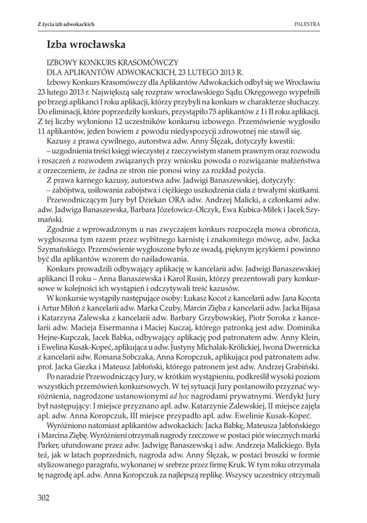 Z życia izb adwokackich PALESTRA Izba wrocławska Izbowy Konkurs Krasomówczy dla Aplikantów Adwokackich, 23 lutego 2013 r. Izbowy Konkurs Krasomówczy dla Aplikantów Adwokackich odbył się we Wrocławiu 23 lutego 2013 r. Największą salę rozpraw wrocławskiego Sądu Okręgowego wypełnili po brzegi aplikanci I roku aplikacji, którzy przybyli na konkurs w charakterze słuchaczy. Do eliminacji, które poprzedziły konkurs, przystąpiło 75 aplikantów z I i II roku aplikacji. Z tej liczby wyłoniono 12 uczestników konkursu izbowego. Przemówienie wygłosiło 11 aplikantów, jeden bowiem z powodu niedyspozycji zdrowotnej nie stawił się. Kazusy z prawa cywilnego, autorstwa adw. Anny Ślęzak, dotyczyły kwestii: – uzgodnienia treści księgi wieczystej z rzeczywistym stanem prawnym oraz rozwodu i roszczeń z rozwodem związanych przy wniosku powoda o rozwiązanie małżeństwa z orzeczeniem, że żadna ze stron nie ponosi winy za rozkład pożycia. Z prawa karnego kazusy, autorstwa adw. Jadwigi Banaszewskiej, dotyczyły: – zabójstwa, usiłowania zabójstwa i ciężkiego uszkodzenia ciała z trwałymi skutkami. Przewodniczącym Jury był Dziekan ORA adw. Andrzej Malicki, a członkami adw. adw. Jadwiga Banaszewska, Barbara Józefowicz-Olczyk, Ewa Kubica-Miłek i Jacek Szymański. Zgodnie z wprowadzonym u nas zwyczajem konkurs rozpoczęła mowa obrończa, wygłoszona tym razem przez wybitnego karnistę i znakomitego mówcę, adw. Jacka Szymańskiego. Przemówienie wygłoszone było ze swadą, pięknym językiem i powinno być dla aplikantów wzorem do naśladowania. Konkurs prowadzili odbywający aplikację w kancelarii adw. Jadwigi Banaszewskiej aplikanci II roku – Anna Banaszewska i Karol Rusin, którzy prezentowali pary konkursowe w kolejności ich wystąpień i odczytywali treść kazusów. W konkursie wystąpiły następujące osoby: Łukasz Kocot z kancelarii adw. Jana Kocota i Artur Miłoń z kancelarii adw. Marka Czuby, Marcin Zięba z kancelarii adw. Jacka Bijasa i Katarzyna Zalewska z kancelarii adw. Barbary Grzybowskiej, Piotr Soroka z kancelarii adw. Macieja Eisermanna i Maciej Kuczaj, którego patronką jest adw. Dominika Hejne‑Kupczak, Jacek Babka, odbywający aplikację pod patronatem adw. Anny Klein, i Ewelina Kusak-Kopeć, aplikująca u adw. Justyny Michalak-Królickiej, Iwona Dwernicka z kancelarii adw. Romana Sobczaka, Anna Koropczuk, aplikująca pod patronatem adw. prof. Jacka Giezka i Mateusz Jabłoński, którego patronem jest adw. Andrzej Grabiński. Po naradzie Przewodniczący Jury, w krótkim wystąpieniu, podkreślił wysoki poziom wszystkich przemówień konkursowych. W tej sytuacji Jury postanowiło przyznać wyróżnienia, nagrodzone ustanowionymi ad hoc nagrodami prywatnymi. Werdykt Jury był następujący: I miejsce przyznano apl. adw. Katarzynie Zalewskiej, II miejsce zajęła apl. adw. Anna Koropczuk, III miejsce przypadło apl. adw. Ewelinie Kusak-Kopeć. Wyróżniono natomiast aplikantów adwokackich: Jacka Babkę, Mateusza Jabłońskiego i Marcina Ziębę. Wyróżnieni otrzymali nagrody rzeczowe w postaci piór wiecznych marki Parker, ufundowane przez adw. Jadwigę Banaszewską i adw. Andrzeja Malickiego. Była też, jak w latach poprzednich, nagroda adw. Anny Ślęzak, w postaci broszki w formie stylizowanego paragrafu, wykonanej w srebrze przez firmę Kruk. W tym roku otrzymała tę nagrodę apl. adw. Anna Koropczuk za najlepszą replikę. Wszyscy uczestnicy otrzymali 302 5–6/2013 Z życia izb adwokackich dyplomy uczestnictwa i nagrody ufundowane przez Wydawnictwo C.H. Beck, w postaci kilkumiesięcznego, bezpłatnego dostępu do Systemu Informacji Prawniczej Legalis. Konkurs pokazał, że sztuka przemawiania nie ginie i że równie pięknie, jak w sprawach karnych, można przemawiać w sprawach cywilnych. Smuci fakt, że mimo osobistych zaproszeń, rozesłanych do wszystkich patronów aplikantów uczestników konkursu, tylko dwoje z nich przyszło wspierać swoich pupili, adw. Barbara Grzybowska i adw. Marek Czuba. Było z nami Radio Wrocław. W wiadomościach lokalnych od godz. 14.00 podawano na antenie relacje z konkursu. Anna Ślęzak Ślubowanie adwokatów Izby Adwokackiej we Wrocławiu, 23 stycznia 2013 r. W dniu 23 stycznia 2013 r. w przepięknym barokowym wnętrzu sali Oratorium Marianum Uniwersytetu Wrocławskiego miało miejsce uroczyste ślubowanie adwokatów Izby Adwokackiej we Wrocławiu. Salę wypełnili młodzi adwokaci, ich patroni, rodziny i przyjaciele. Szczególnymi gośćmi tego wydarzenia byli: Wiceprezes Sądu Okręgowego we Wrocławiu SSO Ewa Gonczarek, Rzecznik Prasowy Sądu Apelacyjnego we Wrocławiu SSA Witold Franckiewicz oraz ks. Prałat Stanisław Pawlaczek. Na ręce Dziekana zostały także przekazane pozdrowienia od adw. Małgorzaty Gruszeckiej, Członka Prezydium Naczelnej Rady Adwokackiej. Przybyłych powitał adw. Krzysztof Zuber, dziękując młodym – już adwokatom – za współpracę w czasie aplikacji. Dziekan ORA adw. Andrzej Malicki wygłosił wykład na temat znaczenia tajemnicy zawodowej adwokata w praktyce wymiaru sprawiedliwości. Podkreślił, że tajemnica ta nie ma charakteru prywatnego, lecz systemowy dla wymiaru sprawiedliwości i w sposób fundamentalny łączy się z prawem do obrony zawartym w art. 42.2 Konstytucji Rzeczypospolitej Polskiej. Zwrócił uwagę na niebezpieczną tendencję zwalniania adwokatów z tajemnicy zawodowej przez sędziów, podkreślając stanowczość orzecznictwa Sądu Apelacyjnego we Wrocławiu w zakresie wyjątkowości takich zwolnień, w czym wielka zasługa Przewodniczącego Wydziału Karnego SSA Wojciecha Kociubińskiego. Dziekan adw. Andrzej Malicki odebrał ślubowanie od trzydziestu młodych adwokatów i zaprosił wszystkich zebranych do wysłuchania koncertu artystów „Piwnicy pod Baranami” Agaty Ślazyk i Piotra „Kuby” Kubowicza. Artyści w swoim repertuarze przygotowanym z okazji uroczystego ślubowania zamieścili zarówno piosenki lirycz