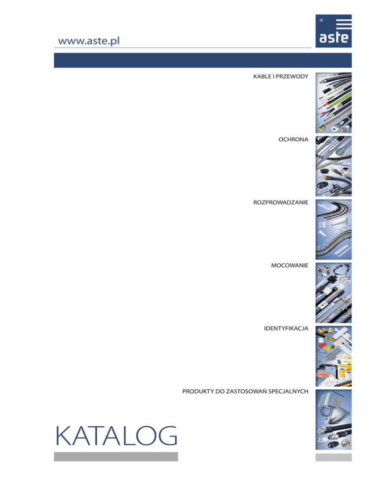 www.aste.pl KABLE I PRZEWODY OCHRONA ROZPROWADZANIE MOCOWANIE IDENTYFIKACJA PRODUKTY DO ZASTOSOWAŃ SPECJALNYCH KATALOG O ASTE ISO 9001:2000 QMS Akredytacja Nr 014 ASTE Sp. z o.o. jest importerem kabli specjalistycznych i profesjonalnego osprzętu kablowego. Spółka wprowadza na rynek nowoczesne technologie i łatwe w montażu produkty, pozwalające na znaczne skrócenie czasu budowy instalacji kablowych, zmniejszające ciężar instalacji oraz gwarantujące dużą trwałość i wytrzymałość. Produkty oferowane przez ASTE spełniają najwyższe wymogi bezpieczeństwa pożarowego. Są przeznaczone do stosowania w warunkach bardzo wymagających (strefy zagrożone wybuchem, przemysł morski, kolejnictwo, ...), co gwarantują liczne dopuszczenia i certyfikaty polskie i międzynarodowe. Oferta ASTE jest skierowana do szerokiego kręgu odbiorców z różnych segmentów rynku m.in.: taboru szynowego, statków, maszyn i urządzeń. l motoryzacja l instalacje elektryczne i elektroenergetyczne l budowa sieci, wyposażenie szaf i centrali telekomunikacyjnych l przemysł chemiczny l budowa Istotną częścią działalności ASTE jest doradztwo w zakresie technik mocowania, ochrony i rozprowadzania kabli, realizowane przez naszych doświadczonych pracowników w siedzibach klientów. Prowadzimy również szkolenia ekip monterskich bezpośrednio na miejscach budowy instalacji kablowych. Wysoką jakość świadczonych przez ASTE usług, potwierdza certyfikat ISO 9001:2000, Rekomendacja Stowarzyszenia Elektryków Polskich oraz liczne referencje przyznawane przez partnerów handlowych. ASTE bierze czynny udział w działalności organizacji branżowych, m.in. Stowarzyszenia na rzecz Interoperacyjności i Rozwoju Transportu Szynowego oraz Polskiej Izby Producentów Urządzeń i Usług na rzecz Kolei. Aktywnie uczestniczymy w życiu społeczności lokalnej, wspieramy inicjatywy dobroczynne, edukacyjne i kulturalne. Prezes Zarządu ASTE pan Andrzej Stelmasiewicz jest pomysłodawcą i koordynatorem dużego programu promocyjnego Miasta Gdańska "Czas Gdańskich Lwów". OFERTA SPIS TREŚCI KABLE I PRZEWODY PRZEWODY ZASILAJĄCE, STEROWNICZE DLA TABORU SZYNOWEGO RODZINA RADOX® 3GKW RODZINA RADOX® 4GKW-AX RODZINA RADOX® 9GKW-AX RODZINA RADOX® GKW LW RADOX® 3GKW - JEDNOŻYŁOWE RADOX® 4GKW-AX - JEDNOŻYŁOWE RADOX® 4GKW-AX EMC-L - JEDNOŻYŁOWE, EKRANOWANE RADOX® 9GKW-AX - JEDNOŻYŁOWE RADOX® 9GKW-AX EMC-L - JEDNOŻYŁOWE, EKRANOWANE RADOX® GKW LW - JEDNOŻYŁOWE RADOX® GKW LW/S - WIELOŻYŁOWE RADOX® GKW LW/S EMC - WIELOŻYŁOWE, EKRANOWANE PRZEWODY DO PRZESYŁU DANYCH DLA TABORU SZYNOWEGO PRZEWODY KONCENTRYCZNE DLA TABORU SZYNOWEGO PRZEWODY ZASILAJĄCE DLA INNYCH GAŁĘZI PRZEMYSŁU RODZINA RADOX® 155 RADOX® 155, klasa F - JEDNOŻYŁOWE RODZINA RADOX® 125 RADOX® 125 - JEDNOŻYŁOWE RADOX® 125 - WIELOŻYŁOWE RADOX® 125 EMC - WIELOŻYŁOWE, EKRANOWANE OCHRONA RURY I AKCESORIA PMA RURY PMA AKCESORIA PMAFIX AKCESORIA PMAGRIP AKCESORIA SMART LINE, ECONOMY LINE AKCESORIA DO RUR DWUDZIELNYCH PMA-CO-FIX AKCESORIA DO ROBOTYKI PMAROBO AKCESORIA UZUPEŁNIAJĄCE RURY I AKCESORIA FRANKISCHE RURY FRANKISCHE AKCESORIA FRANKISCHE RURY KARBOWANE PYL BS ROZCIĘTE I NIEROZCIĘTE RURY KARBOWANE PYL MOD BS ROZCIĘTE I NIEROZCIĘTE RURY KARBOWANE MYD BS ROZCIĘTE I NIEROZCIĘTE ZŁĄCZKI ROZGAŁĘZIAJĄCE FA-T (TRÓJNIK TYP T) ZŁĄCZKI ROZGAŁĘZIAJĄCE FA-Y (TRÓJNIK TYP Y) ZŁĄCZKI ZAMYKAJĄCE FVC UCHWYTY JEDNOCZĘŚCIOWE FWH NARZĘDZIE FN DO WPINANIA KABLI DO RUR OPLOTY OCHRONNE I EKRANUJĄCE OPLOTY OCHRONNE AKCESORIA DO OPLOTÓW OCHRONNYCH OPLOTY EKRANUJĄCE AKCESORIA EMC DO RUR I OPLOTÓW EKRANUJĄCYCH strona 3 7 9 10 10 10 11 12 13 14 15 16 17 18 19 20 21 22 23 24 25 26 27 28 29 31 33 34 35 36 37 38 39 43 45 45 46 47 48 49 50 50 51 52 53 55 56 56 56 OFERTA OSŁONY I OWIJKI KABLOWE OSŁONY KABLOWE KROSUJĄCE SHR NARZĘDZIA CAT DO OSŁON KROSUJĄCYCH OSŁONY HELAWRAP UCHWYTY I PODSTAWKI MONTAŻOWE HELAWRAP NARZĘDZIA HAT DO OSŁON HELAWRAP OWIJKI KABLOWE SPIRALNE WS DŁAWNICE Z TWORZYW SZTUCZNYCH DŁAWNICE STANDARDOWE AG i EG DŁAWNICE Z OSŁONĄ SPIRALNĄ AG-SR I EG-SR PRZEPUSTY DŁAWIĄCE Z TWORZYW SZTUCZNYCH PRZEPUSTY RUTASEAL® Z EPDM PRZEPUSTY RUTASEAL® Z CHLOROPRENU PRZEPUSTY RUTASEAL® LIGHT Z EPDM PRZEPUSTY KLIKSEAL® ROZPROWADZANIE KORYTA SIATKOWE DEFEM AKCESORIA SYSTEMU KORYT SIATKOWYCH DEFEM MOCOWANIE OPASKI ZACISKOWE Z TWORZYW SZTUCZNYCH OPASKI STANDARDOWE A-TIE OPASKI ZACISKOWE PRZYKRĘCANE TCV OPASKI ZACISKOWE PRZYKRĘCANE PMA-150 OPASKI ZACISKOWE WCISKANE PWV OPASKI ZACISKOWE WCISKANE PCV OPASKI ZACISKOWE WCISKANE SBH OPASKI ZACISKOWE WCISKANE FT OPASKI ZACISKOWE OTWIERALNE HV OPASKI ZACISKOWE OTWIERALNE, ELASTYCZNE SRT / SOFTFIX OPASKI KORALIKOWE OTWIERALNE TV OPASKI ZACISKOWE NISKO PROFILOWE FCV OPASKI SPEEDY TIE DO UNIKALNYCH ZASTOSOWAŃ OPASKI PEEK DO ZASTOSOWAŃ W WARUNKACH WYMAGAJĄCYCH OPASKI MCT Z ZAWARTOŚCIĄ PYŁU METALOWEGO PODSTAWKI SAMOPRZYLEPNE MOPS PODSTAWKI MONTAŻOWE PRZYKRĘCANE MOPP PODSTAWKI MONTAŻOWE WCISKANE MOPB PODSTAWKI MONTAŻOWE WCISKANE PHC NARZĘDZIA MONTAŻOWE DO OPASEK Z TWORZYW SZTUCZNYCH OPASKI ZACISKOWE ZE STALI OPASKI ZACISKOWE TIE-LOK, MINI TIE-LOK NIEPOWLEKANE OPASKI ZACISKOWE BAND-IT PPA, POWLEKANE OPASKI ZACISKOWE BALL-LOK, NIEPOWLEKANE I POWLEKANE OPASKI ZACISKOWE MULTI-LOK, NIEPOWLEKANE I POWLEKANE NARZĘDZIA DO OPASEK ZE STALI TAŚMY ZE STALI TAŚMY NIEPERFOROWANE ZE STALI NIERDZEWNEJ, NIEPOWLEKANE TAŚMY NIEPERFOROWANE ZE STALI 316, NIEPOWLEKANE I POWLEKANE ZAMKI DO TAŚM NIEPERFOROWANYCH NARZĘDZIA DO TAŚM NIEPERFOROWANYCH TAŚMY PERFOROWANE ZE STALI 316, NIEPOWLEKANE I POWLEKANE ZESTAWY DO TWORZENIA OBEJM ŚLIMAKOWYCH strona 4 57 59 60 60 61 62 63 65 67 68 69 71 72 73 74 75 77 78 81 83 85 86 86 87 88 88 89 90 91 92 92 93 95 96 97 97 98 99 100 101 103 104 105 106 107 109 111 112 113 114 115 116 OFERTA UCHWYTY Z TWORZYW SZTUCZNYCH UCHWYTY KLIP UCHWYTY MUKDO UCHWYTY MUKW UCHWYTY ES UCHWYTY KABLOWE SAMOPRZYLEPNE IDENTYFIKACJA OZNACZNIKI Z TWORZYW