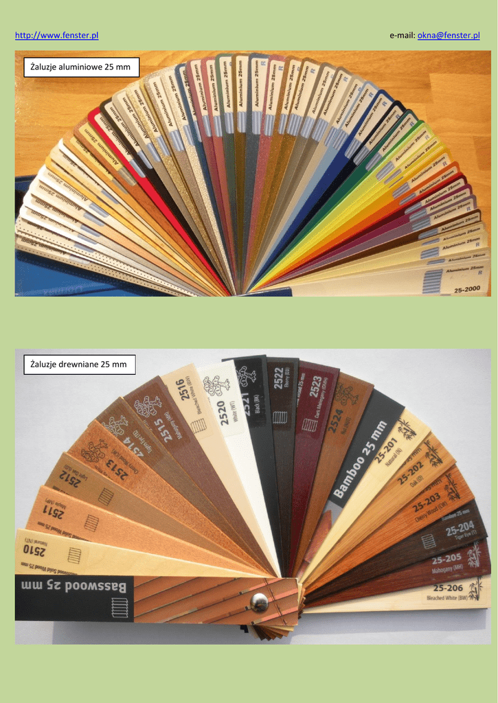 http://www.fenster.pl Żaluzje aluminiowe 25 mm Żaluzje drewniane 25 mm e-mail: [email protected] http://www.fenster.pl Żaluzje drewniane 50 mm e-mail: [email protected]