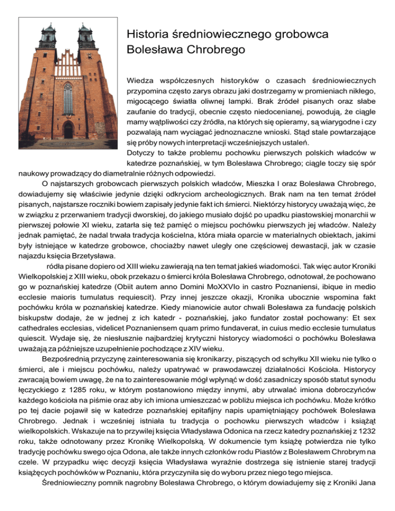 Historia œredniowiecznego grobowca Boles³awa Chrobrego Wiedza wspó³czesnych historyków o czasach œredniowiecznych przypomina czêsto zarys obrazu jaki dostrzegamy w promieniach nik³ego, migoc¹cego œwiat³a oliwnej lampki. Brak Ÿróde³ pisanych oraz s³abe zaufanie do tradycji, obecnie czêsto niedocenianej, powoduj¹, ¿e ci¹gle mamy w¹tpliwoœci czy Ÿród³a, na których siê opieramy, s¹ wiarygodne i czy pozwalaj¹ nam wyci¹gaæ jednoznaczne wnioski. St¹d stale powtarzaj¹ce siê próby nowych interpretacji wczeœniejszych ustaleñ. Dotyczy to tak¿e problemu pochowku pierwszych polskich w³adców w katedrze poznañskiej, w tym Boles³awa Chrobrego; ci¹gle toczy siê spór naukowy prowadz¹cy do diametralnie ró¿nych odpowiedzi. O najstarszych grobowcach pierwszych polskich w³adców, Mieszka I oraz Boles³awa Chrobrego, dowiadujemy siê w³aœciwie jedynie dziêki odkryciom archeologicznych. Brak nam na ten temat Ÿróde³ pisanych, najstarsze roczniki bowiem zapisa³y jedynie fakt ich œmierci. Niektórzy historycy uwa¿aj¹ wiêc, ¿e w zwi¹zku z przerwaniem tradycji dworskiej, do jakiego musia³o dojœæ po upadku piastowskiej monarchii w pierwszej po³owie XI wieku, zatar³a siê te¿ pamiêæ o miejscu pochówku pierwszych jej w³adców. Nale¿y jednak pamiêtaæ, ¿e nadal trwa³a tradycja koœcielna, która mia³a oparcie w materialnych obiektach, jakimi by³y istniej¹ce w katedrze grobowce, chocia¿by nawet uleg³y one czêœciowej dewastacji, jak w czasie najazdu ksiêcia Brzetys³awa. •ród³a pisane dopiero od XIII wieku zawieraj¹ na ten temat jakieœ wiadomoœci. Tak wiêc autor Kroniki Wielkopolskiej z XIII wieku, obok przekazu o œmierci króla Boles³awa Chrobrego, odnotowa³, ¿e pochowano go w poznañskiej katedrze (Obiit autem anno Domini MoXXVIo in castro Poznaniensi, ibique in medio ecclesie maioris tumulatus requiescit). Przy innej jeszcze okazji, Kronika ubocznie wspomina fakt pochówku króla w poznañskiej katedrze. Kiedy mianowicie autor chwali Boles³awa za fundacjê polskich biskupstw dodaje, ¿e w jednej z ich katedr - poznañskiej, jako fundator zosta³ pochowany: Et sex cathedrales ecclesias, videlicet Poznaniensem quam primo fundaverat, in cuius medio ecclesie tumulatus quiescit. Wydaje siê, ¿e nies³usznie najbardziej krytyczni historycy wiadomoœci o pochówku Boles³awa uwa¿aj¹ za póŸniejsze uzupe³nienie pochodz¹ce z XIV wieku. Bezpoœredni¹ przyczynê zainteresowania siê kronikarzy, pisz¹cych od schy³ku XII wieku nie tylko o œmierci, ale i miejscu pochówku, nale¿y upatrywaæ w prawodawczej dzia³alnoœci Koœcio³a. Historycy zwracaj¹ bowiem uwagê, ¿e na to zainteresowanie móg³ wp³yn¹æ w doœæ zasadniczy sposób statut synodu ³êczyckiego z 1285 roku, w którym postanowiono miêdzy innymi, aby utrwalaæ imiona dobroczyñców ka¿dego koœcio³a na piœmie oraz aby ich imiona umieszczaæ w pobli¿u miejsca ich pochówku. Mo¿e krótko po tej dacie pojawi³ siê w katedrze poznañskiej epitafijny napis upamiêtniaj¹cy pochówek Boles³awa Chrobrego. Jednak i wczeœniej istnia³a tu tradycja o pochowku pierwszych w³adców i ksi¹¿¹t wielkopolskich. Wskazuje na to przywilej ksiêcia W³adys³awa Odonica na rzecz katedry poznañskiej z 1232 roku, tak¿e odnotowany przez Kronikê Wielkopolsk¹. W dokumencie tym ksi¹¿ê potwierdza nie tylko tradycjê pochówku swego ojca Odona, ale tak¿e innych cz³onków rodu Piastów z Boles³awem Chrobrym na czele. W przypadku wiêc decyzji ksiêcia W³adys³awa wyraŸnie dostrzega siê istnienie starej tradycji ksi¹¿êcych pochówków w Poznaniu, która przyczyni³a siê do wyboru przez niego tego miejsca. Œredniowieczny pomnik nagrobny Boles³awa Chrobrego, o którym dowiadujemy siê z Kroniki Jana Historia œredniowiecznego grobowca Boles³awa Chrobrego strona 2 D³ugosza, by³ ju¿ kolejnym upamiêtnieniem pochówku w katedrze poznañskiej. W 1341 roku odby³ siê w niej œlub króla Kazimierza Wielkiego z córk¹ landgrafa heskiego - Adelajd¹. Istniej¹ce wówczas epitafia upamiêtniaj¹ce tutaj pochówki pierwszych Piastów by³y skromne i s³abo czytelne, sk³oni³o to króla Kazimierza do postawienia okazalszego pomnika, zw³aszcza dla o¿ywienia pamiêci Boles³awa Chrobrego i przypomnienia rozmachu jego rz¹dów i zwyciêstw wojennych. Z relacji D³ugosza wynika³oby, ¿e nowy grobowiec Chrobrego nie tylko powsta³ z inicjatywy Kazimierza Wielkiego, lecz tak¿e mia³ byæ wprost przez niego fundowany. Bli¿szej daty wystawienia pomnika niestety nie znamy. Niektórzy jednak, wbrew D³ugoszowi, za fundatora nowego nagrobka i epitafium uznaj¹ biskupa poznañskiego Jana £odziê, który mia³ byæ równie¿ promotorem przygotowanej w XIV wieku kanonizacji Króla Boles³awa. Inni jednak s¹ raczej sk³onni uwa¿aæ za fundatora póŸniejszego biskupa Jana V Doliwê, który fundacji tej móg³ dokonaæ dopiero po 1356 roku. Jeszcze inni przypominaj¹, ¿e inicjatorem fundacji oko³o 1370 roku by³oby szersze œrodowisko wielkopolskie, które chcia³o w ten sposób zamanifestowaæ pañstwotwórcz¹ tradycjê Wielkopolski. Natomiast historycy sztuki za g³ównego fundatora nagrobka uznaj¹ przede wszystkim króla Kazimierza Wielkiego. Biskup poznañski, mo¿e wespó³ z kapitu³¹, by³by w takim razie jedynie wspó³fundatorem. W przypadku Kazimierza chodzi³oby o uczczenie pierwszego króla Polski i manifestacjê idei integracyjnej Ziem Korony, a w przypadku zaœ biskupa i kapitu³y chodzi³o o uczczenie pamiêci pierwszego fundatora koœcio³a katedralnego, przy okazji zakoñczenia budowy nowego koœcio³a. Grobowiec z XIV wieku, postawiony poœrodku nawy g³ównej katedry, znany jest przede wszystkim ze stosunkowo póŸnych opisów i z XVIII-wiecznej ryciny. Prawdopodobnie na wzór tego grobowca zosta³ te¿ sporz¹dzony relikwiarzyk przechowywany do naszych czasów w rezydencji biskupów krakowskich. Wspominana rycina by³a najpierw w³asnoœci¹ Tadeusz
