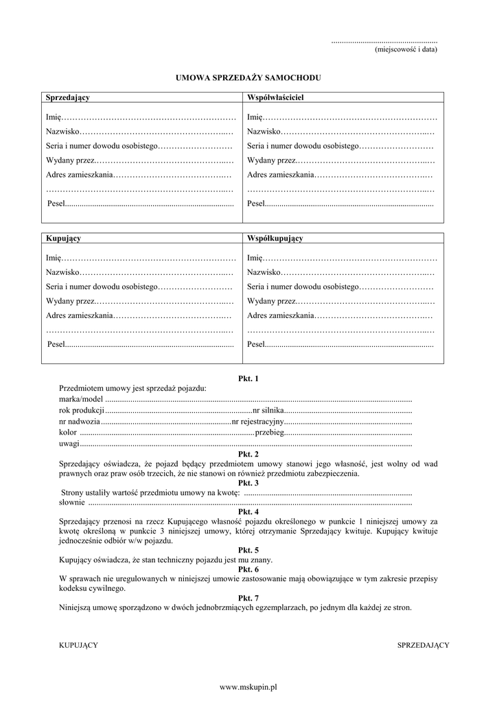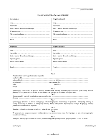 ................................................... (miejscowość i data) UMOWA SPRZEDAŻY SAMOCHODU Sprzedający Współwłaściciel Imię……………………………………………………… Imię……………………………………………………… Nazwisko……………………………………………..… Nazwisko……………………………………………..… Seria i numer dowodu osobistego……………………… Seria i numer dowodu osobistego……………………… Wydany przez.………………………………………..… Wydany przez.………………………………………..… Adres zamieszkania………………………………….… Adres zamieszkania………………………………….… ………………………………………………………..… ………………………………………………………..… Pesel................................................................................. Pesel................................................................................. Kupujący Współkupujący Imię……………………………………………………… Imię……………………………………………………… Nazwisko……………………………………………..… Nazwisko……………………………………………..… Seria i numer dowodu osobistego……………………… Seria i numer dowodu osobistego……………………… Wydany przez.………………………………………..… Wydany przez.………………………………………..… Adres zamieszkania………………………………….… Adres zamieszkania………………………………….… ………………………………………………………..… ………………………………………………………..… Pesel................................................................................. Pesel................................................................................. Pkt. 1 Przedmiotem umowy jest sprzedaż pojazdu: marka/model .................................................................................................................................................. rok produkcji ...................................................................... nr silnika............................................................. nr nadwozia .............................................................. nr rejestracyjny............................................................. kolor ................................................................................... przebieg............................................................. uwagi .............................................................................................................................................................. Pkt. 2 Sprzedający oświadcza, że pojazd będący przedmiotem umowy stanowi jego własność, jest wolny od wad prawnych oraz praw osób trzecich, że nie stanowi on również przedmiotu zabezpieczenia. Pkt. 3 Strony ustaliły wartość przedmiotu umowy na kwotę: ................................................................................ słownie .......................................................................................................................................................... Pkt. 4 Sprzedający przenosi na rzecz Kupującego własność pojazdu określonego w punkcie 1 niniejszej umowy za kwotę określoną w punkcie 3 niniejszej umowy, której otrzymanie Sprzedający kwituje. Kupujący kwituje jednocześnie odbiór w/w pojazdu. Pkt. 5 Kupujący oświadcza, że stan techniczny pojazdu jest mu znany. Pkt. 6 W sprawach nie uregulowanych w niniejszej umowie zastosowanie mają obowiązujące w tym zakresie przepisy kodeksu cywilnego. Pkt. 7 Niniejszą umowę sporządzono w dwóch jednobrzmiących egzemplarzach, po jednym dla każdej ze stron. KUPUJĄCY SPRZEDAJĄCY www.mskupin.pl
