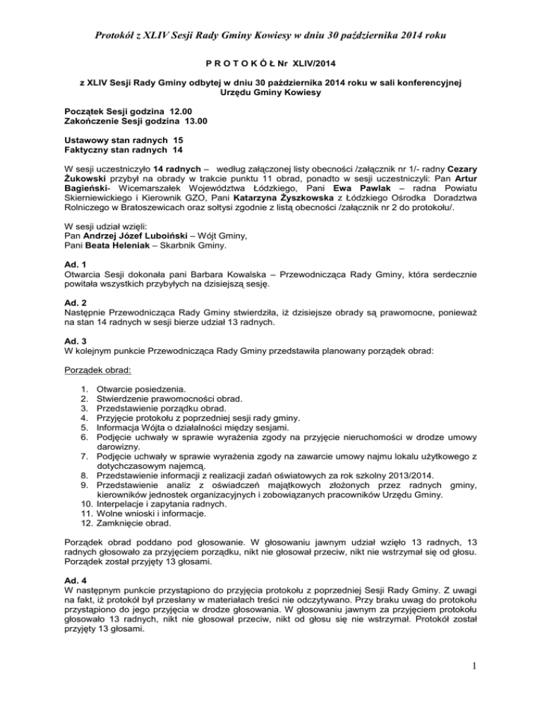Protokół z XLIV Sesji Rady Gminy Kowiesy w dniu 30 października 2014 roku P R O T O K Ó Ł Nr XLIV/2014 z XLIV Sesji Rady Gminy odbytej w dniu 30 października 2014 roku w sali konferencyjnej Urzędu Gminy Kowiesy Początek Sesji godzina 12.00 Zakończenie Sesji godzina 13.00 Ustawowy stan radnych 15 Faktyczny stan radnych 14 W sesji uczestniczyło 14 radnych – według załączonej listy obecności /załącznik nr 1/- radny Cezary Żukowski przybył na obrady w trakcie punktu 11 obrad, ponadto w sesji uczestniczyli: Pan Artur Bagieński- Wicemarszałek Województwa Łódzkiego, Pani Ewa Pawlak – radna Powiatu Skierniewickiego i Kierownik GZO, Pani Katarzyna Żyszkowska z Łódzkiego Ośrodka Doradztwa Rolniczego w Bratoszewicach oraz sołtysi zgodnie z listą obecności /załącznik nr 2 do protokołu/. W sesji udział wzięli: Pan Andrzej Józef Luboiński – Wójt Gminy, Pani Beata Heleniak – Skarbnik Gminy. Ad. 1 Otwarcia Sesji dokonała pani Barbara Kowalska – Przewodnicząca Rady Gminy, która serdecznie powitała wszystkich przybyłych na dzisiejszą sesję. Ad. 2 Następnie Przewodnicząca Rady Gminy stwierdziła, iż dzisiejsze obrady są prawomocne, ponieważ na stan 14 radnych w sesji bierze udział 13 radnych. Ad. 3 W kolejnym punkcie Przewodnicząca Rady Gminy przedstawiła planowany porządek obrad: Porządek obrad: 1. 2. 3. 4. 5. 6. 7. 8. 9. 10. 11. 12. Otwarcie posiedzenia. Stwierdzenie prawomocności obrad. Przedstawienie porządku obrad. Przyjęcie protokołu z poprzedniej sesji rady gminy. Informacja Wójta o działalności między sesjami. Podjęcie uchwały w sprawie wyrażenia zgody na przyjęcie nieruchomości w drodze umowy darowizny. Podjęcie uchwały w sprawie wyrażenia zgody na zawarcie umowy najmu lokalu użytkowego z dotychczasowym najemcą. Przedstawienie informacji z realizacji zadań oświatowych za rok szkolny 2013/2014. Przedstawienie analiz z oświadczeń majątkowych złożonych przez radnych gminy, kierowników jednostek organizacyjnych i zobowiązanych pracowników Urzędu Gminy. Interpelacje i zapytania radnych. Wolne wnioski i informacje. Zamknięcie obrad. Porządek obrad poddano pod głosowanie. W głosowaniu jawnym udział wzięło 13 radnych, 13 radnych głosowało za przyjęciem porządku, nikt nie głosował przeciw, nikt nie wstrzymał się od głosu. Porządek został przyjęty 13 głosami. Ad. 4 W następnym punkcie przystąpiono do przyjęcia protokołu z poprzedniej Sesji Rady Gminy. Z uwagi na fakt, iż protokół był przesłany w materiałach treści nie odczytywano. Przy braku uwag do protokołu przystąpiono do jego przyjęcia w drodze głosowania. W głosowaniu jawnym za przyjęciem protokołu głosowało 13 radnych, nikt nie głosował przeciw, nikt od głosu się nie wstrzymał. Protokół został przyjęty 13 głosami. 1 Protokół z XLIV Sesji Rady Gminy Kowiesy w dniu 30 października 2014 roku Ad. 5 Kolejny punkt to informacja Wójta o działalności między sesjami. Pani Przewodnicząca oddała głos Wójtowi Gminy, który przedstawił informację z działalności między sesjami jak poniżej: Z zakresu zadań inwestycyjnych. 1. Rozliczenie budowy drogi nr 115152E zostało przekazane do Łódzkiego Urzędu Wojewódzkiego w Łodzi i Urzędu Marszałkowskiego w Łodzi. 2. W dniu 30 września został złożony wniosek do Łódzkiego Urzędu Wojewódzkiego w Łodzi do naboru w ramach Narodowego Programu Przebudowy Dróg Lokalnych -etap II. Wniosek dotyczy drogi w Chrzczonowicach nr 115158 /od kapliczki do wiaduktu nad S-8/. W zakresie budowy są dwie warstwy asfaltu o grubości 3 i 4 cm. Łączny koszt zadania to 371.060,00 zł. Wystąpiliśmy o dofinansowanie w wysokości 50%. 3. Place zabaw przy Szkole Podstawowej w Kowiesach zostały odebrane. Ponadto plac zabaw wybudowany w ramach programu „Radosna Szkoła” został sprawdzony i odebrany przez firmę zewnętrzną pracującą na rzecz Łódzkiego Kuratorium Oświaty w Łodzi. Po obradach sesji Rady Gminy będziecie mogli Państwo zobaczyć jak wyglądają te place zabaw i to co pozostało z placu zabaw wybudowanego w 2006 roku. 4. Dodatkowe prace remontowe w budynku socjalnym w Wymysłowie zostały zakończone i odebrane. Czekamy na przyłącze energetyczne wykonywane przez PGE Dystrybucja. 5. Budowa linii oświetlenia ulicznego w Wędrogowie jest zakończona. Czekamy na odbiór przez PGE Dystrybucja. Budowa oświetlenia ulicznego w Chojnacie trwa i w przyszłym tygodniu powinna być zakończona. Obecnie z uwagi na wzmożony ruch pojazdów przy cmentarzu wykonawca nie może prowadzić prac. 6. W dniu 23 października odbyło się spotkanie w Kowiesach z przedstawicielem firmy projektowej z Łodzi na wykonanie projektu rozbudowy Szkoły Podstawowej w Kowiesach. W listopadzie firma przedstawi dwie różne koncepcje do zapoznania się radnym, rodzicom i nauczycielom. Po konsultacjach zostanie wybrana koncepcja do realizacji. Termin wykonania dokumentacji to połowa marca przyszłego roku. 7. W dniu 28 października została podpisana umowa z Zarządem Województwa o dofinansowanie w wysokości 75% kosztów kwalifikowanych budowy sieci wodociągowej dla Paplinka, Lisnej i zachodniej części Chrzczonowic o długości ponad 17 km. Kwota dofinansowania wynosi 1.773.592,00 zł. Jest to trzecia umowa Gminy Kowiesy od 2010 roku na dofinansowywanie zadań z podstawowych usług dla gospodarki i ludności wiejskiej. W przyszłym tygodniu ogłosimy przetarg na wyłonienie wykonawcy tego zadania, które musimy zrealizować do końca maja 2015r. 8. Trwa realizacja projektu „Eliminacja wykluczenia cyfrowego w Gminie Kowiesy”. Odbyły się szkolenia dla beneficjentów ostatecznych z zakresu obsługi sprzętu i programów komputerowych. Cały sprzęt jest już w urzędzie gminy i będzie zainstalowany u poszczególnych beneficjentów. Sprawy bieżące. 1. W dniu 5 października uczestniczyłem w I części wizytacji parafii Jeruzal przez księdza Biskupa Andrzeja Franciszk