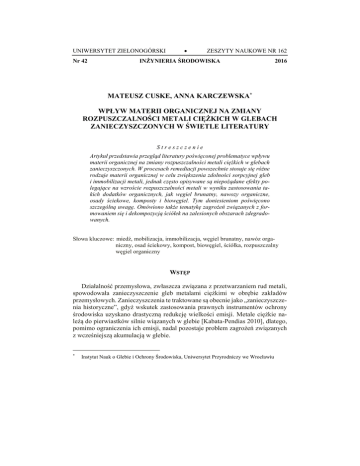 UNIWERSYTET ZIELONOGÓRSKI Nr 42 ZESZYTY NAUKOWE NR 162 INŻYNIERIA ŚRODOWISKA 2016 MATEUSZ CUSKE, ANNA KARCZEWSKA* WPŁYW MATERII ORGANICZNEJ NA ZMIANY ROZPUSZCZALNOŚCI METALI CIĘŻKICH W GLEBACH ZANIECZYSZCZONYCH W ŚWIETLE LITERATURY Streszczenie Artykuł przedstawia przegląd literatury poświęconej problematyce wpływu materii organicznej na zmiany rozpuszczalności metali ciężkich w glebach zanieczyszczonych. W procesach remediacji powszechnie stosuje się różne rodzaje materii organicznej w celu zwiększenia zdolności sorpcyjnej gleb i immobilizacji metali, jednak często opisywane są niepożądane efekty polegające na wzroście rozpuszczalności metali w wyniku zastosowania takich dodatków organicznych, jak węgiel brunatny, nawozy organiczne, osady ściekowe, komposty i biowęgiel. Tym doniesieniom poświęcono szczególną uwagę. Omówiono także tematykę zagrożeń związanych z formowaniem się i dekompozycją ściółek na zalesionych obszarach zdegradowanych. Słowa kluczowe: miedź, mobilizacja, immobilizacja, węgiel brunatny, nawóz organiczny, osad ściekowy, kompost, biowęgiel, ściółka, rozpuszczalny węgiel organiczny WSTĘP Działalność przemysłowa, zwłaszcza związana z przetwarzaniem rud metali, spowodowała zanieczyszczenie gleb metalami ciężkimi w obrębie zakładów przemysłowych. Zanieczyszczenia te traktowane są obecnie jako „zanieczyszczenia historyczne”, gdyż wskutek zastosowania prawnych instrumentów ochrony środowiska uzyskano drastyczną redukcję wielkości emisji. Metale ciężkie należą do pierwiastków silnie wiązanych w glebie [Kabata-Pendias 2010], dlatego, pomimo ograniczenia ich emisji, nadal pozostaje problem zagrożeń związanych z wcześniejszą akumulacją w glebie. * Instytut Nauk o Glebie i Ochrony Środowiska, Uniwersytet Przyrodniczy we Wrocławiu 40 M. Cuske, A. Karczewska Strategie remediacji obszarów zanieczyszczonych metalami ciężkimi opierają się przede wszystkim na unieruchamianiu zanieczyszczeń w fazie stałej gleby [Bradl 2005; Iskandar 2000]. Takie podejście wynika przede wszystkim z ograniczeń technologicznych, a także wysokich kosztów i możliwych skutków ubocznych ewentualnego usuwania zanieczyszczeń. W świetle nowelizacji zapisów ustawy Prawo ochrony środowiska [Ustawa 2014], z roku 2014, zgodnie z art. 101q, wymienione uwarunkowania mogą być podstawą do odstąpienia od usuwania zanieczyszczeń, a remediacja obszarów zdegradowanych może polegać na samooczyszczaniu, jeżeli przynosi to największe korzyści dla środowiska [Karczewska 2014]. W celu immobilizacji metali ciężkich w glebach powszechnie stosuje się wapnowanie (modyfikacja pH) oraz zwiększenie pojemności sorpcyjnej gleb poprzez aplikację materii organicznej, syntetycznych sorbentów bądź materiałów bogatych we frakcje ilaste. Stosowanie materii organicznej, np. w postaci kompostów lub osadów ściekowych, w glebach może prowadzić do niekontrolowanego wzrostu rozpuszczalności metali ciężkich w wyniku kompleksującego działania niskocząsteczkowej materii organicznej [Park i in. 2011; Wu i in. 2003] lub wskutek modyfikacji odczynu. Dodatkowym źródłem materii organicznej w poddanych remediacji glebach zanieczyszczonych mogą być reszki roślinne. Fitostabilizacja obszarów zanieczyszczonych metalami ciężkimi, z wykorzystaniem traw i innych roślin zielnych lub drzew, ma na celu przeciwdziałanie erozji wietrznej i wodnej, poprawę właściwości fizycznych gleb, a także fitosanitarną izolację terenu. Jednak formowanie się ściółek na powierzchni gleb zalesionych, a następnie ich dekompozycja i uwalnianie niskocząsteczkowych kwasów organicznych może spowodować kompleksowanie bądź chelatowanie metali ciężkich i ich ługowanie w głąb profilu glebowego [Smal i Misztal 1996; Hongve i in. 2000]. Niniejszy artykuł prezentuje przegląd badań nad zmianami rozpuszczalności metali ciężkich, a w szczególności Cu, Zn i Pb, pod wpływem materii organicznej stosowanej w postaci dodatków organicznych w procesach remediacji gleb zanieczyszczonych, w świetle publikacji krajowych i światowych. Uwzględniono też problematykę wpływu ściółek leśnych na modyfikację rozpuszczalności metali ciężkich. Najważniejsze wnioski wynikające z przeglądu literatury zostały uwzględnione przy interpretacji wyników badań przeprowadzonych przez autorów na glebach z rejonu strefy ograniczonego użytkowania Huty Miedzi Legnica. WIĄZANIE METALI CIĘŻKICH PRZEZ SUBSTANCJĘ ORGANICZNĄ Metale ciężkie mogą być wiązane przez substancje organiczne zarówno na zasadzie sorpcji wymiennej jak i kompleksowania bądź chelatowania [Karczew- Wpływ materii organicznej na zmiany … 41 ska 2002; McBride 1989; 1994]. Pojemność sorpcyjna substancji organicznej wobec kationów jest zazwyczaj znacznie większa od minerałów ilastych. Zależy od właściwości i stopnia shumifikowania materii organicznej, a dodatkowo, w związku z obecnością ładunków zmiennych, także od pH. Reakcje kompleksowania polegają na przyłączaniu się metali do grup funkcyjnych kwasów huminowych i fulwowych zawierających tlen, azot bądź siarkę [Senesi 1992]. Szczególnym powinowactwem do kationów Zn2+, Ni2+, Mn2+, ale także Cu2+, charakteryzują się grupy aminowe i amidowe [Karczewska 2002, Xue i Sigg 1999]. W procesie chelatowania metal, stanowiący jon centralny, wiąże się z kilkoma atomami tej samej cząsteczki ligandu, o kleszczowej, przestrzennej strukturze. Podatność jonów metali na tworzenie połączeń kompleksowych i chelatów z rozpuszczalną materią organiczną jest różna w zależności od struktury związków organicznych oraz od pH roztworu. Kompleksowe połączenia metali ciężkich charakteryzują się różną rozpuszczalnością [Karczewska 2002]. Generalnie, obecność w glebie ustabilizowanej, nierozpuszczalnej, materii organicznej, bogatej w wysokocząsteczkowe kwasy humuso
