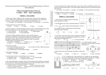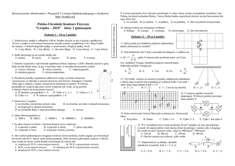 Stowarzyszenie Absolwentów i Przyjaciół V Liceum Ogólnokształcącego w Krakowie http://lwiatko.org 9. Czworo pasażerów leci czterema samolotami w cztery strony świata, na podobnej wysokości, nad Polską, tuż przed zachodem Słońca. Tarcza Słońca będzie najszybciej chować się pod horyzontem dla tego, który leci A. na wschód, B. na zachód, C. na północ, D. na południe. E. Dla wszystkich równocześnie. © Copyright by SAiP V LO Kraków Polsko-Ukraiński Konkurs Fizyczny “Lwiątko – 2010” klasy 3 gimnazjum Zadania 1 – 10 za 3 punkty 1. Zobaczywszy małpę w odległości 100 m, lwiątko ruszyło za nią w pościg z prędkością 10 m/s, a małpa w tym samym momencie zaczęła uciekać z prędkością 5 m/s. Bieg lwiątka do miejsca, w którym dogoniło małpę, w porównaniu z biegiem małpy, trwał A. 3 razy dłużej, B. 2 razy dłużej, C. tak samo długo, D. 2 razy krócej, E. 3 razy krócej. 2. Statki utrzymują się na wodzie dzięki sile A. nośnej, B. tarcia, C. wyporu, D. oporu, E. wyższej. 3. Dziecko wypuściło z ręki balonik napełniony helem, kupiony w ZOO. Balonik uleciał w górę. Stało się tak dzięki temu, że gaz w baloniku miał, w stosunku do powietrza wokół, A. wyższe ciśnienie, B. niższe ciśnienie, C. większą gęstość, D. mniejszą gęstość, E. niższą temperaturę. 4. Plastikową butelkę wypełniono całkowicie wodą, szczelnie zakręcono i powieszono za zakrętkę w pozycji pionowej nad zlewem. Następnie w butelkę wbito igłę w jednym z miejsc oznaczonych numerami (rysunek). W którym przypadku po wyjęciu igły przez otwór wypłynie tyle wody, że jej poziom w butelce obniży się do poziomu otworu? A. W każdym z przypadków 1–4. B. Tylko w 1, 2, 3. C. Tylko w 1, 2. D. Tylko w 1. E. W żadnym z przypadków 1–4. D. 1000000 J, 12. Pod działaniem siły F pręt o początkowej długości l wydłuża się o l l F , gdzie S oznacza pole przekroju pręta, zaś E jest S E 1 A. N , m B. N, C. J·m, A 4 7. Są takie miejsca na Ziemi, z których Księżyc bywa widoczny A. wyłącznie w pełni, B. wyłącznie w dzień, C. przez całą dobę, D. wyłącznie w nocy, E. wyłącznie wiosną i jesienią. 8. Aby ruchem jednostajnym wciągnąć wózek po równi pochyłej, trzeba ciągnąć go (równolegle do równi) siłą 50 N. Opory ruchu można pominąć. Żeby również jednostajnie opuścić w dół ten sam wózek po równi, trzeba działać (równolegle do równi) siłą A. większą niż 50 N, o tym samym zwrocie, B. 50 N, o przeciwnym zwrocie, C. 50 N, o tym samym zwrocie, D. mniejszą niż 50 N, o przeciwnym zwrocie, E. mniejszą niż 50 N, o tym samym zwrocie. D. Pa, E. N . m3 13. Trzy kulki, wiszące na niciach (rysunek), naładowano ładunkami o takiej samej wartości bezwzględnej Q. Ładunek kulki 3 ma znak +. Jakie znaki mają ładunki kulek 1 i 2? A. 1+, 2+, B. 1+, 2–, C. 1+, 2 nie da się określić, S E. 3600000 J. A BC D E 11. Który punkt jest środkiem ciężkości jednorodnej płytki, pokazanej na rysunku? 1Q 2Q D. 1–, 2+, 3 Q E. 1–, 2–. 14. F oznacza ognisko soczewki skupiającej. W którym punkcie powstaje obraz punktu S? F 2 F B C D 4 1 E 15. Które żaróweczki świecą? Bateryjki są identyczne. Żaróweczki także. A. Wszystkie. B. Żadna. C. Tylko 1 i 4. D. Tylko 2 i 3. 15 cm C. 60000 J, E. Jest niewidoczny. Zadania 11 – 20 za 4 punkty 5. Dzień trwa 12 godzin A. na równiku, niezależnie od pory roku, B. na równiku, ale tylko w dniach równonocy, C. na biegunach w dniach równonocy, D. na zwrotniku Raka w dniu przesilenia letniego, E. zawsze. 6. Jedna kilowatogodzina to A. 1000 J, B. 3600 J, D. czerwonego. tzw. modułem Younga, charakteryzującym materiał pręta. Jednostką modułu Younga jest 2 3 10. Jakiego koloru jest roztopiony wolfram? A. białego, B. szarego, C. czarnego, 3 E. Tylko 1 lub tylko 4. 16. W U–kształtnej rurce o polu przekroju 10 cm2 znajduje się olej, jak pokazuje rysunek. Ile maksymalnie wody można dolać do jednego z ramion, aby z drugiego nie wylał się olej? Gęstości wody i oleju to 1000 kg/m3 i 800 kg/m3. A. 150 ml. B. 200 ml. C. 240 ml. D. 300 ml. E. Olej nie zacznie się wylewać, tylko woda. I1 A 17. Amperomierze są idealne, oporniki jednakowe (rysunek). Jeśli I2 = 2 A, to A. I1 = 0 A, B. I1 = 1 A, A R C. I1 = 2 A, D. I1 = 4 A, I2 R E. I1 = ∞. 18. Metalową kulkę 1, mającą ładunek elektryczny Q, zetknięto równocześnie z dwiema innymi, identycznymi ale nienaładowanymi kulkami 2 i 3, tak jak pokazuje rysunek. Ładunek, jaki pozostanie na kulce 1, ma wartość A. Q, B. Q/2, C. pomiędzy Q/2 i Q/3, D. Q/3, E. mniejszą od Q/3. 2 1 3 Q ? 19. Mars, podobnie jak Ziemia, obraca się wokół własnej osi z zachodu na wschód, ma też zbliżony do ziemskiego okres obrotu, nieco ponad 24 godziny. Fobos, jeden z dwóch księżyców Marsa, obiega tę planetę w ciągu około 8 godzin, w kierunku tym samym, co kierunek wirowania Marsa. Zatem Fobos A. wschodzi i zachodzi na wschodzie Marsa, B. wschodzi i zachodzi na zachodzie Marsa, C. wschodzi na wschodzie i zachodzi na zachodzie Marsa, D. wschodzi na zachodzie i zachodzi na wschodzie Marsa, E. jeśli z jakiegoś miejsca planety jest widoczny, to przez całą dobę. E A A. II, III, i IV. B. Tylko III i IV. C. Tylko II i IV. D. Tylko IV. E. Da się przez wszystkie. I II IV III 20. Wygięty i zamocowany jednym końcem drut równomiernie podgrzano. W którą stronę przesunie się jego drugi koniec? B D C F Zadania 21 – 30 za 5 punktów 21. Jakiej siły F trzeba użyć, aby utrzymać ładunek? Bloki i lina są nieważkie. Przyjmij g = 10 N/kg. A. 600 N. B. 300 N. C. 200 N. D. 150 N. E. 120 N. A 25. Oto peryskopy. Linie ukośne to płaskie zwierciadła. Schematy wiernie odwzorowują kąty i proporcje. Przez które peryskopy na pewno NIE DA się dostrzec odległej latarni? Peryskopy można przechylać. D B C 60 kg 22. Która wieża z klocków przewróci się? Klocki różnią się tylko długością. E. Wszys