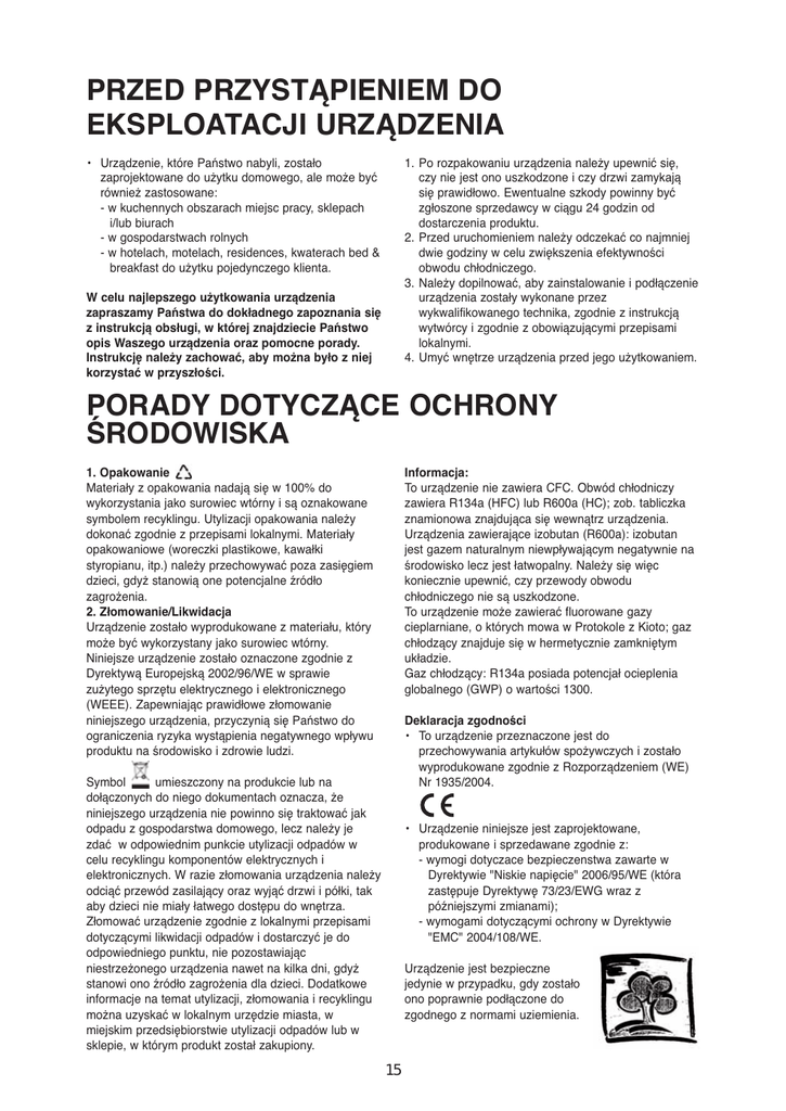 PRZED PRZYSTĄPIENIEM DO EKSPLOATACJI URZĄDZENIA • Urządzenie, które Państwo nabyli, zostało zaprojektowane do użytku domowego, ale może być również zastosowane: - w kuchennych obszarach miejsc pracy, sklepach i/lub biurach - w gospodarstwach rolnych - w hotelach, motelach, residences, kwaterach bed & breakfast do użytku pojedynczego klienta. 1. Po rozpakowaniu urządzenia należy upewnić się, czy nie jest ono uszkodzone i czy drzwi zamykają się prawidłowo. Ewentualne szkody powinny być zgłoszone sprzedawcy w ciągu 24 godzin od dostarczenia produktu. 2. Przed uruchomieniem należy odczekać co najmniej dwie godziny w celu zwiększenia efektywności obwodu chłodniczego. 3. Należy dopilnować, aby zainstalowanie i podłączenie urządzenia zostały wykonane przez wykwalifikowanego technika, zgodnie z instrukcją wytwórcy i zgodnie z obowiązującymi przepisami lokalnymi. 4. Umyć wnętrze urządzenia przed jego użytkowaniem. W celu najlepszego użytkowania urządzenia zapraszamy Państwa do dokładnego zapoznania się z instrukcją obsługi, w której znajdziecie Państwo opis Waszego urządzenia oraz pomocne porady. Instrukcję należy zachować, aby można było z niej korzystać w przyszłości. PORADY DOTYCZĄCE OCHRONY ŚRODOWISKA 1. Opakowanie Materiały z opakowania nadają się w 100% do wykorzystania jako surowiec wtórny i są oznakowane symbolem recyklingu. Utylizacji opakowania należy dokonać zgodnie z przepisami lokalnymi. Materiały opakowaniowe (woreczki plastikowe, kawałki styropianu, itp.) należy przechowywać poza zasięgiem dzieci, gdyż stanowią one potencjalne źródło zagrożenia. 2. Złomowanie/Likwidacja Urządzenie zostało wyprodukowane z materiału, który może być wykorzystany jako surowiec wtórny. Niniejsze urządzenie zostało oznaczone zgodnie z Dyrektywą Europejską 2002/96/WE w sprawie zużytego sprzętu elektrycznego i elektronicznego (WEEE). Zapewniając prawidłowe złomowanie niniejszego urządzenia, przyczynią się Państwo do ograniczenia ryzyka wystąpienia negatywnego wpływu produktu na środowisko i zdrowie ludzi. Informacja: To urządzenie nie zawiera CFC. Obwód chłodniczy zawiera R134a (HFC) lub R600a (HC); zob. tabliczka znamionowa znajdująca się wewnątrz urządzenia. Urządzenia zawierające izobutan (R600a): izobutan jest gazem naturalnym niewpływającym negatywnie na środowisko lecz jest łatwopalny. Należy się więc koniecznie upewnić, czy przewody obwodu chłodniczego nie są uszkodzone. To urządzenie może zawierać fluorowane gazy cieplarniane, o których mowa w Protokole z Kioto; gaz chłodzący znajduje się w hermetycznie zamkniętym układzie. Gaz chłodzący: R134a posiada potencjał ocieplenia globalnego (GWP) o wartości 1300. Deklaracja zgodności • To urządzenie przeznaczone jest do przechowywania artykułów spożywczych i zostało wyprodukowane zgodnie z Rozporządzeniem (WE) Nr 1935/2004. Symbol umieszczony na produkcie lub na dołączonych do niego dokumentach oznacza, że niniejszego urządzenia nie powinno się traktować jak odpadu z gospodarstwa domowego, lecz należy je zdać w odpowiednim punkcie utylizacji odpadów w celu recyklingu komponentów elektrycznych i elektronicznych. W razie złomowania urządzenia należy odciąć przewód zasilający oraz wyjąć drzwi i półki, tak aby dzieci nie miały łatwego dostępu do wnętrza. Złomować urządzenie zgodnie z lokalnymi przepisami dotyczącymi likwidacji odpadów i dostarczyć je do odpowiedniego punktu, nie pozostawiając niestrzeżonego urządzenia nawet na kilka dni, gdyż stanowi ono źródło zagrożenia dla dzieci. Dodatkowe informacje na temat utylizacji, złomowania i recyklingu można uzyskać w lokalnym urzędzie miasta, w miejskim przedsiębiorstwie utylizacji odpadów lub w sklepie, w którym produkt został zakupiony. • Urządzenie niniejsze jest zaprojektowane, produkowane i sprzedawane zgodnie z: - wymogi dotyczace bezpieczenstwa zawarte w Dyrektywie "Niskie napięcie" 2006/95/WE (która zastępuje Dyrektywę 73/23/EWG wraz z późniejszymi zmianami); - wymogami dotyczącymi ochrony w Dyrektywie "EMC" 2004/108/WE. Urządzenie jest bezpieczne jedynie w przypadku, gdy zostało ono poprawnie podłączone do zgodnego z normami uziemienia. 15 ŚRODKI OSTROŻNOŚCI I WSKAZÓWKI OGÓLNE INSTALACJA • Przemieszczanie oraz instalacja produktu muszą być wykonane przez dwie lub więcej osób. • Podczas przesuwania urządzenia należy uważać, aby nie uszkodzić posadzki (np. parkietu). • Podczas instalacji należy uważać, by produkt nie uszkodził przewodu zasilającego. • Nie ustawiać urządzenia zbyt blisko źródła ciepła. • W celu zagwarantowania odpowiedniej wentylacji należy pozostawić trochę wolnej przestrzeni z obydwu stron urządzenia oraz nad nim lub postąpić według szczegółowej instrukcji. • Należy uważać, aby nie przykrywać ani nie zatykać otworów wentylacyjnych urządzenia. • Należy uważać, aby nie uszkodzić obiegu czynnika chłodniczego w urządzeniu. • Zainstalować i wypoziomować urządzenie na podłodze będącej w stanie utrzymać jego ciężar, w odpowiednim do jego wymiarów i przeznaczenia pomieszczeniu. • Urządzenie należy ustawić w miejscu suchym i dobrze wentylowanym. Urządzenie zostało przewidziane do funkcjonowania w środowisku, w którym temperatura zawiera się w następujących zakresach, zależnych od klasy klimatycznej podanej na tabliczce znamionowej: sprawność urządzenia może ulec pogorszeniu, w przypadku dłuższej eksploatacji w temperaturze wyższej lub niższej w stosunku do podanego przedziału. Klasa klimatyczna T. otocz. (°C) T. otocz. (°F) SN od 10 do 32 od 50 do 90 N od 16 do 32 od 61 do 90 ST od 16 do 38 od 61 do 100 T od 16 do 43 od 61 do 110 BEZPIECZEŃSTWO • Nie wkładać do urządzenia opakowań spray lub pojemników, które zawierają gaz lub łatwopalne substancje. • Nie przechowywać i nie używać be
