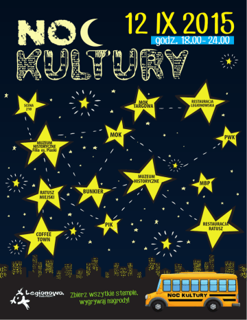 12 IX 2015 godz. 18.00- 24.00 MOK TARGOWA SCENA 210 RESTAURACJA LEGIONOWSKA MOK PWK MUZEUM HISTORYCZNE Filia os. Piaski MUZEUM HISTORYCZNE RATUSZ MIEJSKI MBP BUNKIER PIK COFFEE TOWN Zbierz wszytkie stemple, wygrywaj nagrody! RESTAURACJA RATUSZ Odwiedz wszystkie miejsca, zbierz stemple, wygrywaj nagrody! W przynajmniej 10 punktach, które biorą udział w Nocy Kultury zdobądź pieczątkę na pocztówce. Zbierz wszystkie i przyjdź po nagrodę do Urzędu Miasta Legionowo pok. 4.11. PARTNERZY: n etow coffe PATRONAT HONOROWY: Jan Grabiec, Wiceminister w Ministerstwie Administracji i Cyfryzacji PATRONAT MEDIALNY: 2 Legionowo. Porusza! po raz pierwszy podczas legionowskiej Nocy Kultury. Od godziny 18.00 do 24.00 wszystkie instytucje oraz partnerzy czekają na uczestników Nocy Kultury. Przygotowano dla Państwa atrakcyjne programy szyte na miarę kulturalnych potrzeb każdego mieszkańca. Już o 18.00 spod Ratusza wyrusza bezpłatny autobus, który kursował będzie aż do północy, dowożąc Państwa do każdego miejsca biorącego udział w wydarzeniu. W specjalnym punkcie informacji Nocy Kultury, znajdującym się w atrium Ratusza Miejskiego, otrzymacie Państwo pocztówki, które zabierzecie w podróż po kulturalnym Legionowie. W każdym punkcie można będzie zdobyć specjalną pieczątkę, a jeśli uda się zebrać ich aż 10 czekają upominki i gadżety (do odbioru w pokoju 4.11 od 14 września, w godzinach pracy urzędu). Upominki ufundowali: nagrody książkowe- Księgarnia u Leszka, vouchery do kawiarni- CoffeeTown, vouchery na kolację- restauracja Legionowska oraz gadżety miejskie- Urząd Miasta Legionowo. W Nocy Kultury udział biorą: Miejski Ośrodek Kultury w Legionowie, Powiatowa Instytucja Kultury w Legionowie, Miejska Biblioteka Publiczna w Legionowie, Muzeum Historyczne w Legionowie, Przedsiębiorstwo Wodociągowo-Kanalizacyjne Legionowo Sp. z o.o., Restauracja Ratusz, Restauracja Legionowska, CoffeeTown, Scena 210. Główne atrakcje w Ratuszu rozpoczną się występem iluzjonisty, następnie przewidziano koncert Krzysztofa Ścierańskiego, pokaz laserów, na zakończenie spektakl plenerowy Teatru ADONAI z legionowskiego MOKu.. Zachęcamy do spędzenia z nami tej jedynej i niepowtarzalnej nocy. Godziny odjazdu autobusu z danego punktu z krótkimi postojami: (pierwsza tura) 18.05 Urząd Miasta --> 18.15 MOK --> 18.24 Scena 210 --> 18.34 PIK / Biblioteka --> 18.40 Urząd Miasta / Restauracja Ratusz --> 18.45 Restauracja Legionowska --> 18.52 Muzeum Historyczne / Biblioteka --> 19.10 MOK Targowa --> 19.20 MOK Bunkier --> 19.28 Muzeum Filia Piaski / PWK --> 19.50 Urząd Miasta Atrakcje w autobusie: · wystawa prac Grupy Fotograficznej MIGAWKI · akordeonista, kulturalny poczęstunek · autobus będzie kursował między punktami biorącymi udział w wydarzeniu w godzinach 18.00-24.00 3 Impreze poprowadz i Tomasz 'Brzoza’ Brzezinski ru Spektakl teat ego ADONAI ewangelizacyjn Ratusz Miejski w Legionowie (Urząd Miasta Legionowo) Koncert Krzysztof a Scieranskie go Pokaz LASERÓW ul. Piłsudskiego 41, tel. 22 766 40 00 Ratusz Miejski to centrum wydarzeń, stąd wyruszać będzie autobus Nocy Kultury. W punkcie informacyjnym będzie można otrzymać widokówkę. • • • 19.00 wystąpi wirtuoz gitary basowej, jeden z najlepszych muzyków jazzowych w Polsce- Krzysztof Ścierański 21.30 pokaz jakiego w naszym mieście jeszcze nie było, dziedziniec Ratusza rozświetlą lasery 22.00 wielokrotnie nagradzany i uznany w kraju teatr ewangelizacyjny ADONAI wystąpi ze spektaklem “Powroty” Miejski Ośrodek Kultury w Legionowie ul. Norwida 10, tel. 22 784 44 99 Scena plenerowa lub sala widowiskowa: • 18.00 występ zespołu POD GÓRĘ ze studia SZACHRAJ oraz warsztaty wokalne • 19.00 prezentacja muzyczna instrumentu pozytyw, organista Michał Jung • 20.00 projekcja filmowa prezentacje Artystyczne działania warsztatowe: • zajęcia ceramiczne - Anna Wijatkowska • zajęcia plastyczne - Iga Malinowska • zajęcia dla najmłodszych - Klub Tygielek Działania towarzyszące: • spotkania z Chaplinem, współne fotografie • stoisko z pieczęcią placówki i materiałami raklamowo-informacyjnymi • kasa biletowa - bilety na imprazy MOK-u 4 Filia Miejskiego Ośrodka Kultury ul. Targowa 65, tel. 22 784 14 22 Artystyczne działania warsztatowe: • 18.00 balet dla dzieci • 19.00 taniec dla dzieci -Alexia Dance Studio • 18.00 umuzykalnianie dla dzieci • 19.30 Studio Teatralno-Edukacyjne • 18.00 malarstwo dla dzieci • 20.00 malarstwo dla młodzieży • 21.00 malarstwo dla dorosłych • 21.00 zajęcia Tai-chi i Chi-Kung • 20.30 tańce w kręgu dla seniorów • • • Wieczorne i nocne czytanie: dzieci od 18.00, dorośli od 21.00 18.00-21.00 zdjęcia portretowe, „poślubne monidło” Stanisław Gadomski 22.00 koncert fortepianowy w wykonaniu Marii Silwy Studio Nagrań Bunkier ul. P. O. W. 20, Kozłówka Otwarta próba zespołu BANG BANG, gawędy muzyczne Targowisko Miejskie, Kino samochodowe • 20.15 film Kamerdyner, reż. Lee Daniels Ratusz Miejski (działania organizowane przez MOK) Film Kamerd yner w kinie sam ochodowym ul. Piłsudskiego 41 Sala widowiskowa: • 18.00 pokaz baletowy połączony z warsztatem • 19.00 występ Teatru Muzycznego Nikt mnie nie chce Galeria Sztuki Ratusz: • 20.00 projekcja filmowa, prezentacje multimedialne • 20.00 przytul się do fantazji Hieronima Bosha - projekt fotograficzny Dziedziniec: • 22.00 spektakl Teatru Ewangelizacyjnego ADONAI „Powroty” .. i wiele innych atrakcji. 5 Miejska Biblioteka Publiczna w Legionowie ul. Broniewskiego 7, tel. 22 774 13 13 Druk – od gęsiego pióra do druku 3D • warsztaty kaligraficzne – prowadzący Scriptorium Villa Nova w rekonstrukcji stroju z XVII w. zaprezentuje pismo, osprzęt pisarski, pióra, kałamarze, dawne oprawy książkowe, różne rodzaje czcionek; • warsztaty drukarskie – offset, płyty drukarskie, specjalnie przygotowane okolicznościowe linoryty, druk wypuk