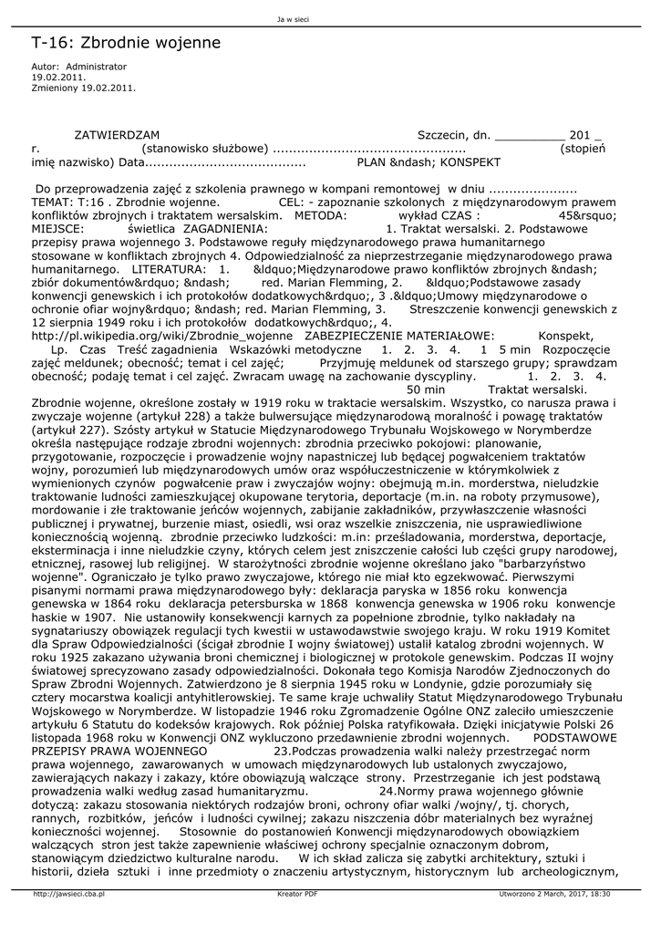 Ja w sieci T-16: Zbrodnie wojenne Autor: Administrator 19.02.2011. Zmieniony 19.02.2011. ZATWIERDZAM Szczecin, dn. __________ 201 _ r. (stanowisko służbowe) ................................................ (stopień imię nazwisko) Data........................................ PLAN – KONSPEKT Do przeprowadzenia zajęć z szkolenia prawnego w kompani remontowej w dniu ...................... TEMAT: T:16 . Zbrodnie wojenne. CEL: - zapoznanie szkolonych z międzynarodowym prawem konfliktów zbrojnych i traktatem wersalskim. METODA: wykład CZAS : 45’ MIEJSCE: świetlica ZAGADNIENIA: 1. Traktat wersalski. 2. Podstawowe przepisy prawa wojennego 3. Podstawowe reguły międzynarodowego prawa humanitarnego stosowane w konfliktach zbrojnych 4. Odpowiedzialność za nieprzestrzeganie międzynarodowego prawa humanitarnego. LITERATURA: 1. “Międzynarodowe prawo konfliktów zbrojnych – zbiór dokumentów” – red. Marian Flemming, 2. “Podstawowe zasady konwencji genewskich i ich protokołów dodatkowych”, 3 .“Umowy międzynarodowe o ochronie ofiar wojny” – red. Marian Flemming, 3. Streszczenie konwencji genewskich z 12 sierpnia 1949 roku i ich protokołów dodatkowych”, 4. http://pl.wikipedia.org/wiki/Zbrodnie_wojenne ZABEZPIECZENIE MATERIAŁOWE: Konspekt, Lp. Czas Treść zagadnienia Wskazówki metodyczne 1. 2. 3. 4. 1 5 min Rozpoczęcie zajęć meldunek; obecność; temat i cel zajęć; Przyjmuję meldunek od starszego grupy; sprawdzam obecność; podaję temat i cel zajęć. Zwracam uwagę na zachowanie dyscypliny. 1. 2. 3. 4. 50 min Traktat wersalski. Zbrodnie wojenne, określone zostały w 1919 roku w traktacie wersalskim. Wszystko, co narusza prawa i zwyczaje wojenne (artykuł 228) a także bulwersujące międzynarodową moralność i powagę traktatów (artykuł 227). Szósty artykuł w Statucie Międzynarodowego Trybunału Wojskowego w Norymberdze określa następujące rodzaje zbrodni wojennych: zbrodnia przeciwko pokojowi: planowanie, przygotowanie, rozpoczęcie i prowadzenie wojny napastniczej lub będącej pogwałceniem traktatów wojny, porozumień lub międzynarodowych umów oraz współuczestniczenie w którymkolwiek z wymienionych czynów pogwałcenie praw i zwyczajów wojny: obejmują m.in. morderstwa, nieludzkie traktowanie ludności zamieszkującej okupowane terytoria, deportacje (m.in. na roboty przymusowe), mordowanie i złe traktowanie jeńców wojennych, zabijanie zakładników, przywłaszczenie własności publicznej i prywatnej, burzenie miast, osiedli, wsi oraz wszelkie zniszczenia, nie usprawiedliwione koniecznością wojenną. zbrodnie przeciwko ludzkości: m.in: prześladowania, morderstwa, deportacje, eksterminacja i inne nieludzkie czyny, których celem jest zniszczenie całości lub części grupy narodowej, etnicznej, rasowej lub religijnej. W starożytności zbrodnie wojenne określano jako "barbarzyństwo wojenne". Ograniczało je tylko prawo zwyczajowe, którego nie miał kto egzekwować. Pierwszymi pisanymi normami prawa międzynarodowego były: deklaracja paryska w 1856 roku konwencja genewska w 1864 roku deklaracja petersburska w 1868 konwencja genewska w 1906 roku konwencje haskie w 1907. Nie ustanowiły konsekwencji karnych za popełnione zbrodnie, tylko nakładały na sygnatariuszy obowiązek regulacji tych kwestii w ustawodawstwie swojego kraju. W roku 1919 Komitet dla Spraw Odpowiedzialności (ścigał zbrodnie I wojny światowej) ustalił katalog zbrodni wojennych. W roku 1925 zakazano używania broni chemicznej i biologicznej w protokole genewskim. Podczas II wojny światowej sprecyzowano zasady odpowiedzialności. Dokonała tego Komisja Narodów Zjednoczonych do Spraw Zbrodni Wojennych. Zatwierdzono je 8 sierpnia 1945 roku w Londynie, gdzie porozumiały się cztery mocarstwa koalicji antyhitlerowskiej. Te same kraje uchwaliły Statut Międzynarodowego Trybunału Wojskowego w Norymberdze. W listopadzie 1946 roku Zgromadzenie Ogólne ONZ zaleciło umieszczenie artykułu 6 Statutu do kodeksów krajowych. Rok później Polska ratyfikowała. Dzięki inicjatywie Polski 26 listopada 1968 roku w Konwencji ONZ wykluczono przedawnienie zbrodni wojennych. PODSTAWOWE PRZEPISY PRAWA WOJENNEGO 23.Podczas prowadzenia walki należy przestrzegać norm prawa wojennego, zawarowanych w umowach międzynarodowych lub ustalonych zwyczajowo, zawierających nakazy i zakazy, które obowiązują walczące strony. Przestrzeganie ich jest podstawą prowadzenia walki według zasad humanitaryzmu. 24.Normy prawa wojennego głównie dotyczą: zakazu stosowania niektórych rodzajów broni, ochrony ofiar walki /wojny/, tj. chorych, rannych, rozbitków, jeńców i ludności cywilnej; zakazu niszczenia dóbr materialnych bez wyraźnej konieczności wojennej. Stosownie do postanowień Konwencji międzynarodowych obowiązkiem walczących stron jest także zapewnienie właściwej ochrony specjalnie oznaczonym dobrom, stanowiącym dziedzictwo kulturalne narodu. W ich skład zalicza się zabytki architektury, sztuki i historii, dzieła sztuki i inne przedmioty o znaczeniu artystycznym, historycznym lub archeologicznym, http://jawsieci.cba.pl Kreator PDF Utworzono 2 March, 2017, 18:30 Ja w sieci jak również zbiory naukowe, książek i archiwaliów oraz gmachy, których przeznaczeniem jest ich przechowywanie lub wystawianie. 25.Normy prawa wojennego dotyczą także stosowania środków walki. W czasie jej prowadzenia zabrania się używania: trucizn, gazów trujących i duszących, broni chemicznej i bakteriologicznej, pocisków rozpłaszczających się w ciele, pokrytych nacięciami, nie mających powłoki zewnętrznej lub rażących odłamkami niewykrywalnymi przez promienie rentgenowskie; min, które nie mają urządzeń umożliwiających ich rozbrojenie; min - pułapek oraz rodzajów broni charakteryzującej się nieprzewidzianymi skutkami działania, stosowanej przeciwko ludności cywilnej i środowisku naturalnemu. 26.Podczas walki zabrania się również: zabijania w