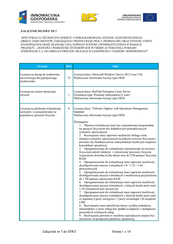 ZAŁĄCZNIK DO SIWZ NR 5 SPECYFIKACJA TECHNICZNA SPRZĘTU I OPROGRAMOWANIA SYSTEMU ELEKTRONICZNEGO OBIEGU DOKUMENTÓW, ZARZĄDZANIA PRZEPŁYWAMI PRACY (WORKFLOW) ORAZ SYSTEMU FORTE STANOWIĄCEGO BAZĘ TRANSAKCYJNĄ NOWEGO SYSTEMU INFORMATYCZNEGO W RAMACH PROJEKTU „DOSTAWA I WDROŻENIE SYSTEMÓW B2B W FIRMIE AUTOMATYKA-POMIARYSTEROWANIE S.A. DO OBSŁUGI PROCESU REALIZACJI ZAMÓWIENIA I NADZORU SERWISOWEGO” Licencje Licencje na dostęp do środowiska serwerowego dla pojedynczego użytkownika Licencja na system operacyjny serwera Licencja na platformę wirtualizacji serwerów. Licencjonowanie na pojedynczy procesor fizyczny Ilość 73 1 8 Opis Licencja klasy: Microsoft Windows Server 2012 User CAL Wykluczone oferowanie licencji typu OEM. Licencja klasy: Red Hat Enterprise Linux Server Gwarancja typu: Premium Subscription (3 year) Wykluczone oferowanie licencji typu OEM. Licencja klasy: VMware vSphere with Operations Management Standard Wykluczone oferowanie licencji typu OEM. Wymagania: 1. Warstwa wirtualizacji musi być zainstalowana bezpośrednio na sprzęcie fizycznym bez dodatkowych pośredniczących systemów operacyjnych 2. Rozwiązanie musi zapewnić możliwość obsługi wielu instancji systemów operacyjnych na jednym serwerze fizycznym i powinno się charakteryzować maksymalnym możliwym stopniem konsolidacji sprzętowej. 3. Oprogramowanie do wirtualizacji zainstalowane na serwerze fizycznym potrafi obsłużyć i wykorzystać procesory fizyczne wyposażone dowolną liczbę rdzeni oraz do 2TB pamięci fizycznej RAM. 4. Oprogramowanie do wirtualizacji musi zapewnić możliwość skonfigurowania maszyn wirtualnych 1-8 / 1-32 / 1-64 procesorowych. 5. Oprogramowanie do wirtualizacji musi zapewnić możliwość skonfigurowania maszyn wirtualnych z możliwością przydzielenia do 1 TB pamięci operacyjnej RAM. 6. Oprogramowanie do wirtualizacji musi zapewnić możliwość skonfigurowania maszyn wirtualnych z których każda może mieć 1-10 wirtualnych kart sieciowych. 7. Oprogramowanie do wirtualizacji musi zapewnić możliwość skonfigurowania maszyn wirtualnych, z których każda może mieć co najmniej 4 porty szeregowe i 3 porty równoległe i 20 urządzeń USB. 8. Rozwiązanie musi umożliwiać łatwą i szybką rozbudowę infrastruktury o nowe usługi bez spadku wydajności i dostępności pozostałych wybranych usług. 9. Rozwiązanie powinno w możliwie największym stopniu być niezależne od producenta platformy sprzętowej. Załącznik nr 5 do SIWZ Strona 1 z 18 10. Polityka licencjonowania musi umożliwiać przenoszenie licencji na oprogramowanie do wirtualizacji pomiędzy serwerami różnych producentów z zachowaniem wsparcia technicznego i zmianą wersji oprogramowania na niższą (downgrade). Licencjonowanie nie może odbywać się w trybie OEM. 11. Rozwiązanie musi wspierać następujące systemy operacyjne: MS-DOS 6.22, Windows 3.1, Windows 95, Windows 98, Windows XP, Windows Vista , Windows NT 4.0, Windows 2000, Windows Server 2003, Windows Server 2008, Windows Server 2012, Windows 7, Windows 8, SLES 11, SLES 10, SLES 9, SLES 8, RHEL 6, RHEL 5, RHEL 4, RHEL 3, Solaris 11 ,Solaris 10, Solaris 9, Solaris 8, OS/2 Warp 4.0, NetWare 6.5, NetWare 6, NetWare 5, OEL 4, OEL 5, Debian, CentOS, FreeBSD, Asianux, Mandriva, Ubuntu 12.04, SCO OpenServer, SCO Unixware, Mac OS X. 12. Rozwiązanie musi umożliwiać przydzielenie większej ilości pamięci RAM dla maszyn wirtualnych niż fizyczne zasoby RAM serwera w celu osiągnięcia maksymalnego współczynnika konsolidacji. 13. Rozwiązanie musi umożliwiać udostępnienie maszynie wirtualnej większej ilości zasobów dyskowych niż jest fizycznie zarezerwowane na dyskach lokalnych serwera lub na macierzy. 14. Rozwiązanie powinno posiadać centralną konsolę graficzną do zarządzania maszynami wirtualnymi i do konfigurowania innych funkcjonalności. Centralna konsola graficzna powinna mieć możliwość działania zarówno jako aplikacja na maszynie fizycznej lub wirtualnej jak i jako gotowa, wstępnie skonfigurowana maszyna wirtualna tzw. virtual appliance. 15. Rozwiązanie musi zapewnić możliwość bieżącego monitorowania wykorzystania zasobów fizycznych infrastruktury wirtualnej (np. wykorzystanie procesorów, pamięci RAM, wykorzystanie przestrzeni na dyskach/wolumenach) oraz przechowywać i wyświetlać dane maksymalnie sprzed roku. 16. Oprogramowanie do wirtualizacji powinno zapewnić możliwość wykonywania kopii migawkowych instancji systemów operacyjnych (tzw. snapshot) na potrzeby tworzenia kopii zapasowych bez przerywania ich pracy. 17. Oprogramowanie do wirtualizacji musi zapewnić możliwość klonowania systemów operacyjnych wraz z ich pełną konfiguracją i danymi. 18. Oprogramowanie do wirtualizacji oraz oprogramowanie zarządzające musi posiadać możliwość integracji z usługami katalogowymi Microsoft Active Directory. 19. Rozwiązanie musi zapewniać mechanizm bezpiecznego uaktualniania warstwy wirtualizacyjnej (hosta, maszyny wirtualnej) bez potrzeby wyłączania wirtualnych maszyn. 20. Rozwiązanie musi zapewnić wbudowany mechanizm do bezpiecznej automatycznej archiwizacji i odtwarzania wskazanych maszyn wirtualnych. Mechanizm ten musi umożliwiać również odtwarzanie pojedynczych plików z kopii zapasowej oraz zapewnia stosowanie deduplikacji dla kopii zapasowych. 21. Rozwiązanie musi zapewniać mechanizm replikacji wskazanych maszyn wirtualnych w obrębie klastra serwerów fizycznych. 22. Rozwiązanie musi mieć możliwość przenoszenia maszyn wirtualnych w czasie ich pracy pomiędzy serwerami fizycznymi. Mechanizm powinien umożliwiać 4 lub więcej takich procesów przenoszenia jednocześnie. Załącznik nr 5 do SIWZ Strona 2 z 18 23. Rozwiązanie musi mieć możliwość przenoszenia zwirtualizowanych dysków maszyn wirtualnych w czasie ich pracy pomiędzy fizycznymi zasobami dyskowymi. 24. Musi zostać zapewniona odpowiednia redundancja i taki mechanizm (wysokiej dostępności H
