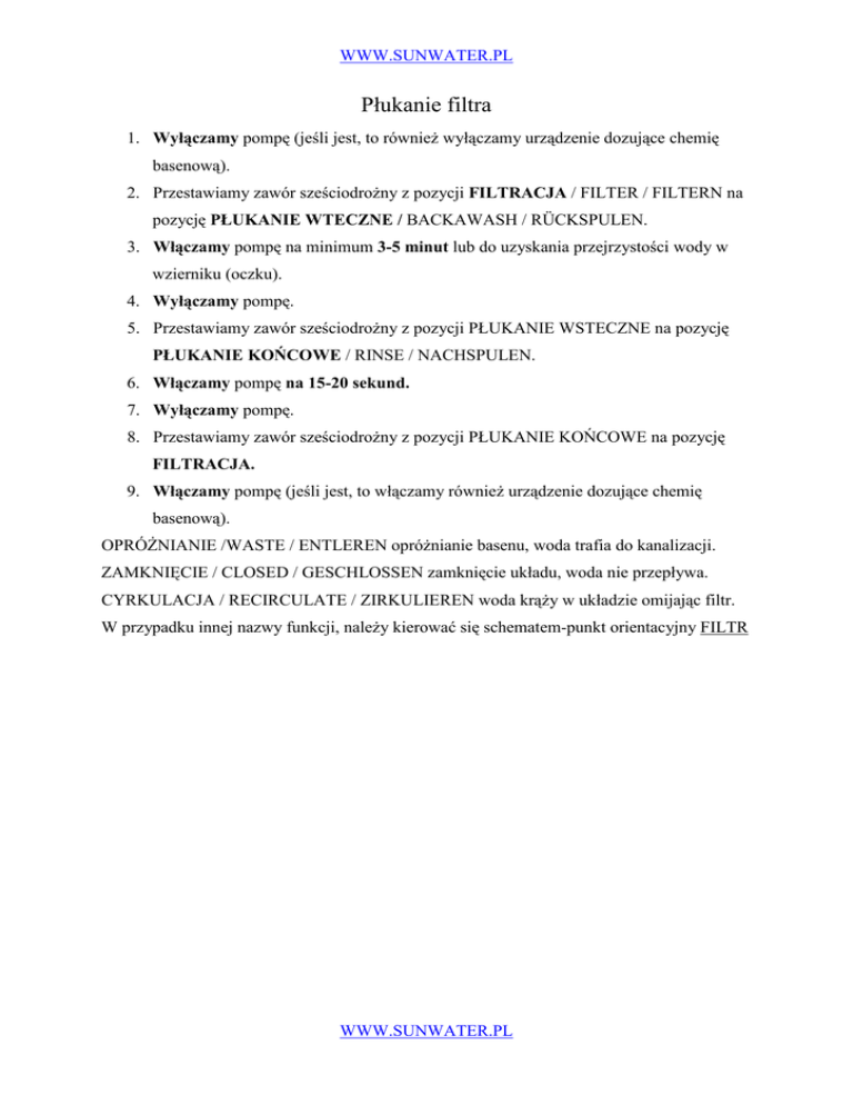 WWW.SUNWATER.PL Płukanie filtra 1. Wyłączamy pompę (jeśli jest, to równieŜ wyłączamy urządzenie dozujące chemię basenową). 2. Przestawiamy zawór sześciodroŜny z pozycji FILTRACJA / FILTER / FILTERN na pozycję PŁUKANIE WTECZNE / BACKAWASH / RÜCKSPULEN. 3. Włączamy pompę na minimum 3-5 minut lub do uzyskania przejrzystości wody w wzierniku (oczku). 4. Wyłączamy pompę. 5. Przestawiamy zawór sześciodroŜny z pozycji PŁUKANIE WSTECZNE na pozycję PŁUKANIE KOŃCOWE / RINSE / NACHSPULEN. 6. Włączamy pompę na 15-20 sekund. 7. Wyłączamy pompę. 8. Przestawiamy zawór sześciodroŜny z pozycji PŁUKANIE KOŃCOWE na pozycję FILTRACJA. 9. Włączamy pompę (jeśli jest, to włączamy równieŜ urządzenie dozujące chemię basenową). OPRÓśNIANIE /WASTE / ENTLEREN opróŜnianie basenu, woda trafia do kanalizacji. ZAMKNIĘCIE / CLOSED / GESCHLOSSEN zamknięcie układu, woda nie przepływa. CYRKULACJA / RECIRCULATE / ZIRKULIEREN woda krąŜy w układzie omijając filtr. W przypadku innej nazwy funkcji, naleŜy kierować się schematem-punkt orientacyjny FILTR WWW.SUNWATER.PL WWW.SUNWATER.PL FILTRACJA PŁUKANIE KOŃCOWE OPRÓśNIANIE FILTR ZAMYKANIE CYRKULACJA PŁUKANIE WSTECZNE WWW.SUNWATER.PL