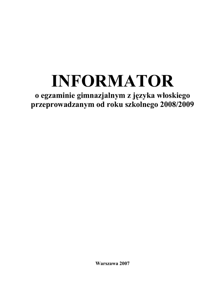 INFORMATOR o egzaminie gimnazjalnym z języka włoskiego przeprowadzanym od roku szkolnego 2008/2009 Warszawa 2007 Informator przygotowała Centralna Komisja Egzaminacyjna we współpracy z okręgowymi komisjami egzaminacyjnymi. w Warszawie Spis treści Wprowadzenie .................................................................................................. 1 Podstawy prawne egzaminu ............................................................................. 2 Opis egzaminu .................................................................................................. 3 Opis zestawu egzaminacyjnego ....................................................................... 5 Opis kryteriów punktowania .............................................................................. 5 Opis zakresu egzaminu .................................................................................... 6 Standardy wymagań egzaminacyjnych z wyjaśnieniami dla ucznia (słuchacza) ...................... 6 Zakres struktur leksykalno-gramatycznych ............................................................................... 9 Tematyka tekstów stanowiących podstawę zadań egzaminacyjnych ....................................... 14 Przykładowe zadania egzaminacyjne ............................................................... 15 Wprowadzenie Do umiejętności szczególnie ważnych i przydatnych w życiu należą kompetencje z zakresu języka obcego nowożytnego. Stąd od roku szkolnego 2008/2009 wprowadzono obejmującą je trzecią część egzaminu gimnazjalnego. Wyniki uzyskane z tej części egzaminu, podobnie jak wyniki z części humanistycznej i matematyczno-przyrodniczej, pomogą absolwentom gimnazjów w wyborze szkoły odpowiadającej ich umiejętnościom i ambicjom, a analizowane z uwzględnieniem kontekstów kształcenia, ułatwią opracowanie indywidualnych zaleceń dotyczących dalszej edukacji. Niniejszy informator adresowany jest przede wszystkim do nauczycieli, uczniów i ich rodziców. Zamieszczamy w nim niezbędne informacje o uregulowaniach prawnych i organizacyjnych dotyczących egzaminu z języka obcego, przytaczamy standardy wymagań egzaminacyjnych, przedstawiamy struktury leksykalno-gramatyczne, które mogą wystąpić w zadaniach egzaminacyjnych lub tekstach stanowiących ich podstawę, przybliżamy tematykę tych tekstów. W informatorze zamieszczamy również przykładowe zadania, które ilustrują kolejne standardy, oraz zwięzły opis kryteriów punktowania odpowiedzi udzielanych przez uczniów. Pragniemy przy tym podkreślić, że szkolne ocenianie nie powinno zostać podporządkowane i całkowicie uzależnione od wymagań egzaminacyjnych. Prowadziłoby to do zubożenia sposobów oceniania i miałoby niekorzystny wpływ na kompetencje językowe gimnazjalistów. Mamy nadzieję, że ogłaszany przez nas informator ułatwi przygotowanie do egzaminu gimnazjalnego z języka obcego nowożytnego i życzymy uczniom, ich rodzicom i nauczycielom satysfakcji z uzyskanych wyników. Dyrektor Centralnej Komisji Egzaminacyjnej 1 Podstawy prawne egzaminu Podstawą prawną regulującą zasady przeprowadzania egzaminu gimnazjalnego z zakresu języka obcego nowożytnego są następujące rozporządzenia wydane zgodnie z przepisami Ustawy z dnia 7 września 1991 r. o systemie oświaty (DzU z 2004 r., nr 256, poz. 2572, z późn. zm.): • Rozporządzenie Ministra Edukacji Narodowej z dnia 30 kwietnia 2007 r. w sprawie warunków i sposobu oceniania, klasyfikowania i promowania uczniów i słuchaczy oraz przeprowadzania sprawdzianów i egzaminów w szkołach publicznych (DzU nr 83, poz. 562, z późn. zm.) • Rozporządzenie Ministra Edukacji Narodowej i Sportu z dnia 18 stycznia 2005 r. w sprawie warunków organizowania kształcenia, wychowania i opieki dla dzieci i młodzieży niepełnosprawnych oraz niedostosowanych społecznie w przedszkolach, szkołach i oddziałach ogólnodostępnych lub integracyjnych (DzU nr 19, poz. 167) • Rozporządzenie Ministra Edukacji Narodowej i Sportu z dnia 18 stycznia 2005 r. w sprawie warunków organizowania kształcenia, wychowania i opieki dla dzieci i młodzieży niepełnosprawnych oraz niedostosowanych społecznie w specjalnych przedszkolach, szkołach i oddziałach oraz w ośrodkach (DzU nr 19, poz. 166) • Rozporządzenie Ministra Edukacji Narodowej z dnia 10 sierpnia 2001 r. w sprawie standardów wymagań będących podstawą przeprowadzania sprawdzianów i egzaminów (DzU nr 92, poz. 1020, z późn. zm.) • Rozporządzenie Ministra Edukacji Narodowej i Sportu z dnia 26 lutego 2002 r. w sprawie podstawy programowej wychowania przedszkolnego oraz kształcenia ogólnego w poszczególnych typach szkół (DzU nr 51, poz. 458, z późn. zm.). 2 Opis egzaminu Egzamin gimnazjalny z zakresu języka obcego nowożytnego, przeprowadzany od roku szkolnego 2008/2009, stanowi trzecią część egzaminu gimnazjalnego. Obejmuje wiadomości i umiejętności z zakresu języka obcego nowożytnego ustalone w standardach wymagań będących podstawą do przeprowadzania egzaminu w ostatnim roku nauki w gimnazjum. Uczeń (słuchacz) przystępuje do części trzeciej egzaminu gimnazjalnego z jednego z następujących języków: angielskiego, francuskiego, hiszpańskiego, niemieckiego, rosyjskiego i włoskiego – z tego języka, którego uczy się w szkole jako przedmiotu obowiązkowego. W przypadku gdy uczeń uczy się w szkole więcej niż jednego języka obcego nowożytnego jako przedmiotu obowiązkowego, jego rodzice (prawni opiekunowie) składają dyrektorowi szkoły pisemną deklarację o przystąpieniu ucznia do egzaminu gimnazjalnego z zakresu jednego z tych języków. Analogiczny dokument składa dyrektorowi szkoły słuchacz, który uczy się w szkole więcej niż jednego języka obcego nowożytnego jako przedmiotu obowiązkowego. Złożenie wspomnianych deklaracji musi nastąpić nie później niż do dnia 20 września roku szkolnego, w którym jest prze
