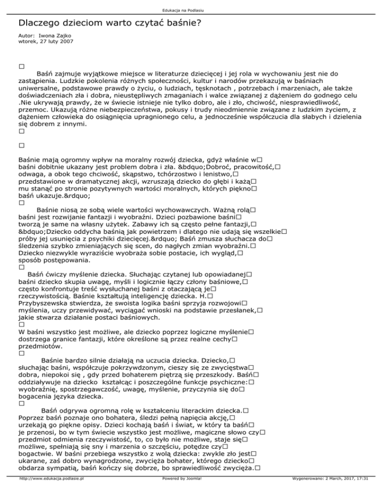Edukacja na Podlasiu Dlaczego dzieciom warto czytać baśnie? Autor: Iwona Zajko wtorek, 27 luty 2007 Baśń zajmuje wyjątkowe miejsce w literaturze dziecięcej i jej rola w wychowaniu jest nie do zastąpienia. Ludzkie pokolenia różnych społeczności, kultur i narodów przekazują w baśniach uniwersalne, podstawowe prawdy o życiu, o ludziach, tęsknotach , potrzebach i marzeniach, ale także doświadczeniach zła i dobra, nieustępliwych zmaganiach i walce związanej z dążeniem do godnego celu .Nie ukrywają prawdy, że w świecie istnieje nie tylko dobro, ale i zło, chciwość, niesprawiedliwość, przemoc. Ukazują różne niebezpieczeństwa, pokusy i trudy nieodmiennie związane z ludzkim życiem, z dążeniem człowieka do osiągnięcia upragnionego celu, a jednocześnie współczucia dla słabych i dzielenia się dobrem z innymi. Baśnie mają ogromny wpływ na moralny rozwój dziecka, gdyż właśnie w baśni dobitnie ukazany jest problem dobra i zła. „Dobroć, pracowitość, odwaga, a obok tego chciwość, skąpstwo, tchórzostwo i lenistwo, przedstawione w dramatycznej akcji, wzruszają dziecko do głębi i każą mu stanąć po stronie pozytywnych wartości moralnych, których piękno baśń ukazuje.” Baśnie niosą ze sobą wiele wartości wychowawczych. Ważną rolą baśni jest rozwijanie fantazji i wyobraźni. Dzieci pozbawione baśni tworzą je same na własny użytek. Zabawy ich są często pełne fantazji, „Dziecko oddycha baśnią jak powietrzem i dlatego nie udają się wszelkie próby jej usunięcia z psychiki dziecięcej.” Baśń zmusza słuchacza do śledzenia szybko zmieniających się scen, do nagłych zmian wyobraźni. Dziecko niezwykle wyraziście wyobraża sobie postacie, ich wygląd, sposób postępowania. Baśń ćwiczy myślenie dziecka. Słuchając czytanej lub opowiadanej baśni dziecko skupia uwagę, myśli i logicznie łączy człony baśniowe, często konfrontuje treść wysłuchanej baśni z otaczającą je rzeczywistością. Baśnie kształtują inteligencję dziecka. H. Przybyszewska stwierdza, że swoista logika baśni sprzyja rozwojowi myślenia, uczy przewidywać, wyciągać wnioski na podstawie przesłanek, jakie stwarza działanie postaci baśniowych. W baśni wszystko jest możliwe, ale dziecko poprzez logiczne myślenie dostrzega granice fantazji, które określone są przez realne cechy przedmiotów. Baśnie bardzo silnie działają na uczucia dziecka. Dziecko, słuchając baśni, współczuje pokrzywdzonym, cieszy się ze zwycięstwa dobra, niepokoi się , gdy przed bohaterem piętrzą się przeszkody. Baśń oddziaływuje na dziecko kształcąc i poszczególne funkcje psychiczne: wyobraźnię, spostrzegawczość, uwagę, myślenie, przyczynia się do bogacenia języka dziecka. Baśń odgrywa ogromną rolę w kształceniu literackim dziecka. Poprzez baśń poznaje ono bohatera, śledzi pełną napięcia akcję, urzekają go piękne opisy. Dzieci kochają baśń i świat, w który ta baśń je przenosi, bo w tym świecie wszystko jest możliwe, magiczne słowo czy przedmiot odmienia rzeczywistość, to, co było nie możliwe, staje się możliwe, spełniają się sny i marzenia o szczęściu, potędze czy bogactwie. W baśni przebiega wszystko z wolą dziecka: zwykle zło jest ukarane, zaś dobro wynagrodzone, zwycięża bohater, którego dziecko obdarza sympatią, baśń kończy się dobrze, bo sprawiedliwość zwycięża. http://www.edukacja.podlasie.pl Powered by Joomla! Wygenerowano: 2 March, 2017, 17:31 Edukacja na Podlasiu Dziecko słabe i pokrzywdzone w świecie realnym, czuje się dowartościowane w świecie fantastycznym. Świat fantastyczny jest też często odpoczynkiem dla dzieci starszych, które, na co dzień muszą uczęszczać do szkoły i uczyć się. Baśń jest bliska dziecku ze względu na charakterystykę osób, która jest uproszczona, oparta na kontrastach, a przez to bardziej dlań zrozumiała. Baśń ukazuje dziecku, i to w sposób uczciwy, podstawowe problemy egzystencjalne człowieka: śmierć, starość, pragnienie życia wiecznego. Baśń ten problem ukazuje w sposób prosty i zwarty, przez co dziecko jest w stanie go uchwycić. Baśń upraszcza wszystkie sytuacje. Postacie zarysowane są z wielką wyrazistością. W jedne postacie wcielone jest dobro, w inne zło- podobnie jak w życiu. Zło symbolizowane jest często przez potęgę olbrzyma, smoka , moc czarownicy czy przebiegłość królowej i zdarza się , że chwilowo zyskuje przewagę , ale w końcu ponosi taka postać klęskę. Jednym z celów baśni jest zapewnienie dziecku bezpieczeństwa. W baśni po ziemskim i prostym początku następują wydarzenia fantastyczne, wątek jednak nigdy nie zatraca się. Dziecko uczy się, więc- że można bez szkody oddawać się fantazjowaniu pod warunkiem, iż nie pozostaje się we władzy fantazjującej wyobraźni na zawsze. Przy końcu opowieści bohater wraca do świata rzeczywistego, który jest światem szczęśliwym, ale już nie czarodziejskim. Dziecku, które ma o wiele mniejsze poczucie bezpieczeństwa niż człowiek dorosły, potrzebna jest pewność, że snucie przez nie fantazji, czy niemożność oparcia się ich wpływowi nie jest jakąś jego ułomnością. Baśń zapewnia, że gdzieś w ukryciu czuwa nad jego losem dobra wróżka- matka chrzestna, gotowa użyć swej mocy w krytycznej chwili. W baśni opowiada się dziecku, że, mimo iż są czarownice, nie należy zapomnieć, że istnieją dobre wróżki, których moc jest większa. Procesy niewiadome mogą stawać się dla dziecka jaśniejsze dzięki obrazom, które przemawiają bezpośrednio do jego świadomości. Ponieważ baśń ma zawsze szczęśliwe zakończenie, dziecko może bez lęku uczestniczyć w opowieści, by w jej trakcie wyjawiły się jego nieświadome uczucia-wie, że i tak będzie żyło długo i szczęśliwie. Dziecko nie jest zdolne jeszcze do tego, by samodzielnie uporządkować własne problemy wewnętrzne i nada