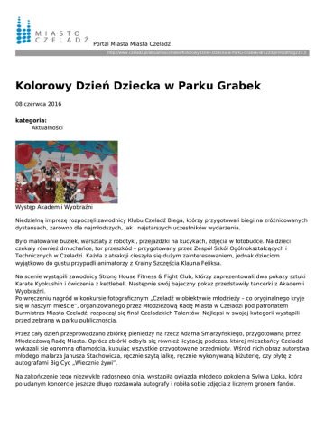 Portal Miasta Miasta Czeladź http://www.czeladz.pl/aktualnosci/index/Kolorowy-Dzien-Dziecka-w-Parku-Grabek/idn:220/printpdf/stg237:3 Kolorowy Dzień Dziecka w Parku Grabek 08 czerwca 2016 kategoria: Aktualności Występ Akademii Wyobraźni Niedzielną imprezę rozpoczęli zawodnicy Klubu Czeladź Biega, którzy przygotowali biegi na zróżnicowanych dystansach, zarówno dla najmłodszych, jak i najstarszych uczestników wydarzenia. Było malowanie buziek, warsztaty z robotyki, przejażdżki na kucykach, zdjęcia w fotobudce. Na dzieci czekały również dmuchańce, tor przeszkód – przygotowany przez Zespół Szkół Ogólnokształcących i Technicznych w Czeladzi. Każda z atrakcji cieszyła się dużym zainteresowaniem, jednak dzieciom wyjątkowo do gustu przypadli animatorzy z Krainy Szczęścia Klauna Feliksa. Na scenie wystąpili zawodnicy Strong House Fitness & Fight Club, którzy zaprezentowali dwa pokazy sztuki Karate Kyokushin i ćwiczenia z kettlebell. Następnie swój bajeczny pokaz przedstawiły tancerki z Akademii Wyobraźni. Po wręczeniu nagród w konkursie fotograficznym „Czeladź w obiektywie młodzieży – co oryginalnego kryje się w naszym mieście”, organizowanego przez Młodzieżową Radę Miasta w Czeladzi pod patronatem Burmistrza Miasta Czeladź, rozpoczął się finał Czeladzkich Talentów. Najlepsi w swojej kategorii wystąpili przed zebraną w parku publicznością. Przez cały dzień przeprowadzano zbiórkę pieniędzy na rzecz Adama Smarzyńskiego, przygotowaną przez Młodzieżową Radę Miasta. Oprócz zbiórki odbyła się również licytację podczas, której mieszkańcy Czeladzi wykazali się ogromną ofiarnością, kupując wszystkie przygotowane przedmioty. Wśród nich obraz autorstwa młodego malarza Janusza Stachowicza, ręcznie szytą lalkę, ręcznie wykonywaną biżuterię, czy płytę z autografami Big Cyc „Wiecznie żywi”. Na zakończenie tego niezwykle radosnego dnia, wystąpiła gwiazda młodego pokolenia Sylwia Lipka, która po udanym koncercie jeszcze długo rozdawała autografy i robiła sobie zdjęcia z licznym gronem fanów. Dzień Dziecka w Parku Grabek 7 czerwiec 2016 3 zdjęć Dzień Dziecka w Parku Grabek Dzień Dziecka w Parku Grabek Dzień Dziecka w Parku Grabek Dzień Dziecka w Parku Grabek Kolorowy Dzień Dziecka w Parku Grabek - strona 1 Kolorowy Dzień Dziecka w Parku Grabek - strona 2 Kolorowy Dzień Dziecka w Parku Grabek - strona 3