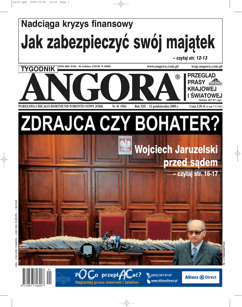 a4101.qxd 2008-10-04 16:59 Page 1 Nadciąga kryzys finansowy Jak zabezpieczyć swój majątek – czytaj str. 12-13 TYGODNIK www.angora.com.pl ISSN 0867 8162 Nr indeksu 378739 K 45850 wap.angora.com.pl PRZEGLĄD PRASY KRAJOWEJ I ŚWIATOWEJ Nakład: 457 611 egz. WARSZAWA-CHICAGO-DORTMUND-TORONTO-NOWY JORK Nr 41 (956) Rok XIX 12 października 2008 r. Cena 3,50 zł (w tym 7 % VAT) Wojciech Jaruzelski przed sądem Fot. A. Chełstowski/Forum USA – 3,00 USD; CANADA – 2,80 CAD; EUROPA – 1,50 EUR – czytaj str. 16-17 a41x2 rekl renault.qxd R E K L A M A 2008-10-04 11:15 Page 2 a41x2 rekl renault.qxd 2008-10-04 11:16 Page 3 R E K L A M A a4104.qxd 2008-10-04 17:45 Page 2 4 KTO CZYTA, NIE BŁĄDZI ANGORA nr 41 (12.X.2008) 72 12 Jak uchronić swoje oszczędności. 13 Banki boją się pożyczać (Rzeczpospolita) Wysokie zarobki to za mało, by dostać kredyt. 14 Tusk miał się ślizgać, a został twardzielem (Polska. The Times) Jadwiga Staniszkis ocenia polską scenę polityczną. 16 Polityczny testament generała Jaruzelskiego Fragmenty wystąpienia sądowego. 18 Wałęsa i bzikowata interpretacja historii Laudacja Normana Daviesa na cześć przewodniczącego „Solidarności”. 19 Za drogi koncert ku czci (Rzeczpospolita) Dlaczego TVP nie pokazała koncertu dla Wałęsy. SPOŁECZEŃSTWO 20 W obronie Polski i Europy Fragmenty książki Józefa Szaniawskiego „Marszałek Piłsudski”. 22 Prawi i honorowi (za 300 zł) (Przegląd) Liderzy PiS pisali ewidentne kłamstwa, byle tylko dostać poselską dietę. FELIETONY Janusz Korwin-Mikke, Sobczak&Szpak .10 Henryk Martenka . . . . . . . . . . . . . . . .11 A TO POLSKA WŁAŚNIE . . . . . . .28-29 POLSKI PACJENT . . . . . . . . . . . . . . .36 PRAWNIK RADZI . . . . . . . . . . . . . . . .37 DOWCIPY . . . . . . . . . . . . . . . . . . .38, 47 ANGORKA – TYGODNIK DLA DZIECI .39-46 SPODPRASY . . . . . . . . . . . . . . . . . . .47 RECENZJE FILMOWE . . . . . . . . . . . .54 WITRYNA . . . . . . . . . . . . . . . . . . .60, 61 WIERSZÓWKA . . . . . . . . . . . . . . . . . .62 HOROSKOP . . . . . . . . . . . . . . . . . . . .62 OBCY JĘZYK POLSKI . . . . . . . . . . . .63 POCZET NAZWISK POLSKICH . . . . .63 LISTY OD CZYTELNIKÓW . . . . . .64, 65 KRZYŻÓWKI . . . . . . . . . . . . . .66, 67, 68 KRONIKA TOWARZYSKA . . . . . . . . .83 24 Polak porwany w Pakistanie (Polska – Gazeta Krakowska) 25 Niechciani Irakijczycy (Gazeta Wyborcza) Co zrobić ze współpracownikami naszej armii w Iraku? 26 Podniebni szeryfowie (Polska Zbrojna) Sky marshale czuwają nad naszym bezpieczeństwem w samolotach. 30 Rozdwojenie Haliny (Gazeta Wyborcza) Ciężki los córki gwałconej przez ojca. POZA PRAWEM 32 Szukamy ciągu dalszego – granice błędu (Angora) Postrzelone przez policjantów małżeństwo od ośmiu lat nie może doczekać się sprawiedliwości. 34 Funkcjonariusz na gazie (Angora) Afera gruntowa (3). OBYCZAJE 48 Gwiazdy uciekły na molo „Angora” na salonach warszawki. 49 Pierwszy siwy włos Marty Mirskiej (Angora) 58 Od Paderewskiego do Franka Sinatry Fragmenty książki Henryka Martenki „Wielki akord” (20). 60 Książki i Nagroda Nobla (Angora) Dzieła noblistów nie znajdują dziś czytelników. ŚWIAT – WYDARZENIA 69 Marionetka z duszą? (La Repubblica) Joaquin Navarro-Valls o Janie Pawle II i Wojciechu Jaruzelskim. 72 Odszedł tak, jak żył... (Herald Sun) Cały świat składa hołd Paulowi Newmanowi. ŚWIAT – OBYCZAJE 73 Jak nasiąka skorupka (Polish Express) Dzieci polskich emigrantów zapominają, jak mówi się po polsku. 74 Jak bezpiecznie latać (Berliner Morgenpost) Stare samoloty przyczyną wszystkich tegorocznych katastrof. 75 Windą do nieba... (The Times) Nowe wyzwanie japońskiej nauki. 76 Sekrety długiego życia (The Times) Żeby długo żyć, trzeba utrzymywać odpowiednią wagę. 77 Szybkie numerki (The Sun) Czterosekundowa scena miłosna jest możliwa do zrealizowania tylko na filmie. ŚWIAT – TURYSTYKA 78 Noc nad rzeką Kwai (Peryskop) ... pozwoli poznać uroki tajlandzkiej dżungli. ŚWIAT – ROZMAITOŚCI 80 Proszę wstać! Nauka idzie! (Peryskop) Nie zawsze „szkiełko i oko” radzą sobie z naszymi codziennymi problemami. 82 Seksparty dla pani domu (SMH) Wibratory nowej generacji mają kształt jajek, owali, nabojów i małych katamaranów. 83 Kant przy małej czarnej (Peryskop) Korespondencja własna Leszka Turkiewicza z Paryża. Na dobry początek Jak powstają przeboje(13). 50 Nie głaskać! Ja tu pracuję! (Nowa Trybuna Opolska) Historia psa Arusia, przewodnika niewidomej. 52 Dopłata za całowanie (Zwierciadło) Dziewczyny do towarzystwa chcą zarobić na dostatnie życie. Fot. P. Deska/Ag. Gazeta. Oprac.: Paweł Wakuła AKTUALNOŚCI 12 Kryzys bankowy bliżej Polski (Gazeta Wyborcza) KULTURA 54 Śpiewająca mrówa (Rzeczpospolita) Rozmowa z Michałem Foggiem, prawnukiem słynnego śpiewaka. 56 Salonowe burze Bohdana Gadomskiego (Angora) Piosenka daje mi poczucie bezpieczeństwa, wyznaje Katarzyna Groniec. Fot. Fotolink, Reuters/Forum a4105.qxd 2008-10-04 13:12 Page 1 R E K L A M A a4006-07.qxd 2008-10-04 14:17 Page 2 6 PRASOWE ZDJĘCIA TYGODNIA ANGORA nr 41 (12.X.2008) ŻEBY TYLKO CHLEBA I SŁONINY NIE ZABRAKŁO. Białoruska ordynacja wyborcza przewiduje, że starsi ludzie mogą głosować w swoich domach. Fot. AFP/East News (Rzeczpospolita nr 232) PAMIĄTKA Z DAWNYCH LAT. Znak drogowy wrośnięty w drzewo. Fot. PAP/Krzysztof Świderski TYGODNIK ANGORA działa na podstawie przepisów art. 25, 26, 29 (zamieszczając także wypisy dla celów dydaktycznych) 33 i 49 ust. 2 ustawy o prawie autorskim i „prawach pokrewnych z dn. 4 lutego 1994 r. (DzU z dn. 23 lutego 1994 r. nr 24, poz. 83) oraz przyjętych zwyczajów edytorskich. Szczegóły wyjaśniamy w rozesłanym do redakcji i udostępnianym na żądanie liście intencyjnym. Sprostowania i odpowiedzi drukujemy jedynie po opublikowaniu w pismach, skąd dokonaliśmy przedruku. Redakcja nie zwraca nie zamówionych materiałów. Zastrzega sobie prawo do skrótó