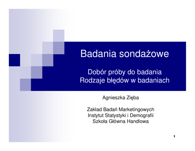 Badania sondażowe Dobór próby do badania Rodzaje błędów w badaniach Agnieszka Zięba Zakład Badań Marketingowych Instytut Statystyki i Demografii Szkoła Główna Handlowa 1 Konstrukcja próby badawczej 2 Dobór respondentów do badania Analityk musi rozumieć podstawowe zasady projektowania badania sondażowego i umieć je tak modyfikować, by mogły służyć określonym celom. Aby odpowiednio dobrać jednostki do badania niezbędna jest znajomość pojęć takich jak: Populacja Próba - losowa - celowa Operat losowania Błędy w badaniu - losowe - nielosowe 3 Populacja Wywiad z kwestionariuszem ankietowym służy po to, aby na podstawie zgromadzonych za jego pomocą informacji możliwe było wnioskowanie o interesującej nas zbiorowości, czyli POPULACJI. POPULACJA – wynika z celu badania, jest to zbiorowość, której jednostki mają jedną cechę wspólną, zaś pozostałe – różne. Populacja musi być określona precyzyjnie. Przykład: Rodziny (jak traktować kohabitantów) Studenci SGH (co z przebywającymi na urlopie dziekańskim). 4 Cechy populacji Populacja może być: skończona (przeliczalna liczba jednostek – pracownicy zakładu – ich listę imienną można sporządzić) lub nieskończona (nieskończenie wiele jednostek – osoby zwiedzające stare miasto Warszawy – zbiorowość nieewidencjonowana – np. bezdomni, nabywcy zupek marki GERBER, wspinacze wysokogórscy). Wiedza o populacji może być: bardzo rozległa i opierać się na dostępnych danych lub zweryfikowanych teoriach i hipotezach lub wiedza taka może w ogóle nie istnieć Skład populacji może być: nieustannie lub okresowo weryfikowany w postaci spisów i innych rejestrów (PESEL, REGON, TERYT, lista klientów banku) lub może nie istnieć możliwość utworzenia imiennej listy jednostek tworzących populację (kupujący proszki do prania marki VIZIR). 5 Badanie sondażowe może być realizowane jako: BADANIE PEŁNE (obejmujące wszystkie jednostki populacji) BADANIE FRAGMENTARYCZNE (obejmujące niektóre jednostki populacji, tzw. PRÓBĘ, jednostki te wybierane są wg określonych zasad zwanych METODAMI DOBORU PRÓBY) 6 Sposoby doboru próby DOBÓR LOSOWY DOBÓR CELOWY • Jest potrzeba oceny precyzji wyników • Nie ma potrzeby dowodzenia reprezentatywności i oceny precyzji • Próba odzwierciedla populację • Nie wiadomo na ile próba zgodna jest z populacją • Oczekiwana precyzja stanowi podstawę określenia liczebności próby • Koszty stanowią podstawę określenia liczebności tej próby każda jednostka ma taką samą szansę trafienia do próby, mechanizm doboru jednostki do próby jest całkowicie niezależny (zewnętrzny) w stosunku do badacza dobór jednostki jest subiektywny, szukamy osób, które należą do grupy docelowej, badacz odgórnie rozstrzyga, które jednostki znajdą się w próbie (np. rzetelna moneta przy wchodzeniu do sali) (np. kierowcy i zauważalność bilboardu) 7 Dobór próby O zastosowaniu określonej metody doboru próby decydują: WARUNKI, w jakich realizowane będzie badanie PRZEDMIOT BADANIA PRÓBA REPREZENTATYWNA - to próba odzwierciedlająca strukturę populacji – reprezentatywna ze względu na badane cechy (lub cechy silnie skorelowane z cechą badaną) Jeśli celem jest uzyskanie cech ilościowych, np. średniej, frakcji, ocen poziomu zmienności, to wówczas potrzebne jest określenie precyzji i wiarygodności uzyskanych wyników. Tylko dobór losowy stwarza takie możliwości, dlatego jest tu zalecany. PRÓBĘ LOSOWĄ jesteśmy w stanie zbudować jeżeli jest znana wielkość populacji i istnieje możliwość nawiązania kontaktu z każdą jednostką! 8 Operat losowania OPERAT LOSOWANIA wymagany jest w przypadku losowego doboru próby jest to wykaz jednostek tworzących badaną zbiorowość (populację) istnieje, jeśli możliwe jest sporządzenie imiennego wykazu jednostek badanej zbiorowości istnieje tylko dla populacji skończonej jeśli istnieje potrzeba przeprowadzenia złożonego schematu losowania próby powinien zawierać informacje dodatkowe, np. demograficzne jednostek Operat można stworzyć np. na podstawie książki telefonicznej, spisu mieszkańców danego miasta, listy członków organizacji państwowych itd. Aby OPERAT był użyteczny musi być: Kompletny Aktualny Gwarantujący identyfikowalność jednostki (kontakt z nią) Jeśli operat nie istnieje stosowany jest celowy sposób doboru respondenta 9 (np. co dziesiąty turysta przechodzący bulwarem odwiedzający Kazimierz Dolny) Procedura doboru próby Zdefiniowanie populacji badanej Określenie operatu losowania (jeżeli istnieje) Określenie jednostki wyboru (czy pochodzi z operatu, czy jest inny sposób określania jednostki badanej) Wybór metody doboru jednostek (próba losowa, celowa) Ustalenie wielkości próby (zależy od wielu aspektów – m.in. technicznych, finansowych, wymaganej jakości pozyskanych danych) 10 Dobór celowy Próba konstruowana jest w sposób SUBIEKTYWNY Dobór może być: KWOTOWY (kwota – udział podgrupy w próbie) ustalenie kwot - w warstwach TYPOWY lub PRZEZ ELIMINACJĘ WG. KULI ŚNIEGOWEJ oparty o punkt zaczepienia PRZYPADKOWY Zakłada się, że próba ma być miniaturą populacji, jednak nie można dowieść, że jest reprezentatywna. 11 Dobór celowy: PRZYKŁADY KWOTOWY Dobór osób posiadających telefony komórkowe ze względu typ oferty: Wykształcenie klienta Liczba w populacji w tys. (dane GUS za 2006r.) (%) Liczba w próbie (kwoty) Orange 11,738 33,7 337 Era 11,954 34,4 344 Plus 11,100 31,9 319 Suma 34.792 100,0 1000 TYPOWY – gospodarstwa domowe o przeciętnych dochodach PRZEZ ELIMINACJĘ – eliminacja nietypowych – punktów sprzedaży o najniższych tygodniowych obrotach WG. KULI ŚNIEGOWEJ – uprawiający sporty ekstremalne PRZYPADKOWY – badanie percepcji ulicznych przekazów reklamowych 12 Zagrożenia w doborze celowym (co zarzuca się próbom celowym) Błędny osąd i intuicja badacza, co do prawidłowości w