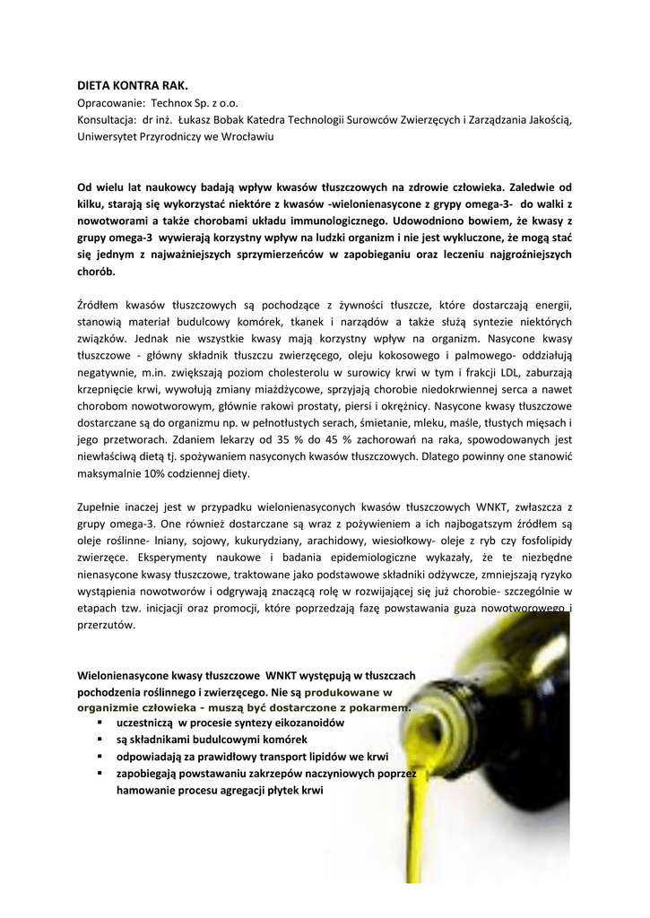 DIETA KONTRA RAK. Opracowanie: Technox Sp. z o.o. Konsultacja: dr inż. Łukasz Bobak Katedra Technologii Surowców Zwierzęcych i Zarządzania Jakością, Uniwersytet Przyrodniczy we Wrocławiu Od wielu lat naukowcy badają wpływ kwasów tłuszczowych na zdrowie człowieka. Zaledwie od kilku, starają się wykorzystać niektóre z kwasów -wielonienasycone z grypy omega-3- do walki z nowotworami a także chorobami układu immunologicznego. Udowodniono bowiem, że kwasy z grupy omega-3 wywierają korzystny wpływ na ludzki organizm i nie jest wykluczone, że mogą stać się jednym z najważniejszych sprzymierzeńców w zapobieganiu oraz leczeniu najgroźniejszych chorób. Źródłem kwasów tłuszczowych są pochodzące z żywności tłuszcze, które dostarczają energii, stanowią materiał budulcowy komórek, tkanek i narządów a także służą syntezie niektórych związków. Jednak nie wszystkie kwasy mają korzystny wpływ na organizm. Nasycone kwasy tłuszczowe - główny składnik tłuszczu zwierzęcego, oleju kokosowego i palmowego- oddziałują negatywnie, m.in. zwiększają poziom cholesterolu w surowicy krwi w tym i frakcji LDL, zaburzają krzepnięcie krwi, wywołują zmiany miażdżycowe, sprzyjają chorobie niedokrwiennej serca a nawet chorobom nowotworowym, głównie rakowi prostaty, piersi i okrężnicy. Nasycone kwasy tłuszczowe dostarczane są do organizmu np. w pełnotłustych serach, śmietanie, mleku, maśle, tłustych mięsach i jego przetworach. Zdaniem lekarzy od 35 % do 45 % zachorowań na raka, spowodowanych jest niewłaściwą dietą tj. spożywaniem nasyconych kwasów tłuszczowych. Dlatego powinny one stanowić maksymalnie 10% codziennej diety. Zupełnie inaczej jest w przypadku wielonienasyconych kwasów tłuszczowych WNKT, zwłaszcza z grupy omega-3. One również dostarczane są wraz z pożywieniem a ich najbogatszym źródłem są oleje roślinne- lniany, sojowy, kukurydziany, arachidowy, wiesiołkowy- oleje z ryb czy fosfolipidy zwierzęce. Eksperymenty naukowe i badania epidemiologiczne wykazały, że te niezbędne nienasycone kwasy tłuszczowe, traktowane jako podstawowe składniki odżywcze, zmniejszają ryzyko wystąpienia nowotworów i odgrywają znaczącą rolę w rozwijającej się już chorobie- szczególnie w etapach tzw. inicjacji oraz promocji, które poprzedzają fazę powstawania guza nowotworowego i przerzutów. Wielonienasycone kwasy tłuszczowe WNKT występują w tłuszczach pochodzenia roślinnego i zwierzęcego. Nie są produkowane w organizmie człowieka - muszą być dostarczone z pokarmem. uczestniczą w procesie syntezy eikozanoidów są składnikami budulcowymi komórek odpowiadają za prawidłowy transport lipidów we krwi zapobiegają powstawaniu zakrzepów naczyniowych poprzez hamowanie procesu agregacji płytek krwi 1 Pisząc o wpływie kwasów omega-3 na organizm, dr Katarzyna Marciniak- Łukasik z Wydziału Nauk o Żywności, Szkoły Głównej Gospodarstwa Wiejskiego w Warszawie podkreśla, że ich pozytywne działanie polega na: redukowaniu stężenia triacylogliceroli w osoczu krwi poprzez hamowanie ich resyntezy w ścianie jelit i wątrobie nawet o 30 % normalizacji ciśnienia krwi związanej ze zwiększeniem poziomu prostacyklin działaniu przeciwzakrzepowym wynikającym z przedłużenia czasu krwawienia poprzez zmniejszanie podatności płytek krwi do zlepiania się hamowaniu rozwoju choroby niedokrwiennej serca i choroby wieńcowej serca działaniu przeciwmiażdżycowym wynikającym m.in. z modyfikacji w syntezie eikozanoidów, redukcji poziomu cholesterolu w osoczu oraz hamowania adhezji płytek działaniu przeciwzapalnym i przeciwalergicznym polegającym na hamowaniu nadmiernej odpowiedzi immunologicznej, a także ostrości przebiegu procesów zapalnych w etiologii wirusowej i bakteryjnej hamowaniu rozwoju cukrzycy typu II, gdyż wykazano, że niski poziom ω-3 i wysoki ω -6 PUFA w fosfolipidach błon komórkowych mięśni szkieletowych jest związany ze wzrostem ich oporności na insulinę, co sprzyja rozwojowi tego typu cukrzycy działaniu przeciwnowotworowym ochronie układu immunologicznego działaniu przeciwdepresyjnym poprzez sprzyjanie prawidłowemu działaniu funkcji błon komórek nerwowych kory mózgu przeciwdziałaniu otyłości poprzez hamujący wpływ na lipogenezę korzystnym oddziaływaniu na skórę i działaniu leczniczym w przypadku schorzeń skórnych (np. atopowym zapaleniu skóry) Omega – 3: kwas α- linolenowy – olej lniany, rzepakowy i sojowy kwas eikozapentaenowy (EPA) - np. łosoś, dorsz kwas dokozapentaenowy ( DPA) – mleko matki, olej foczy kwas dokozaheksaenowy (DHA) - np. olej z makreli 2 Jednym z niezbędnych nienasyconych kwasów tłuszczowych grupy omega-3 jest kwas α-linolenowy ( inaczej nazywany: ALA, C18:3 czy kwas oktadeka-9,12,15-trienowy). Najbogatszym jego źródłem jest siemię lniane i olej z niego tłoczony (zawartość ponad 50% ALA). Olej lniany ponadto zawiera do 1.5% fitosteroli czyli substancji tworzących błony komórkowe roślin, które dostarczone do organizmu ludzkiego pomagają w transporcie i pozbywaniu się złego cholesterolu. W oleju lnianym znajduje się również ok. 650 µg w 1 ml β-karotenu będącego prowitaminą A. Wpływa ona normalizująco na reprodukcję i odnowę komórek naskórka, uelastycznia i wygładza skórę, hamuje powstawanie zmarszczek, wykazuje silne działanie przeciwzapalne, przyspiesza gojenie drobnych uszkodzeń skóry, zwiększa zdolności obronne skóry przed infekcjami i promieniowaniem UV. Kwas α-linolenowy znajdziemy także w oleju kukurydzianym, słonecznikowym, sojowym i rzepakowym (tłoczonym na zimno i nie rafinowanym),orzechach włoskich, dziczyźnie, jajach kur karmionych siemieniem lnianym. Występuje również w warzywach liściastych, jednak niewystarczająco dla potrzeb metabolicznych człowieka. Zdaniem lekarzy i naukowców suplementacja diety w kwas α-linolenowy zaliczany do omega-3, , w znacznym stopniu