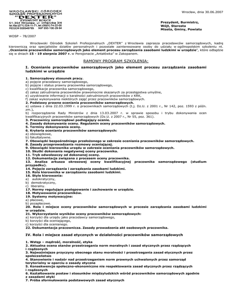Wrocław, dnia 30.06.2007 Prezydent, Burmistrz, Wójt, Starosta Miasta, Gminy, Powiatu WOSP – 78/2007 Wrocławski Ośrodek Szkoleń Profesjonalnych „DEXTER” z Wrocławia zaprasza pracodawców samorządowych, kadrę kierowniczą oraz specjalistów działów personalnych i pozostałe zainteresowane osoby do udziału w ogólnopolskim szkoleniu nt. „Ocenianie pracowników samorządowych jako element procesu zarządzania zasobami ludzkimi w urzędzie”, które odbędzie się w dniach 15 - 19 sierpnia 2007 r. w Pensjonacie „Antałówka” w Zakopanem. RAMOWY PROGRAM SZKOLENIA: I. Ocenianie pracowników samorządowych jako element procesu zarządzania zasobami ludzkimi w urzędzie 1. Samorządowy stosunek pracy. a) pojęcie pracodawcy samorządowego, b) pojęcie i status prawny pracownika samorządowego, c) kwalifikacje pracownika samorządowego, d) zakaz zatrudniania pracowników prawomocnie skazanych za przestępstwa umyślne, e) uzyskiwanie informacji o karalności zatrudnionych pracowników z KRK, f) zakaz wykonywania niektórych zajęć przez pracowników samorządowych. 2. Podstawy prawne oceniania pracowników samorządowych. a) ustawa z dnia 22.03.1999 r. o pracownikach samorządowych (t.j. Dz.U. z 2001 r., Nr 142, poz. 1593 z późn. zm.), b) rozporządzenie Rady Ministrów z dnia 13.03.2007 r. w sprawie sposobu i trybu dokonywania ocen kwalifikacyjnych pracowników samorządowych (Dz.U. z 2007 r., Nr 55, poz. 361). 3. Pracownicy samorządowi podlegający ocenie. 4. Zasady dokonywania oceny. Regulamin oceny pracowników samorządowych. 5. Terminy dokonywania oceny. 6. Kryteria oceniania pracowników samorządowych: a) obowiązkowe, b) fakultatywne. 7. Obowiązki bezpośredniego przełoŜonego w zakresie oceniania pracowników samorządowych. 8. Zasady przeprowadzania rozmowy oceniającej. 9. Obowiązki kierownika urzędu w zakresie oceniania pracowników samorządowych. 10. Skutki dokonania negatywnej oceny pracownika. 11. Tryb odwoławczy od dokonanej oceny. 12. Dokumentacja związana z procesem oceny pracownika. 13. Analiza arkusza okresowej oceny kwalifikacyjnej pracownika samorządowego (studium przypadku). 14. Pojęcie zarządzania i zarządzania zasobami ludzkimi. 15. Rola kierownika w zarządzaniu zasobami ludzkimi. 16. Style kierowania: a) autokratyczny, b) demokratyczny, c) liberalny. 17. Normy regulujące postępowanie i zachowanie w urzędzie. 18. Motywowanie pracowników. 19. Systemy motywacyjne: a) płacowe, b) pozapłacowe. 20. Rola i miejsce oceny pracowników samorządowych w procesie zarządzania zasobami ludzkimi w urzędzie. 21. Wykorzystanie wyników oceny pracowników samorządowych: a) korzyści dla urzędu jako pracodawcy samorządowego, b) korzyści dla oceniającego, c) korzyści dla ocenianego. 22. Dokumentacja pracownicza. Zasady prowadzenia akt osobowych pracownika. IV. Rola i miejsce zasad etycznych w działalności pracowników samorządowych 1. Wstęp – mądrość, moralność, etyka 2. Aktualna ocena stanów przestrzegania norm moralnych i zasad etycznych przez rządzących i rządzonych 3. NajwaŜniejsze przyczyny obecnego stanu moralności i przestrzegania zasad etycznych przez społeczeństwo 4. Stanowienie i nadzór nad przestrzeganiem norm prawnych uchwalonych przez samorząd terytorialny w oparciu o zasady etyczne 5. Konsekwencje społeczno-ekonomiczne nie respektowania zasad etycznych przez rządzących i rządzonych 6. Kształtowanie postaw i stosunków międzyludzkich wśród pracowników samorządowych zgodnie z zasadami etyki 7. Próba sformułowania podstawowych zasad etycznych Szczegółowy zakres tematyki zajęć oraz materiały szkoleniowe przekaŜemy Państwu przed rozpoczęciem szkolenia. Wykładowcami na szkoleniu będą: Mecenas Beata Janik - doświadczony pracownik samorządowy - radca prawny i kierownik Biura Prawnego Urzędu Miasta w Tomaszowie Mazowieckim, prowadząca Kancelarię Radcy Prawnego w Tomaszowie Mazowieckim, autorka ksiąŜki "Funkcjonowanie przedsiębiorstwa w warunkach gospodarki rynkowej". mgr Wiesław Tomaszunas – wieloletni i doświadczony działacz samorządowy, Wrocław Uczestnicy otrzymają zaświadczenie potwierdzające udział w szkoleniu. Warunki organizacyjno – finansowe Przyjazd i zakwaterowanie uczestników szkolenia moŜliwe juŜ od wczesnych godzin rannych w dniu 15 sierpnia. Zajęcia rozpoczynają się od godz. 900 w dniu 16 sierpnia. Uczestnicy szkolenia mają zagwarantowane 4 noclegi w Pensjonacie “Antałówka” w Zakopanem w pokojach 1 - lub 2 osobowych (łazienka, wc, radio, telewizor z programem satelitarnym), a takŜe wyŜywienie (od śniadania w dniu 16 sierpnia do obiadu w dniu 19 sierpnia). W hotelu uczestnicy mogą korzystać z drink-baru, restauracji, kawiarni, siłowni, sauny, masaŜy oraz parkingu samochodowego. Obok hotelu znajduje się nowo wybudowany aqua - park. W programie szkolenia przewidziany jest wyjazd szkoleniowo – turystyczny w Słowackie Tatry (w dniu 18 sierpnia, w godzinach od 700 do 20). Ogólny koszt uczestnictwa w szkoleniu (bez opłaty za wycieczkę) wynosi: 1320 złotych (słownie: jeden tysiąc trzysta dwadzieścia złotych) – w pokoju 2- osobowym 1520 złotych (słownie: jeden tysiąc pięćset dwadzieścia złotych) – w pokoju 1- osobowym Opłata za wycieczkę wynosi około 80 złotych od osoby (do zapłaty na miejscu). MoŜna skorzystać z dwóch dni szkolenia (16 - 17 sierpnia) w cenie 870 złotych od osoby (w pokoju 2 osobowym) lub z wybranych dni szkolenia w cenie 260 złotych za dzień (z obiadem). Kwotę za uczestnictwo w szkoleniu prosimy przekazać do dnia 8 sierpnia 2007 r. na konto: WOSP "DEXTER" PKO BP S.A. – III O/Wrocław nr 11 1020 5242 0000 2302 0024 8633 Wypełnioną kartę uczestnictwa prosimy przekazać pocztą, faksem lub e-mailem w terminie do dnia 08.08.2007 na adres: Wrocławski Ośrodek Szkoleń Profesjonalnych „Dexter” 51-354 Wrocław, ul. Inflancka 3/4 tel./fax. 071 324 11 71, tel. kom. 601 74 22 00 e-mail: [ema