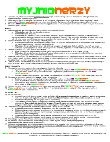 Myjnionerzy 1. 2. 3. Jesteście przyszłymi właścicielami jednostanowiskowej myjni samochodowej w mieście Biznesowice. Waszym celem jest wypracowanie jak największego zysku. W tej chwili posiadacie tylko plac z budynkiem, w którym można zainstalować myjnię. Plac jest w dobrej lokalizacji – obok supermarketu. Każdy z pięciu zespołów ma plac w innej dzielnicy Biznesowic, ale o identycznym potencjale rynkowym. Macie też 1000 Miliocentów (to lokalna waluta) pożyczone od inkubatora przedsiębiorczości. Od tej kwoty nie musicie na szczęście płacić odsetek. RYNEK 4. W Biznesowicach jest 1200 właścicieli samochodów, korzystających z myjni. a. 400 osób korzysta tylko z myjni automatycznej, b. 300 osób korzysta z ręcznej, c. 500 osób nie ma preferencji co do rodzaju myjni ani ceny – wybiera myjnię najbliższą od domu, w swojej dzielnicy. Biznesowiczanie są dobrze zorganizowanymi i lojalnymi klientami. Wszyscy myją samochód dokładnie 12 razy w roku, przez cały rok w tej samej myjni. Dlatego zawsze na początku roku kupują karnet na 12 myć, który starcza im na cały rok. 5. Spośród 400 osób, które myją auta w myjni automatycznej: a. 200 osób wybiera myjnię najtańszą bez względu na to, czy myje ona podwozie czy nie (czyli wybierze ofertę zespołu, który ma myjnię automatyczną i zaoferuje najniższą cenę). b. 100 osób wybiera najtańszą z myjni, w której istnieje usługa mycia podwozia. Jednak jeśli kilka myjni oferuje mycie podwozia, wybierają tą tańszą. Jeżeli takiej myjni nie ma na rynku, wybierają po prostu najtańszą myjnię automatyczną. 6. Spośród 300 osób, który myją auta w myjni ręcznej: a. 200 wybiera myjnię najtańszą bez względu na to, czy oferuje ona czyszczenie wnętrza auta, czy nie b. 100 osób wybiera najtańszą z myjni, która oferujące też czyszczenie wnętrza samochodu. Jeżeli takiej myjni nie ma na rynku, wybierają po prostu najtańszą myjnię ręczną. 7. W każdej dzielnicy jest 100 mieszkańców, którzy wybierają myjnię najbliższą domu (ze swojej dzielnicy), bez względu na ceny, rodzaj myjni i zakres usług. Jest jeden wyjątek. Jeżeli myjnia w ich dzielnicy jest droższa niż 15 Miliocentów za karnet, wtedy oni uznają to za „zdzierstwo” i w ogóle rezygnują z mycia swoich aut. 8. Jeżeli w mieście nie ma żadnej myjni automatycznej, to klienci szukający automatycznej jadą do innego miasta (nie przechodzą do myjni ręcznych). Analogicznie dzieje się z klientami myjni ręcznych – nie idą do automatycznej. ZAKUPY I KOSZTY 9. Wymagania techniczne wobec myjni automatycznej i koszty jej założenia: a. Myjnia automatyczna wymaga kupna MyjkoRobota, który możesz nabyć za 400 Miliocentów (to lokalna waluta). b. Do MyjkoRobota możesz dokupić moduł Podwozie – będziesz mógł oferować mycie podwozia. To koszt 400 Miliocentów. c. Myjnia automatyczna potrzebuje 1 pracownika, pensja jednej osoby to 300 Miliocentów, płatne na koniec roku. 10. Wymagania techniczne wobec myjni ręcznej i koszty jej założenia: a. Założenie myjni ręcznej wymaga kupna SuperMyjki, który możesz kupić za 200 Miliocentów. b. Jeżeli chcesz oferować także czyszczenie wnętrz, należy dokupić Zestaw Czyścioszek za 100 Miliocentów. c. Myjnia ręczna musi zatrudniać 2 pracowników, jeśli oferuje samo mycie, a 4 jeśli także czyszczenie wnętrz. Roczna pensja jednej osoby to 300 Miliocentów. 11. Tytułem czynszu, prądu, itp. ponosicie roczne koszty stałe wynoszące 300 Miliocentów, płatne na koniec roku. 12. Wasze koszty zmienne to woda i środki myjące. 12 myć (1 karnet) oznacza zużycie wody i środków myjących o wartości 1 Miliocenta, płatne na koniec roku. PRZEBIEG GRY 13. Na początku roku a. dokonacie inwestycji (kupno maszyn, płatne gotówką). Gdy wszyscy skończą zakupy, prowadzący ujawni pewne dane rynkowe: ile sprzedał MyjkoRobotów, Podwoź, SuperMyjek i Czyścioszków. Nie zdradzi jednak, kto je kupił. b. zatrudnicie ludzi (na cały rok, pensja płacona na koniec roku) c. ustalicie cenę jednego karnetu (trzymajcie w tajemnicy dopóki prowadzący jej nie ogłosi), ceny muszą być liczbami całkowitymi. Sporządźcie kartkę „ofertę” z nazwą Waszej firmy (wymyślcie ją), ceną oraz zakresem usług (ręczna z czyszczeniem, ręczna bez czyszczenia, automatyczna, automatyczna z podwoziem). Oddajcie ją prowadzącemu. 14. Teraz prowadzący powie Wam, ile karnetów sprzedaliście. Obliczy to w ten sposób: a. 100 karnetów sprzedacie na pewno, jeżeli Wasza cena jest niższa lub równa 15 b. 200 karnetów sprzedała najtańsza w mieście myjnia automatyczna, niezależnie od tego czy oferuje mycie podwozia czy nie c. 200 karnetów sprzedała najtańsza myjnia z usługą mycia podwozia, a jeżeli takowej nie ma – te zamówienia przypadają najtańszej myjni automatycznej d. 200 karnetów sprzedała najtańsza myjnia ręczna, niezależnie od tego czy oferuje czyszczenie wnętrza czy nie. e. 100 karnetów sprzedała najtańsza myjnia ręczna oferująca czyszczenie, a jeśli takowej nie ma – najtańsza ręczna. 15. Prowadzący wypłaci Wam Wasze przychody (cena karnetu razy ilość sprzedanych karnetów) 16. Po odbiorze przychodów obliczcie swoje koszty: Woda i środki myjące, Pensje, Koszty stałe (czynsz itp.). Oddajcie obliczoną sumę kosztów prowadzącemu. 17. Obliczcie swój zysk/stratę (przychody minus inwestycje opłacone na początku roku i koszty poniesione na końcu roku). Drużyna, która osiągnęła najwyższy zysk, wygrała grę, ale zwycięzcą jest też każdy zespół, który osiągnął zysk. Pamiętajcie że przy obliczaniu zysku/straty trzeba uwzględnić wszystkie koszty. Myjnionerzy © Rafał Szczepanik. Do wykorzystywania wyłącznie dla uczniów szkół publicznych i studentów uczelni wyższych, oraz na szkoleniach dla bezrobotnych, na zajęciach bezpłatnych. Inny użytek wymaga zgody autora. DRUGA RUNDA GRY Informacja i regula