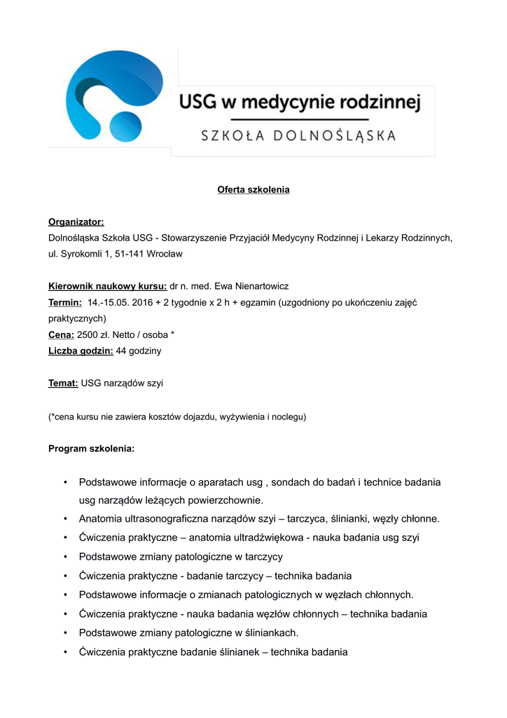 Oferta szkolenia Organizator: Dolnośląska Szkoła USG - Stowarzyszenie Przyjaciół Medycyny Rodzinnej i Lekarzy Rodzinnych, ul. Syrokomli 1, 51-141 Wrocław Kierownik naukowy kursu: dr n. med. Ewa Nienartowicz Termin: 14.-15.05. 2016 + 2 tygodnie x 2 h + egzamin (uzgodniony po ukończeniu zajęć praktycznych) Cena: 2500 zł. Netto / osoba * Liczba godzin: 44 godziny Temat: USG narządów szyi (*cena kursu nie zawiera kosztów dojazdu, wyżywienia i noclegu) Program szkolenia: • Podstawowe informacje o aparatach usg , sondach do badań i technice badania usg narządów leżących powierzchownie. • Anatomia ultrasonograficzna narządów szyi – tarczyca, ślinianki, węzły chłonne. • Ćwiczenia praktyczne – anatomia ultradźwiękowa - nauka badania usg szyi • Podstawowe zmiany patologiczne w tarczycy • Ćwiczenia praktyczne - badanie tarczycy – technika badania • Podstawowe informacje o zmianach patologicznych w węzłach chłonnych. • Ćwiczenia praktyczne - nauka badania węzłów chłonnych – technika badania • Podstawowe zmiany patologiczne w śliniankach. • Ćwiczenia praktyczne badanie ślinianek – technika badania • Nazewnictwo ultrasonograficzne, tworzenie opisu badania. Do 2 tygodni po zakończeniu szkolenia – praca z aparatami we własnym gabinecie ok 2 tygodnie pracy własnej z użyczonym aparatem w swojej Praktyce (użyczenie aparatu jest bezpłatne). Kursanci są zobowiązani przygotować w ramach pracy domowej przynajmniej 3 badania swoich własnych pacjentów zapisanych na pen-drivie wraz z opisem. Rekomendowana praca własna około 2 godziny dziennie. Spotkanie podsumowujące po okresie własnych badań, (data zostanie uzgodniona i podana) trzeci dzień szkoleniowy – Podsumowanie + egzamin