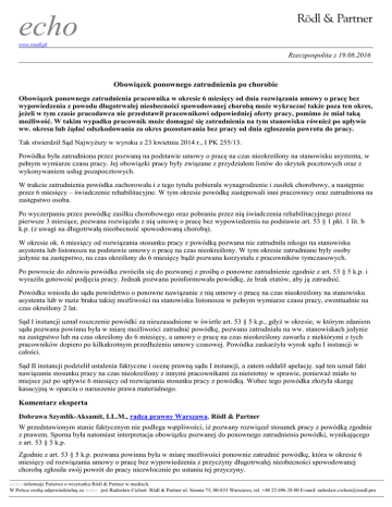 echo www.roedl.pl Rzeczpospolita z 19.08.2016 Obowiązek ponownego zatrudnienia po chorobie Obowiązek ponownego zatrudnienia pracownika w okresie 6 miesięcy od dnia rozwiązania umowy o pracę bez wypowiedzenia z powodu długotrwałej nieobecności spowodowanej chorobą może wykraczać także poza ten okres, jeżeli w tym czasie pracodawca nie przedstawił pracownikowi odpowiedniej oferty pracy, pomimo że miał taką możliwość. W takim wypadku pracownik może domagać się zatrudnienia na tym stanowisku również po upływie ww. okresu lub żądać odszkodowania za okres pozostawania bez pracy od dnia zgłoszenia powrotu do pracy. Tak stwierdził Sąd Najwyższy w wyroku z 23 kwietnia 2014 r., I PK 255/13. Powódka była zatrudniona przez pozwaną na podstawie umowy o pracę na czas nieokreślony na stanowisku asystenta, w pełnym wymiarze czasu pracy. Jej obowiązki pracy były związane z przydziałem listów do skrytek pocztowych oraz z wykonywaniem usług pozapocztowych. W trakcie zatrudnienia powódka zachorowała i z tego tytułu pobierała wynagrodzenie i zasiłek chorobowy, a następnie przez 6 miesięcy – świadczenie rehabilitacyjne. W tym okresie powódkę zastępowali inni pracownicy oraz zatrudniona na zastępstwo osoba. Po wyczerpaniu przez powódkę zasiłku chorobowego oraz pobraniu przez nią świadczenia rehabilitacyjnego przez pierwsze 3 miesiące, pozwana rozwiązała z nią umowę o pracę bez wypowiedzenia na podstawie art. 53 § 1 pkt. 1 lit. b k.p. (z uwagi na długotrwałą nieobecność spowodowaną chorobą). W okresie ok. 6 miesięcy od rozwiązania stosunku pracy z powódką pozwana nie zatrudniła nikogo na stanowisku asystenta lub listonosza na podstawie umowy o pracę na czas nieokreślony. W tym okresie zatrudniane były osoby jedynie na zastępstwo, na czas określony do 6 miesięcy bądź pozwana korzystała z pracowników tymczasowych. Po powrocie do zdrowia powódka zwróciła się do pozwanej z prośbą o ponowne zatrudnienie zgodnie z art. 53 § 5 k.p. i wyraziła gotowość podjęcia pracy. Jednak pozwana poinformowała powódkę, że brak etatów, aby ją zatrudnić. Powódka wniosła do sądu powództwo o ponowne nawiązanie z nią umowy o pracę na czas nieokreślony na stanowisku asystenta lub w razie braku takiej możliwości na stanowisku listonosza w pełnym wymiarze czasu pracy, ewentualnie na czas określony 2 lat. Sąd I instancji uznał roszczenie powódki za nieuzasadnione w świetle art. 53 § 5 k.p., gdyż w okresie, w którym zdaniem sądu pozwana powinna była w miarę możliwości zatrudnić powódkę, pozwana zatrudniała na ww. stanowiskach jedynie na zastępstwo lub na czas określony do 6 miesięcy, a umowy o pracę na czas nieokreślony zawarła z niektórymi z tych pracowników dopiero po kilkakrotnym przedłużeniu umowy czasowej. Powódka zaskarżyła wyrok sądu I instancji w całości. Sąd II instancji podzielił ustalenia faktyczne i ocenę prawną sądu I instancji, a zatem oddalił apelację. sąd ten uznał fakt nawiązania stosunku pracy na czas nieokreślony z innymi pracownikami za nieistotny w sprawie, ponieważ miało to miejsce już po upływie 6 miesięcy od rozwiązania stosunku pracy z powódką. Wobec tego powódka złożyła skargę kasacyjną w oparciu o naruszenie prawa materialnego. Komentarz eksperta Dobrawa Szymlik-Aksamit, LL.M., radca prawny Warszawa, Rödl & Partner W przedstawionym stanie faktycznym nie podlega wątpliwości, iż pozwany rozwiązał stosunek pracy z powódką zgodnie z prawem. Sporna była natomiast interpretacja obowiązku pozwanej do ponownego zatrudnienia powódki, wynikającego z art. 53 § 5 k.p. Zgodnie z art. 53 § 5 k.p. pozwana powinna była w miarę możliwości ponownie zatrudnić powódkę, która w okresie 6 miesięcy od rozwiązania umowy o pracę bez wypowiedzenia z przyczyny długotrwałej nieobecności spowodowanej chorobą zgłosiła swój powrót do pracy niezwłocznie po ustaniu tej przyczyny. echo informuje Państwa o wizerunku Rödl & Partner w mediach. W Polsce osobą odpowiedzialną za echo jest Radosław Cichoń Rödl & Partner ul. Sienna 73, 00-833 Warszawa, tel. +48 22 696 28 00 E-mail: [email protected] Po pierwsze dyskusyjne było, co oznacza, że pozwana powinna była w miarę możliwości ponownie zatrudnić powódkę? Zgodnie z linią orzeczniczą Sądu Najwyższego oznacza to obowiązek zatrudnienia powódki na podstawie nowego stosunku pracy, jeżeli pozwana dysponowała wolnymi miejscami pracy, a powódka miała kwalifikacje niezbędne do podjęcia wolnej pracy i jej stan zdrowia umożliwiał podjęcie zatrudnienia. Nie musiała to być praca na poprzednich warunkach, tj. m.in. na tym samym stanowisku i za niemniejszym wynagrodzeniem. Z tego obowiązku pozwaną zwolniłby jedynie brak odpowiedniego stanowiska pracy lub odrzucenie przez powódkę oferty takiej pracy. Zgodnie z rozkładem ciężaru dowodu, powódka udowodniła, że w trakcie jej nieobecności oraz po zgłoszeniu przez nią powrotu do pracy pozwana zatrudniała inne osoby do pracy, którą z uwagi na kwalifikacje i stan zdrowia mogła wykonywać powódka. Ponadto okoliczność, iż pozwana korzystała z pracowników tymczasowych oraz zatrudniała kolejne osoby na zastępstwo czy czas określony, a następnie na czas nieokreślony, świadczyła o stałości zapotrzebowania pozwanej na pracę, którą mogła wykonywać powódka i to będąc zatrudniona na czas nieokreślony (nieistotne w kwestii ustalenia stałości zapotrzebowania na ww. pracę jest to, że praca odpowiednia dla powódki była świadczona na innej podstawie prawnej niż na umowie o pracę na czas nieokreślony). Prócz tego sama pozwana nie wykazała, że praca ta była nieodpowiednia dla powódki ze względu na jej kwalifikacje i stan zdrowia. Po drugie kontrowersyjny był także okres, w którym pozwana była związana obowiązkiem ponownego zatrudnienia powódki. Zgodnie z art. 53 § 5 k.p. obowiązek pon