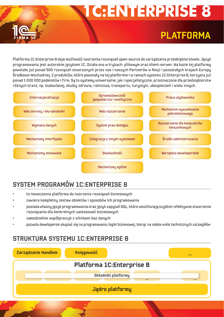 Platforma 1C:Enterprise 8 daje mo˝liwoÊç tworzenia rozwiàzaƒ open-source do zarzàdzania przedsi´biorstwem. J´zyk programowania jest autorskim j´zykiem 1C. Dzia∏a ona w trybach: plikowym oraz klient-serwer. Na bazie tej platformy powsta∏o ju˝ ponad 500 rozwiàzaƒ stworzonych przez nas i naszych Partnerów w Rosji i pozosta∏ych krajach Europy Ârodkowo-Wschodniej. Z produktów, które powsta∏y na tej platformie i w ramach systemu 1C:Enterprise 8, korzysta ju˝ ponad 1 000 000 podmiotów i firm. Sà to systemy uniwersalne, jak i specjalistyczne, przeznaczone dla przedsi´biorstw ró˝nych bran˝, np. budowlanej, s∏u˝by zdrowia, rolnictwa, transportu, turystyki, ubezpieczeƒ i wielu innych. *OUFSOBDKPOBMJ[BDKB 4QSBXP[EBXD[P¡¾ HPTQPEBSD[BJBOBMJUZD[OB 1SBDBVäZULPXOJLB 8FCTFSXJTZJ8TPEOP¡OJLJ 8FCSP[T[FS[FOJF .FDIBOJ[NXZT[VLJXBOJB QFïOPUFLTUPXFHP 8ZNJBOBEBOZDI 4ZTUFNQSBXEPTUQV 3P[T[FS[FOJFEMBLPNQVUFSÊX LJFT[POLPXZDI .FDIBOJ[NZJOUFSGFKTÊX *OUFHSBDKB[JOOZNJTZTUFNBNJ SPELJBENJOJTUSPXBOJB .FDIBOJ[NZTUPTPXBOF 4LBMPXBMOP¡¾ /BS[E[JBEFXFMPQFSTLJF .FDIBOJ[NZPHÊMOF SYSTEM PROGRAMÓW 1C:ENTERPRISE 8 • to nowoczesna platforma do tworzenia rozwiàzaƒ biznesowych • zawiera kompletny zestaw obiektów i sposobów ich programowania • posiada w∏asny j´zyk programowania oraz j´zyk zapytaƒ SQL, które umo˝liwiajà szybkie i efektywne stworzenie rozwiàzania dla konkretnych zastosowaƒ biznesowych • samodzielnie wspó∏pracuje z silnikami baz danych • pozwala deweloperom skupiaç si´ na programowaniu logiki biznesowej, bioràc na siebie wiele technicznych szczegó∏ów STRUKTURA SYSTEMU 1C:ENTERPRISE 8 ;BS[·E[BOJF)BOEMFN ,TJHPXP¡¾ 1MBUGPSNB$&OUFSQSJTF 4LïBEOJLJQMBUGPSNZ +·ESPQMBUGPSNZ INTERNACJONALIZACJA MECHANIZMY STOSOWANE Ciàgi znaków utrzymywane sà w formacie Unicode. Wyklucza to problemy z kodowaniem podczas pracy w systemie. Na poziomie technologicznej platformy wspierane sà narodowe standardy przedstawiania dat, liczb itp. Mechanizmy internacjonalizacji umo˝liwiajà u˝ywanie ró˝nych j´zyków interfejsów podczas tworzenia rozwiàzaƒ, jak i podczas pracy u˝ytkowników. Wykorzystane sà narz´dzia wspomagajàce skuteczne przet∏umaczenie interfejsu rozwiàzania na inny j´zyk. Jednà z g∏ównych podstaw systemu 1C:Enterprise 8, jest standaryzacja technologii tworzenia rozwiàzaƒ biznesowych. Jest to mo˝liwe dzi´ki temu, ˝e rozwiàzania tworzone sà w poj´ciach problemowo zorientowanych obiektów. Ich zestaw jest zdefiniowany na poziomie platformy. Katalogi przeznaczone sà do opisywania takich obiektów jak: towary, kontrahenci, waluty itp. Mogà byç zwyk∏e, hierarchiczne albo podporzàdkowane. Dokumenty wspomagajà opisanie takich poj´ç jak: faktury, WZ, zamówienia, itp. Podczas ich zatwierdzania odzwierciedlajà si´ w rejestrach ewidencji. System zawiera rejestry akumulacji, informacji, ksi´gowoÊci i obliczeƒ. WÊród innych mechanizmów stosowanych warto wymieniç: plan kont, procesy biznesowe, zadania oraz kryteria filtrowania. WEB-SERWISY I WS-ODNOÂNIKI System 1C:Enterprise 8 mo˝e byç dostawcà web-serwisów, tak samo jak i u˝ytkownikiem web-serwisów, dostarczanych przez innych dostawców. SPRAWOZDAWCZOÂå GOSPODARCZA I ANALITYCZNA Posiada elastycznoÊç wszelkich selekcji, grupowania i podsumowania oraz wysokà wydajnoÊç. Umo˝liwia tworzenie raportów przez u˝ytkownika bez wsparcia programistycznego, a tak˝e daje mo˝liwoÊç uszczegó∏owiania danych (drill-down). „System Komponowania Danych” to specjalistyczny obiekt, który pomaga tworzyç raporty po stronie programistycznej oraz pozwala uk∏adaç wybrane dane w formach tabeli, tabeli krzy˝owej, tabeli przystawnej oraz wykresu. Schemat geograficzny daje mo˝liwoÊç uk∏adania raportów na mapie. Mechanizm analizy danych (data mining) i prognozowania wspomaga wyszukiwanie kojarzeƒ, analiz´ klasterowà i inne skomplikowane wyliczenia na du˝ych wartoÊciach danych. MECHANIZMY INTERFEJSÓW W∏asny system okienkowy jest zorientowany na zapewnienie ergonomii i skutecznoÊci pracy w aplikacjach biznesowych. System zawiera kompletny zestaw elementów nawigacyjnych. Mechanizm stylów pozwala na tworzenie interfejsu aplikacji u∏atwiajàcej ciàg∏à prac´ przed komputerem. Zestaw menu mo˝na dostosowywaç do poszczególnych roli u˝ytkowników, co u∏atwia dost´p do najwa˝niejszych funkcji. INTEGRACJA Z INNYMI SYSTEMAMI Istnieje mo˝liwoÊç integracji z dowolnymi programami zewn´trznymi i sprz´tem na podstawie ogólnouznanych otwartych standardów i protoko∏ów przekazu danych. XML E-MAIL HTTP COM CONNECTION HTML NARZ¢DZIA INTEGRACJI KOMPONENTY ZEWN¢TRZNE ACTIVE X AUTOMATION KLIENT AUTOMATION SERWER TXT PROCESY BIZNESOWE Umo˝liwiajà tworzenie opisów kolejnoÊci zadaƒ do wykonania przez pracownika firmy w konkretnym momencie. Przyk∏adem mo˝e byç proces sprzeda˝y towaru przedstawiony jako kolejnoÊç utworzenia zamówienia, jego zatwierdzenia, wydania towaru z magazynu i otrzymania zap∏aty. W ka˝dym przedziale czasowym istnieje mo˝liwoÊç ustalenia aktualnego etapu sprzeda˝y oraz pracowników, którzy powinni wykonywaç okreÊlone czynnoÊci. Procesy biznesowe dajà u˝ytkownikom zupe∏nie inne spojrzenie na prac´, którà wykonujà, majà jasno i zrozumiale okreÊlonà list´ zadaƒ. DBF Start Zamówienie KIEROWNIK DZIA¸U SPRZEDA˚Y Czy rabat jest powy˝ej rabatu standardowego TAK Akceptacja zamówienia TAK Czy jest akceptacja? NIE KP NIE FAKTURA VAT Poprawne zakoƒczenie Cofni´cie WYMIANA DANYCH NARZ¢DZIA DEWELOPERSKIE Wymiana danych w systemie 1C:Enterprise 8 realizuje si´ dzi´ki stosowaniu wielu specjalistycznych narz´dzi i obiektów. Pozwala to zapewniç elastycznoÊç mechanizmów wymiany i ukierunkowaç je na rozwiàzanie jak najszerszego zakresu zadaƒ. System jest dostosowany do skutecznego u˝ywania plików formatu XML do wymiany danych. Okna redagowania obiektów oraz paleta w∏aÊciwoÊci zapewniajà dok∏a