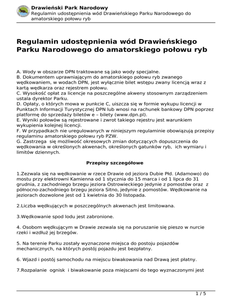 Drawieński Park Narodowy Regulamin udostępnienia wód Drawieńskiego Parku Narodowego do amatorskiego połowu ryb Regulamin udostępnienia wód Drawieńskiego Parku Narodowego do amatorskiego połowu ryb A. Wody w obszarze DPN traktowane są jako wody specjalne. B. Dokumentem uprawniającym do amatorskiego połowu ryb zwanego wędkowaniem, w wodach DPN, jest wyłącznie bilet wstępu zwany licencją wraz z kartą wędkarza oraz rejestrem połowu. C. Wysokość opłat za licencje na poszczególne akweny stosownym zarządzeniem ustala dyrektor Parku. D. Opłaty, o których mowa w punkcie C, uiszcza się w formie wykupu licencji w Punktach Informacji Turystycznej DPN lub wnosi na rachunek bankowy DPN poprzez platformę do sprzedaży biletów e – bilety (www.dpn.pl). E. Wyniki połowów są rejestrowane i zwrot takiego rejestru jest warunkiem wykupienia kolejnej licencji. F. W przypadkach nie uregulowanych w niniejszym regulaminie obowiązują przepisy regulaminu amatorskiego połowu ryb PZW. G. Zastrzega się możliwość okresowych zmian dotyczących dopuszczenia do wędkowania w określonych akwenach, określonych gatunków ryb, ich wymiaru i limitów dziennych. Przepisy szczegółowe 1.Zezwala się na wędkowanie w rzece Drawie od jeziora Dubie Płd. (Adamowo) do mostu przy elektrowni Kamienna od 1 stycznia do 15 marca i od 1 lipca do 31 grudnia, z zachodniego brzegu jeziora Ostrowieckiego jedynie z pomostów oraz z północno-zachodniego brzegu jeziora Sitno, jedynie z pomostów. Wędkowanie na jeziorach dozwolone jest od 1 kwietnia do 30 listopada. 2.Liczba wędkujących w poszczególnych akwenach jest limitowana. 3.Wędkowanie spod lodu jest zabronione. 4. Osobom wędkującym w Drawie zezwala się na poruszanie się pieszo w nurcie rzeki i wzdłuż jej brzegów. 5. Na terenie Parku zostały wyznaczone miejsca do postoju pojazdów mechanicznych, na których postój pojazdu jest bezpłatny. 6. Wjazd i postój samochodu na miejscu biwakowania nad Drawą jest płatny. 7.Rozpalanie ognisk i biwakowanie poza miejscami do tego wyznaczonymi jest 1/5 Drawieński Park Narodowy Regulamin udostępnienia wód Drawieńskiego Parku Narodowego do amatorskiego połowu ryb zabronione. 8.Wędkowanie ze sprzętu pływającego w wodach Parku jest zabronione. 9.Nie zezwala się na stosowanie jako przynęty żywych i martwych ryb. 10.Nie dopuszcza się możliwości zanęcania na jeziorach i rzece w obrębie Parku. 11.Wędkowanie i poruszanie się po terenie Parku dozwolone jest tylko w porze dziennej (od wschodu do zachodu słońca). 12.W razie wystąpienia zagrożenia pożarowego oraz po zarybieniach, istnieje możliwość zawieszenia obowiązywania wykupionych przez wędkarzy licencji i wstrzymanie sprzedaży licencji. 13.Na rzece Drawie, na całym dopuszczonym odcinku należy stosować metody połowu spinningową i muchową. Sztuczne muchy muszą być wykonane na haczykach bezzadziorowych , a kotwice pozbawione zadziorów. 14.Od wypływu Drawy z jeziora Dubie Płd. (Adamowo) do mostu w Barnimiu dopuszcza się stosowanie metody spławikowej przy użyciu wyłącznie przynęty roślinnej. 15.Łączna ilość złowionych i zabranych z Drawy ryb wymienionej grupy wynosi: 1 sztuka na dzień - łososiowate, lipień, certa, brzana, sum. 16. Nie wolno łowić lipienia od 01.01. do 15.03. 17. Zezwala się na połów metodą spinningową w rzece od 1.02 do 15.03 i od 1.07. do 30.09. 18.Samowolne budowanie kładek, pomostów oraz wykaszanie roślinności przybrzeżnej jest niedozwolone. 19.Zabrania się zaśmiecania terenu Parku. Wędkarz zobowiązany jest do utrzymania i pozostawienia porządku na stanowisku. 20.W jeziorach Ostrowieckie i Sitno: wolno stosować przynęty określone w regulaminie PZW z wyjątkiem żywych i martwych ryb. wprowadza się wymiar ochronny dla szczupaka 50 cm i limit dzienny 2 sztuki. nie obowiązują limity ilościowe połowu leszczy, płoci, krąpi. 21. Zabrania się połowu: troci jeziorowej, łososia, certy. 2/5 Drawieński Park Narodowy Regulamin udostępnienia wód Drawieńskiego Parku Narodowego do amatorskiego połowu ryb 22.W przypadku złowienia w wodach Parku karpia, karasia srebrzystego, pstrąga tęczowego, należy ryby zabrać z łowiska. 23.Nie jest dozwolone organizowanie na terenie Parku zawodów wędkarskich. 24.Połów ryb kuszą w wodach Parku jest zabroniony. 25. Dokumenty uprawniające do połowów tj. kartę wędkarza oraz aktualną licencję i rejestr połowów, należy okazywać na żądanie osób posiadających uprawnienia do kontroli, którymi są: służba DPN, Policja. 26. Naruszenie postanowień niniejszego regulaminu będzie stanowiło podstawę do pozbawienia licencji bez odszkodowania przy równoległym zastosowaniu sankcji wynikających z ustawy z dnia 18 kwietnia 1985r. o rybactwie śródlądowym wraz z aktami wykonawczymi. Regulamin wchodzi w życie z dniem 01.04.2015r. Jednocześnie traci moc Regulamin amatorskiego połowu ryb w wodach DPN z dnia 30.12.2009r. Drawno 20.03.2015 r. Zatwierdził: Dyrektor Drawieńskiego Parku Narodowego my wędkarze, jesteśmy świadomi, że łowienie ryb w parku narodowym jest specjalnym przywilejem i wymaga od wędkarza wyjątkowej dyscypliny. Potwierdzimy tę świadomość respektując wszystkie obowiązujące w DPN przepisy i składamy przyrzeczenie: 1. Łowimy tylko w 2 jeziorach Sitno i Ostrowieckie: od 1 kwietnia do 30 listopada oraz w Drawie od 1 stycznia do 15 marca i od 1 lipca do 31 grudnia od jej ujścia z j. Dubie Południowe do EW Kamienna. 2. Wędkowanie i postój samochodu na miejscu biwakowania są płatne. 3. Łowiąc w jeziorach korzystać będziemy ze specjalnie dla nas przygotowanych pomostów usytuowanych na zachodnim i 3/5 Drawieński Park Narodowy Regulamin udostępnienia wód Drawieńskiego Parku Narodowego do amatorskiego połowu ryb północno-zachodnim brzegu. 4. Nie wolno nam zanęcać, ani używać żywej ryby jako przynęty (ani na jeziorach ani na Drawie). 5. Nie dojeżdżamy na łowisk