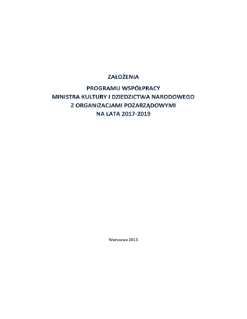 ZAŁOŻENIA PROGRAMU WSPÓŁPRACY MINISTRA KULTURY I DZIEDZICTWA NARODOWEGO Z ORGANIZACJAMI POZARZĄDOWYMI NA LATA 2017-2019 Warszawa 2015 Założenia Programu współpracy Ministerstwa Kultury i Dziedzictwa Narodowego z organizacjami pozarządowymi str. 2 Założenia Programu współpracy Ministra Kultury i Dziedzictwa Narodowego z organizacjami pozarządowymi powstały w ramach projektu pt. „Programy dla zmiany - partycypacyjne tworzenie programów współpracy z organizacjami pozarządowymi na szczeblu centralnym”, nr POKL.05.04.0200-I27/15 Zespół konsultacyjny: Weronika Czyżewska, Alina Gałązka, Alicja Gawinek, Krzysztof Guzowski, Artur Jóźwik, Magdalena Kopczyńska-Zych, Justyna Kowal, Rafał Krenz, Marzanna Krupa, Katarzyna Rybicka, Piotr Stec, Małgorzata Szeląg-Zalewska, Marek Szladowski, Aleksander Tarkowski, Artur Witkowski. Konsultant projektu: Tomasz Schimanek. Redaktor: Piotr Vagla Waglowski. Ogólnopolska Federacja Organizacji Pozarządowych ul. Strzelecka 3 lok. 12 03-433 Warszawa http://ofop.eu/ KRS: 0000 169795 NIP: 525-23-00-193 REGON: 015678615 e-mail: [email protected] tel.: + 48 22 416 40 30, fax: + 48 22 115 60 21 nr rachunku bankowego: 24 1500 1777 1217 7008 7698 0000 Założenia Programu współpracy Ministerstwa Kultury i Dziedzictwa Narodowego z organizacjami pozarządowymi str. 3 Spis treści Spis treści ..................................................................................................................................... 3 1. Wstęp ................................................................................................................................... 4 2. Diagnoza: stan obecny, szanse i ryzyka rozwoju współpracy ................................................... 6 2.1 Ramy prawne prowadzonej współpracy ......................................................................................... 6 2.1.1 Współpraca finansowa .................................................................................................... 6 2.1.2 Współpraca pozafinansowa ............................................................................................ 7 2.2 Kondycja organizacji kulturalnych ................................................................................................... 9 2.3 Najważniejsze trudności i zagrożenia w rozwoju organizacji kulturalnych ................................... 11 2.3.1 Zasoby i potencjał organizacji kulturalnych .................................................................. 11 2.3.2 Przeregulowane procedury i trudne formalności.......................................................... 12 2.3.3 Misyjność działań a tematy konkursów dotacyjnych .................................................... 12 2.3.4 Transparentność działań ............................................................................................... 12 2.4 Główne wnioski z diagnozy - badania poprzedzającego opracowanie Założeń Programu ........... 13 2.5 Uzasadnienie potrzeby przyjęcia Programu współpracy............................................................... 13 3. Cele Programu współpracy .................................................................................................. 14 3.1 Wzmocnienie partnerskiej współpracy MKiDN z organizacjami pozarządowymi (cel szczegółowy nr 1)....... 15 3.1.1 Wypracowanie zasad naboru kandydatów na członków Rady Organizacji Pozarządowych przy Ministrze KiDN, mających na celu zwiększenie reprezentatywności Rady ...... 15 3.1.2 Zadanie: Wzmocnienie komunikacji o prowadzonych przez MKiDN konsultacjach ..... 15 3.2 Poprawa komunikacji i koordynacji działań pomiędzy ciałami dialogu (cel szczegółowy nr 2) .... 18 3.2.1 Zadanie: Zwiększenie dostępności informacji dla członków ciał dialogu ...................... 18 3.2.2 Zadanie: Powołanie Pełnomocnika ds. współpracy MKiDN z organizacjami pozarządowymi……………..................................................................................................................... 18 3.3 Rozwój potencjału sektora pozarządowego (cel szczegółowy nr 3).............................................. 19 3.3.1 Zadanie: Wzmocnienie działań na rzecz sieciowania organizacji .................................. 20 3.3.2 Zadanie: Wyodrębnienie obszarów współpracy systemowej MKiDN i organizacji pozarządowych…….. ........................................................................................................................... 21 3.3.3 Zadanie: Wzmocnienie kompetencji organizacji pozarządowych koniecznych do udziału w procesie legislacyjnym oraz wypracowanie rozwiązań wzmacniających rzecznictwo ...... 21 4. Sposób monitoringu realizacji programu .............................................................................. 22 5. Dodatkowe omówienie wybranych zagadnień ..................................................................... 22 5.1 Regranting……. ............................................................................................................................... 22 5.2 „Bon na start”. ............................................................................................................................. ..23 5.3 Wkład własny….............................................................................................................................. 25 6. Podsumowanie ................................................................................................................... 26 Założenia Programu współpracy Ministerstwa Kultury i Dziedzictwa Narodowego z organizacjami pozarządowymi str. 4 1. Wstęp Dokument powstał w ramach projektu pn. „Programy dla zmiany - partycypacyjne tworzenie programów współpracy z organizacjami pozarządowymi na szczeblu centralnym”, nr POKL.05.04.0200-I27/15, współfinansowanego ze środków Europejskiego Funduszu Społecznego POKL w ramach Priorytetu V – Dob