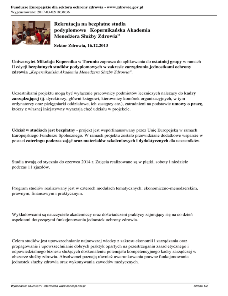Fundusze Europejskie dla sektora ochrony zdrowia - www.zdrowie.gov.pl Wygenerowano: 2017-03-02/18:38:36 Rekrutacja na bezpłatne studia podyplomowe „Kopernikańska Akademia Menedżera Służby Zdrowia” Sektor Zdrowia, 16.12.2013 Uniwersytet Mikołaja Kopernika w Toruniu zaprasza do aplikowania do ostatniej grupy w ramach II edycji bezpłatnych studiów podyplomowych w zakresie zarządzania jednostkami ochrony zdrowia „Kopernikańska Akademia Menedżera Służby Zdrowia". Uczestnikami projektu mogą być wyłącznie pracownicy podmiotów leczniczych należący do kadry zarządzającej (tj. dyrektorzy, główni księgowi, kierownicy komórek organizacyjnych, w tym ordynatorzy oraz pielęgniarki oddziałowe, ich zastępcy etc.), zatrudnieni na podstawie umowy o pracę, którzy z własnej inicjatywny wyrażają chęć udziału w projekcie. Udział w studiach jest bezpłatny - projekt jest współfinansowany przez Unię Europejską w ramach Europejskiego Funduszu Społecznego. W ramach projektu zostało przewidziane dodatkowe wsparcie w postaci cateringu podczas zajęć oraz materiałów szkoleniowych i dydaktycznych dla uczestników. Studia trwają od stycznia do czerwca 2014 r. Zajęcia realizowane są w piątki, soboty i niedziele podczas 11 zjazdów. Program studiów realizowany jest w czterech modułach tematycznych: ekonomiczno-menedżerskim, prawnym, finansowym i praktycznym. Wykładowcami są nauczyciele akademiccy oraz doświadczeni praktycy zajmujący się na co dzień aspektami dotyczącymi funkcjonowania jednostek ochrony zdrowia. Celem studiów jest upowszechnianie najnowszej wiedzy z zakresu ekonomii i zarządzania oraz propagowanie i upowszechnianie dobrych praktyk opartych na przestrzeganiu zasad etycznego i odpowiedzialnego biznesu służących doskonaleniu potencjału kompetencyjnego kadry zarządczej w obszarze służby zdrowia. Absolwenci poznają również uwarunkowania prawne funkcjonowania jednostek służby zdrowia oraz wykonywania zawodów medycznych. Wykonanie: CONCEPT Intermedia www.concept.net.pl Strona 1/2 Fundusze Europejskie dla sektora ochrony zdrowia - www.zdrowie.gov.pl Wygenerowano: 2017-03-02/18:38:36 Szczegółowe warunki rekrutacji i uczestnictwa można uzyskać na stronie internetowej projektu www.kopernikanska.umk.pl/, pod numerem telefonu (56) 611-4892 lub mailowo [email protected]. Dokumenty można składać osobiście, przesłać pocztą lub kurierem na adres: Wydział Nauk Ekonomicznych i Zarządzania (pokój 34) Uniwersytet Mikołaja Kopernika w Toruniu ul. Gagarina 13a 87-100 Toruń Wykonanie: CONCEPT Intermedia www.concept.net.pl Strona 2/2