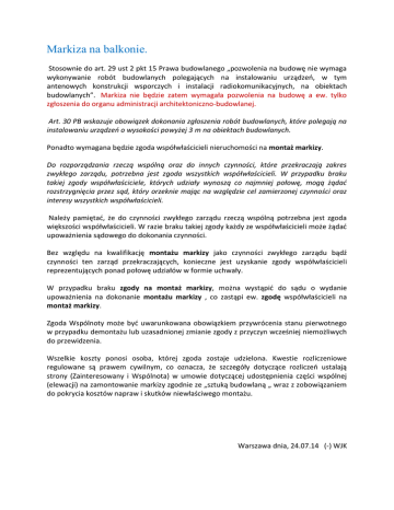 Markiza na balkonie. Stosownie do art. 29 ust 2 pkt 15 Prawa budowlanego „pozwolenia na budowę nie wymaga wykonywanie robót budowlanych polegających na instalowaniu urządzeo, w tym antenowych konstrukcji wsporczych i instalacji radiokomunikacyjnych, na obiektach budowlanych”. Markiza nie będzie zatem wymagała pozwolenia na budowę a ew. tylko zgłoszenia do organu administracji architektoniczno-budowlanej. Art. 30 PB wskazuje obowiązek dokonania zgłoszenia robót budowlanych, które polegają na instalowaniu urządzeo o wysokości powyżej 3 m na obiektach budowlanych. Ponadto wymagana będzie zgoda współwłaścicieli nieruchomości na montaż markizy. Do rozporządzania rzeczą wspólną oraz do innych czynności, które przekraczają zakres zwykłego zarządu, potrzebna jest zgoda wszystkich współwłaścicieli. W przypadku braku takiej zgody współwłaściciele, których udziały wynoszą co najmniej połowę, mogą żądad rozstrzygnięcia przez sąd, który orzeknie mając na względzie cel zamierzonej czynności oraz interesy wszystkich współwłaścicieli. Należy pamiętad, że do czynności zwykłego zarządu rzeczą wspólną potrzebna jest zgoda większości współwłaścicieli. W razie braku takiej zgody każdy ze współwłaścicieli może żądad upoważnienia sądowego do dokonania czynności. Bez względu na kwalifikację montażu markizy jako czynności zwykłego zarządu bądź czynności ten zarząd przekraczających, konieczne jest uzyskanie zgody współwłaścicieli reprezentujących ponad połowę udziałów w formie uchwały. W przypadku braku zgody na montaż markizy, można wystąpid do sądu o wydanie upoważnienia na dokonanie montażu markizy , co zastąpi ew. zgodę współwłaścicieli na montaż markizy. Zgoda Wspólnoty może byd uwarunkowana obowiązkiem przywrócenia stanu pierwotnego w przypadku demontażu lub uzasadnionej zmianie zgody z przyczyn wcześniej niemożliwych do przewidzenia. Wszelkie koszty ponosi osoba, której zgoda zostaje udzielona. Kwestie rozliczeniowe regulowane są prawem cywilnym, co oznacza, że szczegóły dotyczące rozliczeo ustalają strony (Zainteresowany i Wspólnota) w umowie dotyczącej udostępnienia części wspólnej (elewacji) na zamontowanie markizy zgodnie ze „sztuką budowlaną „ wraz z zobowiązaniem do pokrycia kosztów napraw i skutków niewłaściwego montażu. Warszawa dnia, 24.07.14 (-) WJK