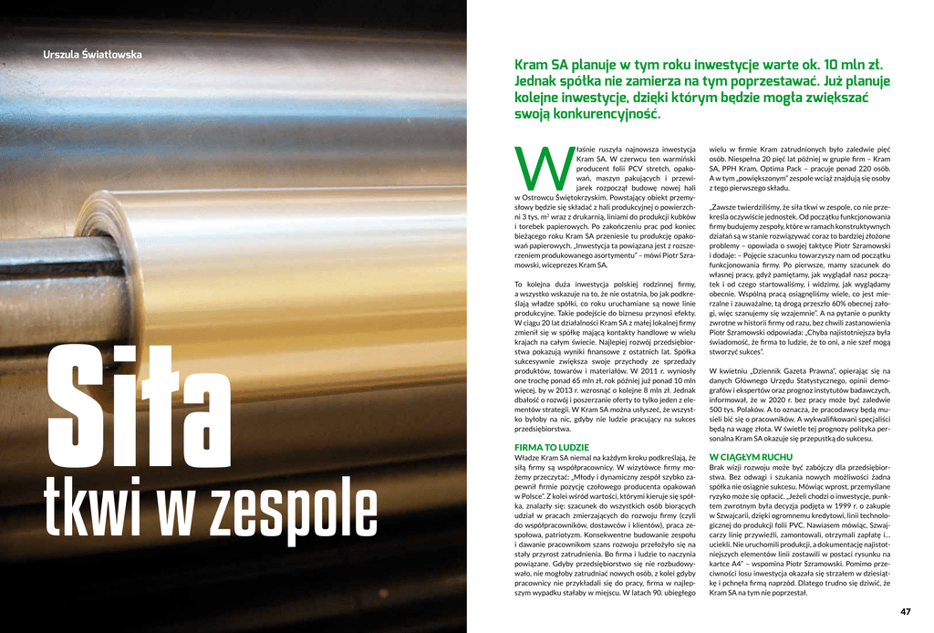 Urszula Światłowska Kram SA planuje w tym roku inwestycje warte ok. 10 mln zł. Jednak spółka nie zamierza na tym poprzestawać. Już planuje kolejne inwestycje, dzięki którym będzie mogła zwiększać swoją konkurencyjność. W łaśnie ruszyła najnowsza inwestycja Kram SA. W czerwcu ten warmiński producent folii PCV stretch, opakowań, maszyn pakujących i przewijarek rozpoczął budowę nowej hali w Ostrowcu Świętokrzyskim. Powstający obiekt przemysłowy będzie się składać z hali produkcyjnej o powierzchni 3 tys. m2 wraz z drukarnią, liniami do produkcji kubków i torebek papierowych. Po zakończeniu prac pod koniec bieżącego roku Kram SA przeniesie tu produkcję opakowań papierowych. „Inwestycja ta powiązana jest z rozszerzeniem produkowanego asortymentu” – mówi Piotr Szramowski, wiceprezes Kram SA. To kolejna duża inwestycja polskiej rodzinnej firmy, a wszystko wskazuje na to, że nie ostatnia, bo jak podkreślają władze spółki, co roku uruchamiane są nowe linie produkcyjne. Takie podejście do biznesu przynosi efekty. W ciągu 20 lat działalności Kram SA z małej lokalnej firmy zmienił się w spółkę mającą kontakty handlowe w wielu krajach na całym świecie. Najlepiej rozwój przedsiębiorstwa pokazują wyniki finansowe z ostatnich lat. Spółka sukcesywnie zwiększa swoje przychody ze sprzedaży produktów, towarów i materiałów. W 2011 r. wyniosły one trochę ponad 65 mln zł, rok później już ponad 10 mln więcej, by w 2013 r. wzrosnąć o kolejne 8 mln zł. Jednak dbałość o rozwój i poszerzanie oferty to tylko jeden z elementów strategii. W Kram SA można usłyszeć, że wszystko byłoby na nic, gdyby nie ludzie pracujący na sukces przedsiębiorstwa. Siła tkwi w zespole 46 FIRMA TO LUDZIE Władze Kram SA niemal na każdym kroku podkreślają, że siłą firmy są współpracownicy. W wizytówce firmy możemy przeczytać: „Młody i dynamiczny zespół szybko zapewnił firmie pozycję czołowego producenta opakowań w Polsce”. Z kolei wśród wartości, którymi kieruje się spółka, znalazły się: szacunek do wszystkich osób biorących udział w pracach zmierzających do rozwoju firmy (czyli do współpracowników, dostawców i klientów), praca zespołowa, patriotyzm. Konsekwentne budowanie zespołu i dawanie pracownikom szans rozwoju przełożyło się na stały przyrost zatrudnienia. Bo firma i ludzie to naczynia powiązane. Gdyby przedsiębiorstwo się nie rozbudowywało, nie mogłoby zatrudniać nowych osób, z kolei gdyby pracownicy nie przykładali się do pracy, firma w najlepszym wypadku stałaby w miejscu. W latach 90. ubiegłego nr 2/2014 wielu w firmie Kram zatrudnionych było zaledwie pięć osób. Niespełna 20 pięć lat później w grupie firm – Kram SA, PPH Kram, Optima Pack – pracuje ponad 220 osób. A w tym „powiększonym” zespole wciąż znajdują się osoby z tego pierwszego składu. „Zawsze twierdziliśmy, że siła tkwi w zespole, co nie przekreśla oczywiście jednostek. Od początku funkcjonowania firmy budujemy zespoły, które w ramach konstruktywnych działań są w stanie rozwiązywać coraz to bardziej złożone problemy – opowiada o swojej taktyce Piotr Szramowski i dodaje: – Pojęcie szacunku towarzyszy nam od początku funkcjonowania firmy. Po pierwsze, mamy szacunek do własnej pracy, gdyż pamiętamy, jak wyglądał nasz początek i od czego startowaliśmy, i widzimy, jak wyglądamy obecnie. Wspólną pracą osiągnęliśmy wiele, co jest mierzalne i zauważalne, tą drogą przeszło 60% obecnej załogi, więc szanujemy się wzajemnie”. A na pytanie o punkty zwrotne w historii firmy od razu, bez chwili zastanowienia Piotr Szramowski odpowiada: „Chyba najistotniejsza była świadomość, że firma to ludzie, że to oni, a nie szef mogą stworzyć sukces”. W kwietniu „Dziennik Gazeta Prawna”, opierając się na danych Głównego Urzędu Statystycznego, opinii demografów i ekspertów oraz prognoz instytutów badawczych, informował, że w 2020 r. bez pracy może być zaledwie 500 tys. Polaków. A to oznacza, że pracodawcy będą musieli bić się o pracowników. A wykwalifikowani specjaliści będą na wagę złota. W świetle tej prognozy polityka personalna Kram SA okazuje się przepustką do sukcesu. W CIĄGŁYM RUCHU Brak wizji rozwoju może być zabójczy dla przedsiębiorstwa. Bez odwagi i szukania nowych możliwości żadna spółka nie osiągnie sukcesu. Mówiąc wprost, przemyślane ryzyko może się opłacić. „Jeżeli chodzi o inwestycje, punktem zwrotnym była decyzja podjęta w 1999 r. o zakupie w Szwajcarii, dzięki ogromnemu kredytowi, linii technologicznej do produkcji folii PVC. Nawiasem mówiąc, Szwajcarzy linię przywieźli, zamontowali, otrzymali zapłatę i… uciekli. Nie uruchomili produkcji, a dokumentację najistotniejszych elementów linii zostawili w postaci rysunku na kartce A4” – wspomina Piotr Szramowski. Pomimo przeciwności losu inwestycja okazała się strzałem w dziesiątkę i pchnęła firmą naprzód. Dlatego trudno się dziwić, że Kram SA na tym nie poprzestał. 47 Przychody netto ze sprzedaży produktów, towarów i materiałów: 2011 r. 65 124 007,63 2012 r. 75 438 689,27 2013 r. 83 596 865,30 I kwartał 2014 r. 21 214 863,96 Zysk ze sprzedaży: 2011 r. 3 351 507,11 2012 r. 5 656 790,80 2013 r. 6 172 389,99 I kwartał 2014 r. 1 361 345,94 Zysk za rok brutto: 2011 r. 2 727 251,75 2012 r. 5 301 655,37 2013 r. 5 051 725,49 I kwartał 2014 r. 1 207 971,60 Zysk za rok netto: 2011 r. 2 057 682,75 2012 r. 4 177 302,37 2013 r. 4 110 331,49 I kwartał 2014 r. 934 519,60 „Kolejną kluczową inwestycją była budowa centrum logistycznego w Pasłęku. Dzięki niej jesteśmy w stanie jeszcze szybciej realizować zamówienia klientów. Na pewno inwestycja ta wpłynęła na komfort pracy wewnątrzzakładowej – centrum logistyczne służy wszystkim trzem zakładom produkcyjnym. W tym roku zwiększyliśmy również możliwo